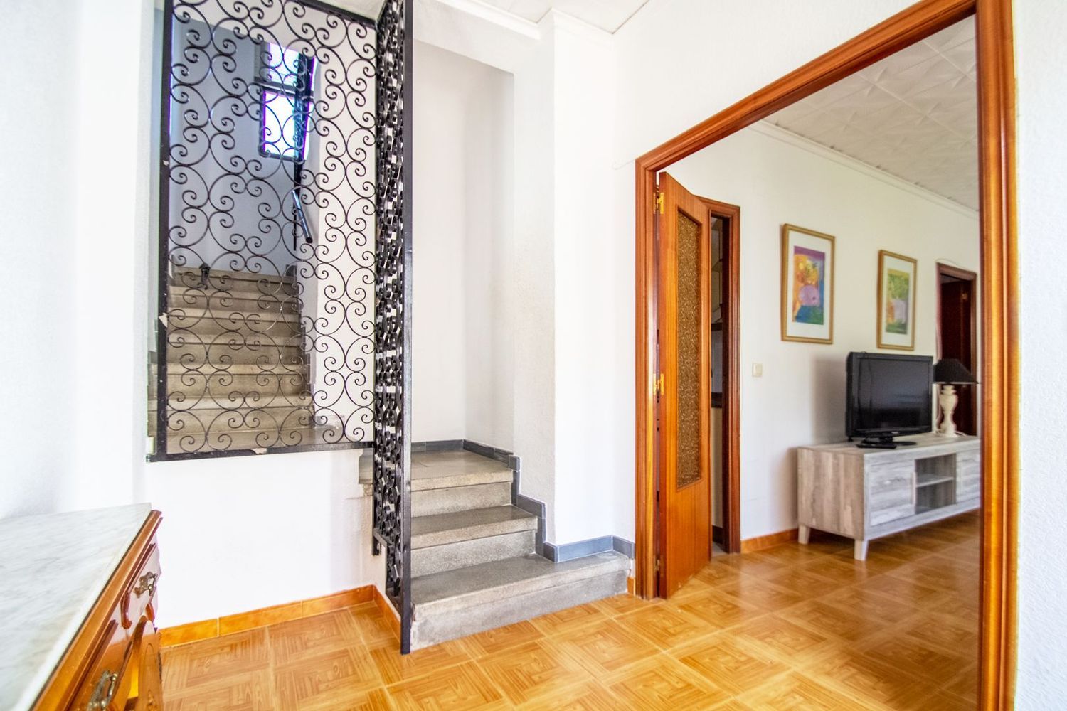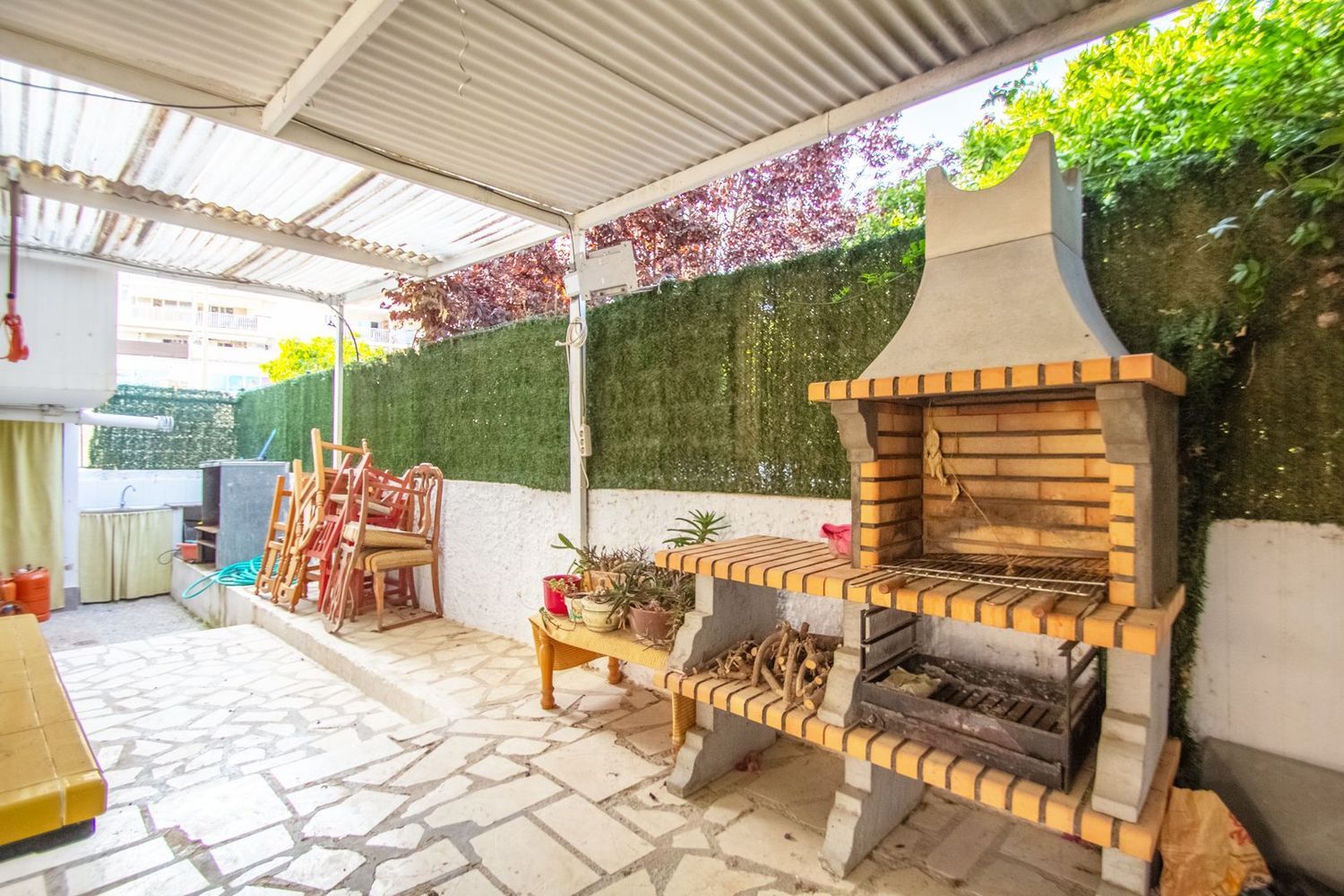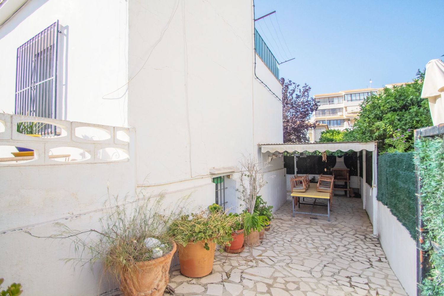 En el nivel semisótano, se encuentra un apartamento de invitados que cuenta con su propio salón, cocina, un dormitorio y un baño, proporcionando privacidad y confort. La propiedad también cuenta con un pequeño terreno privado, donde se ha habilitado una zona de barbacoa, perfecta para reuniones familiares o con amigos, así como espacio para estacionamiento. Su ubicación permite disfrutar de la cercanía a diversas comodidades y servicios en la zona.
