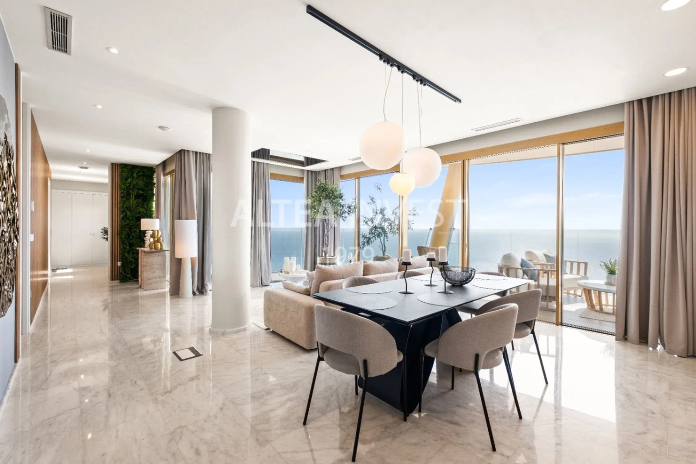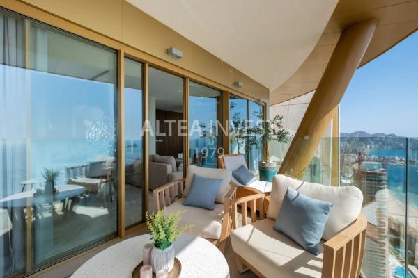Un Icono del Lujo en las Alturas del In Tempo – Benidorm Características Clave: •Excelente Ubicación: Ubicado en el piso 43 del emblemático In Tempo, símbolo indiscutible del skyline de Benidorm, este ático redefine el concepto de vivir en las alturas. Con vistas panorámicas al Mediterráneo, a la bahía y a las montañas, ofrece una perspectiva inigualable de la Costa Blanca. •Diseño contemporáneo y elegancia funcional: Completamente reformado en 2025, con una superficie construida de 171,29 m² y 114,44 m² útiles, este apartamento combina amplitud, luz natural y una distribución perfecta. La cocina americana de diseño se abre al amplio salón principal, donde las terrazas enmarcan el horizonte y bañan el espacio en luz y calma. •Tres dormitorios, tres baños y cuatro terrazas privadas: Dos orientadas al mar y dos a la montaña, creando un diálogo constante entre la naturaleza y la arquitectura. •Exclusividad y confort: Equipado con aire acondicionado integral, domótica, mobiliario contemporáneo y acabados de primera calidad. Incluye una sala de cine privada, trastero y tres plazas de aparcamiento, además de un espacio de almacenamiento adicional en planta baja. •Servicios de resort y seguridad total: El In Tempo ofrece un universo de comodidades reservadas para sus residentes: piscina infinita en la azotea, spa con sauna y cabinas de masaje, gimnasio profesional, piscinas exteriores, restaurante, bar panorámico, espacios de coworking y seguridad 24 horas. Las cuotas comunitarias (500 €/mes) incluyen todos los servicios esenciales, incluida la recogida de residuos. •Conectividad perfecta: A tan solo 500 metros del mar, a 35 minutos del Aeropuerto Internacional de Alicante y a 90 minutos de Valencia. Descripción Detallada Vivir en el In Tempo es habitar una obra maestra arquitectónica, donde la innovación y el diseño se elevan a 198 metros sobre el Mediterráneo. Este exclusivo apartamento, situado en el piso 43, invita a experimentar el lujo desde una nueva perspectiva: la de quien contempla el mundo desde las nubes. Cada estancia está concebida para capturar la luz y el paisaje, con amplios ventanales que se abren al azul infinito del mar o al perfil montañoso del Puig Campana. La atmósfera interior combina sofisticación y serenidad, con materiales de alta gama, tecnología inteligente y un estilo contemporáneo que equilibra confort y estética. Las zonas comunes del edificio son, sencillamente, incomparables: desde su sky pool en la azotea hasta su spa de diseño y los espacios sociales y de ocio, todo está orientado a ofrecer una experiencia de vida similar a la de un resort cinco estrellas, pero con la privacidad de un hogar en las alturas. Más que un apartamento, es un símbolo. Un lugar donde la arquitectura se convierte en arte y el mar Mediterráneo en tu horizonte diario.