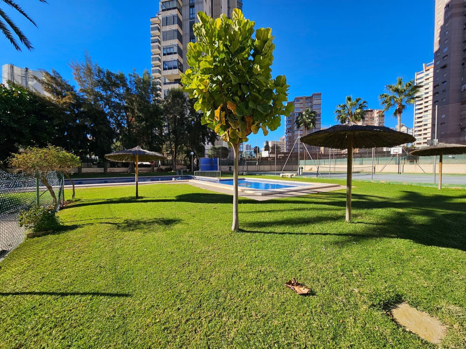 El complejo se mantiene con esmero y ofrece una magnífica piscina comunitaria, rodeada de amplias zonas para tomar el sol, un espléndido jardín con plantas mediterráneas, y áreas para disfrutar de barbacoas, así como canchas de tenis y baloncesto. Además, incluye una plaza de aparcamiento cubierta en el precio.