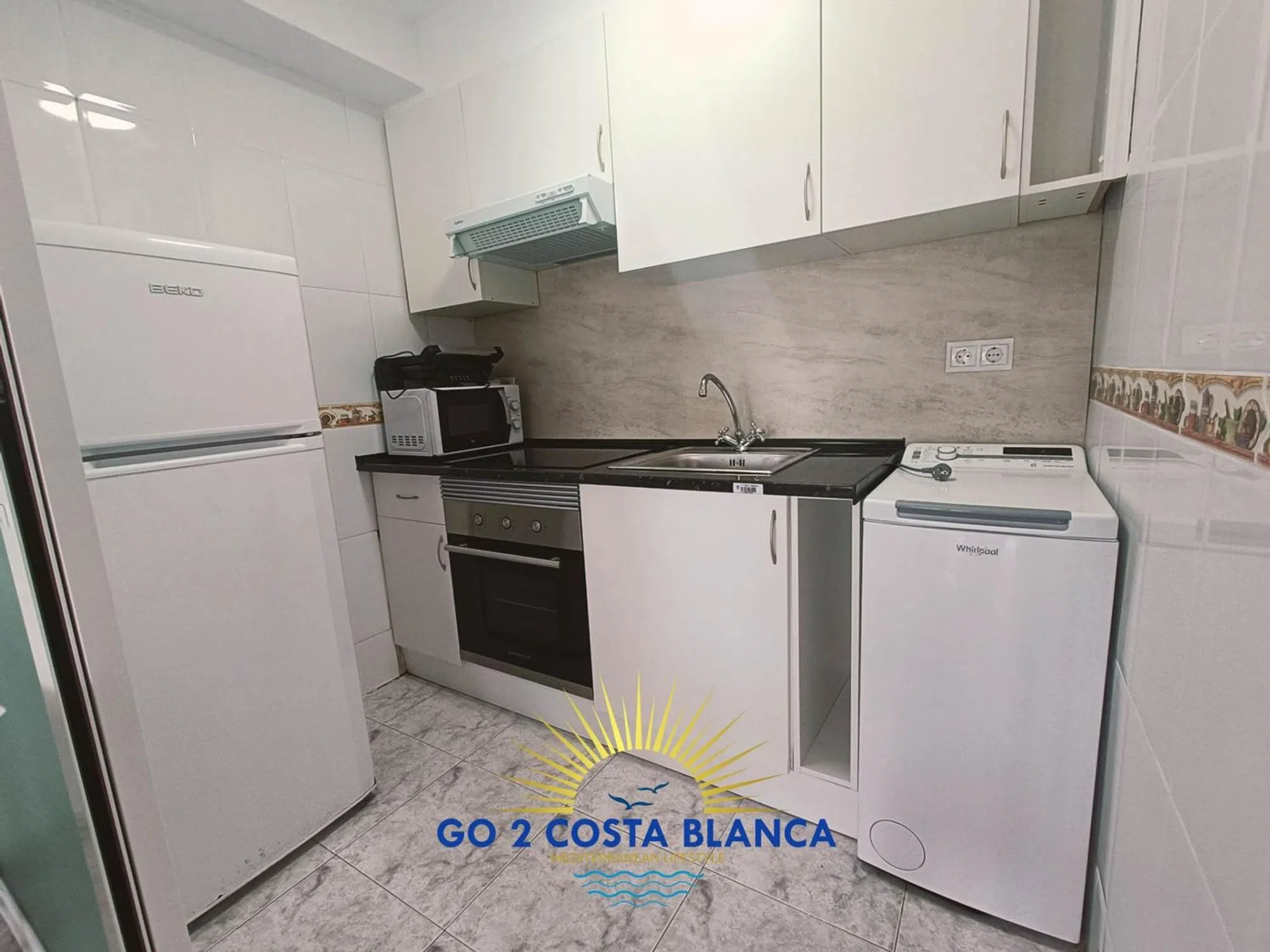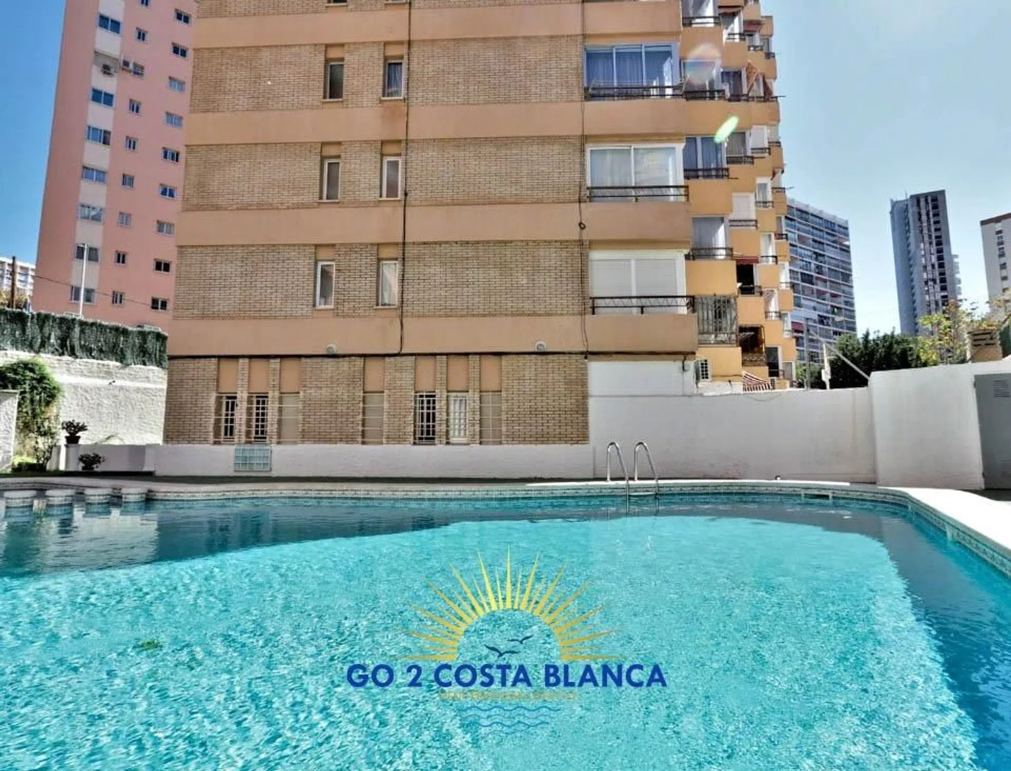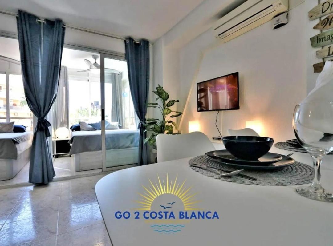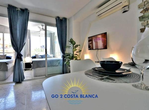 Studio en Benidorm Tower, 500 m de la playa. Zona estar con comedor más cocina nueva, totalmente equipada con horno, lavadora y nevera grande, A/C, terraza acristalada con 2 camas individuales. El edificio dispone de asensor y piscina comunitaria.