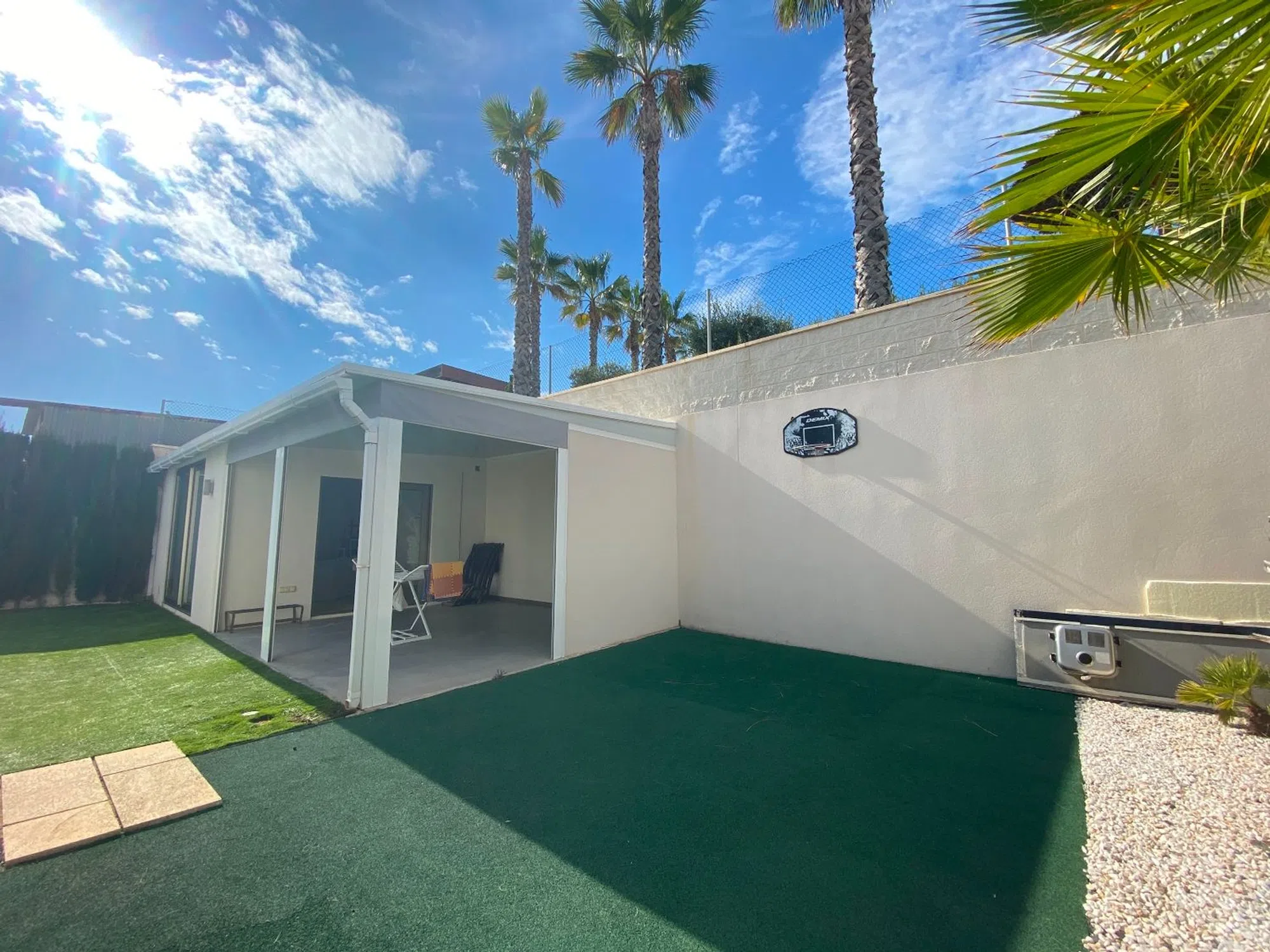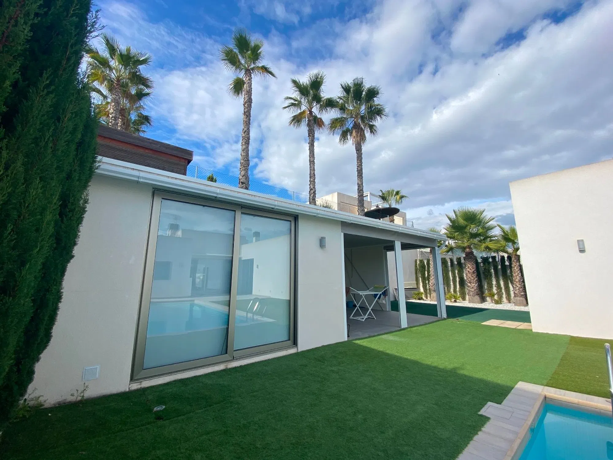Esta hermosa villa moderna se encuentra en Benijofar. A poca distancia de todos los servicios, Parque Natural Cañada Marsa, cerca del Parque Agua Quesada y del campo de golf La Marquesa en Rojales. La villa fue construida en 2006 y es de una sola planta. En el exterior hay una piscina privada (climatizada), un jardín de bajo mantenimiento, estacionamiento cubierto para dos autos, varios lugares donde tomar el sol y un gran espacio cerrado que podría transformarse en un cuarto dormitorio o un dormitorio. La casa cuenta con un amplio y luminoso salón comedor con chimenea. Una refinada cocina abierta con lavadero. Hay 3 dormitorios dobles, todos con armarios empotrados. Los 2 baños tienen calefacción por suelo radiante y toallero eléctrico y 1 tiene bañera. El dormitorio principal tiene baño en suite y vestidor. Aire acondicionado frio / calor por conductos con ambientador. Esta villa se vende completamente amueblada. Benijófar es un pueblo típico español con una variedad de servicios como panaderías, supermercados, farmacias, centro médico, minigolf, centros comerciales, bares y restaurantes. Situado a unos 30 minutos del aeropuerto de Alicante, a 15 minutos de las playas de Guardamar. Los centros comerciales La Zenia Boulevard y Habaneras también son fácilmente accesibles.