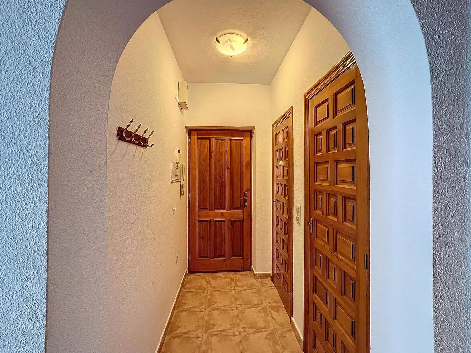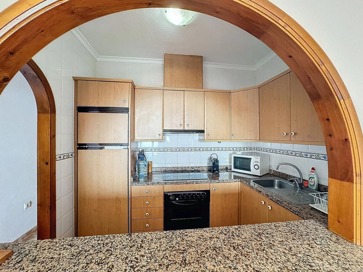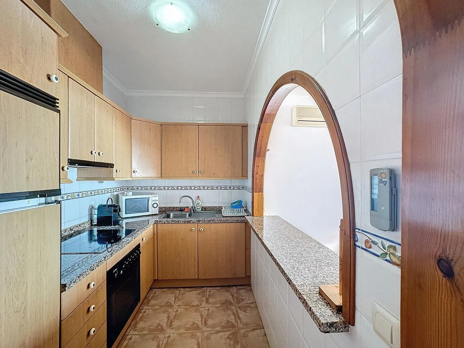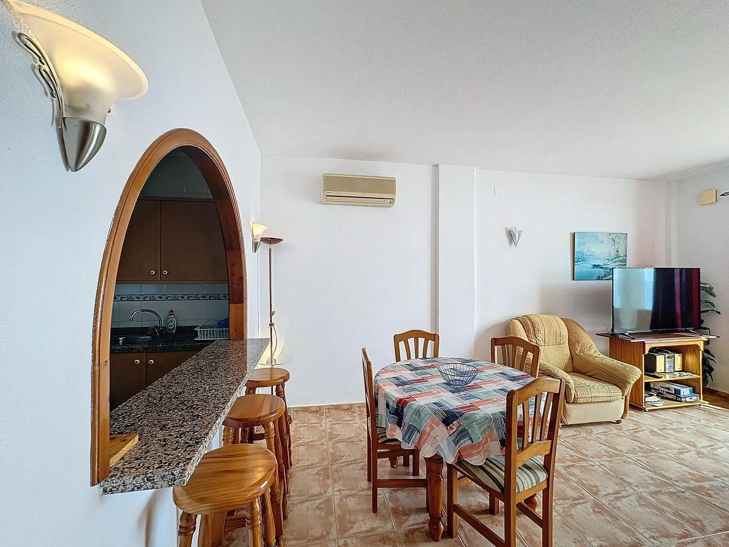 La distribución del apartamento incluye dos dormitorios dobles con armarios empotrados, perfectos para un descanso reparador, y un baño completo, totalmente equipado. La moderna cocina americana está completamente equipada y se conecta de manera fluida con el salón-comedor, que está bañado en luz natural. Además, cuenta con tres prácticos trasteros en la entrada, ofreciendo espacio adicional para almacenamiento.