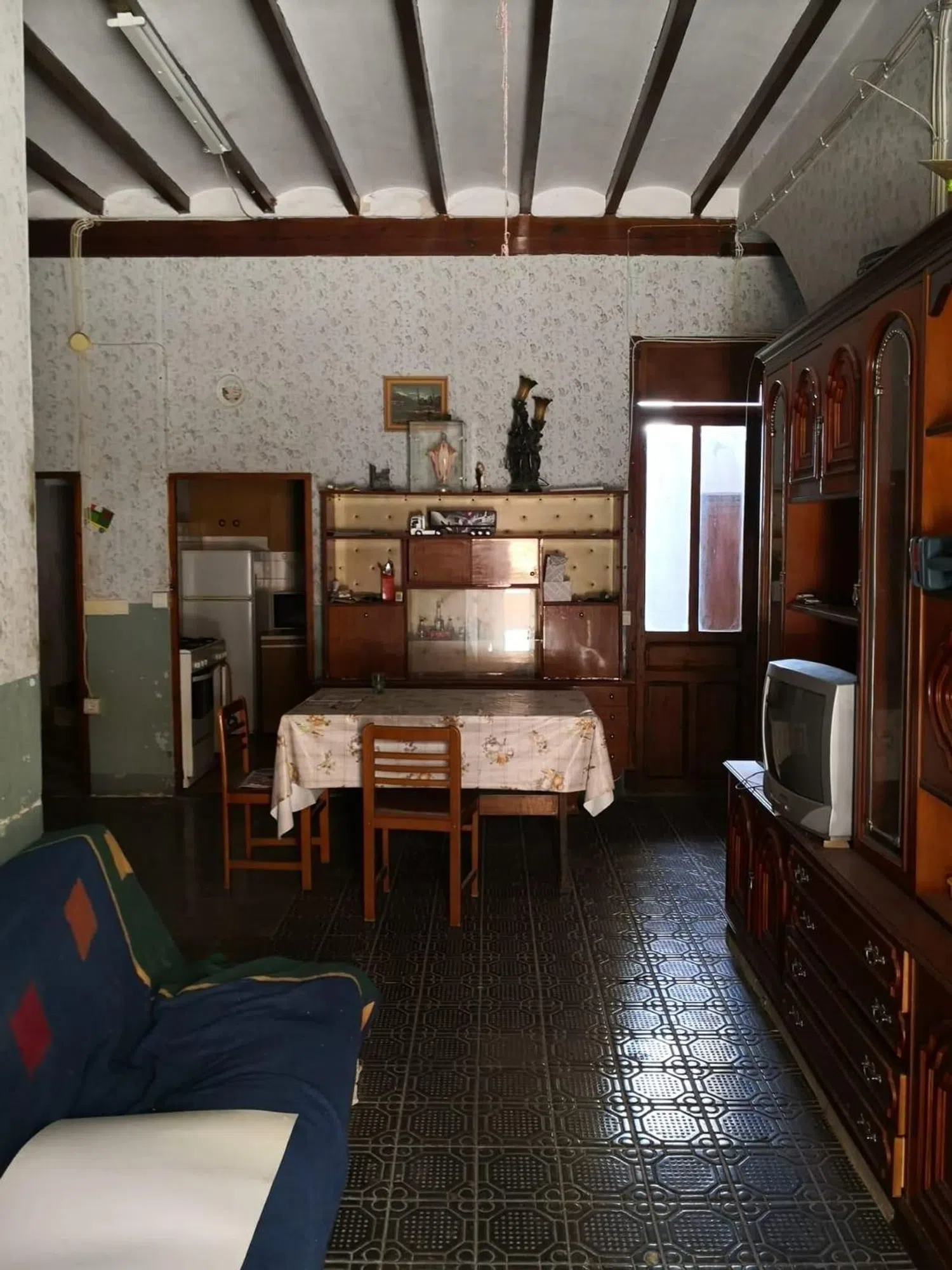El ambiente acogedor se complementa con una chimenea que añade un toque de calidez y armarios empotrados que optimizan el espacio, garantizando un hogar ordenado. Orientada hacia el este, la casa aprovecha al máximo la luz natural. Es importante destacar que requiere reforma, lo que permite al futuro propietario personalizarla a su gusto.
