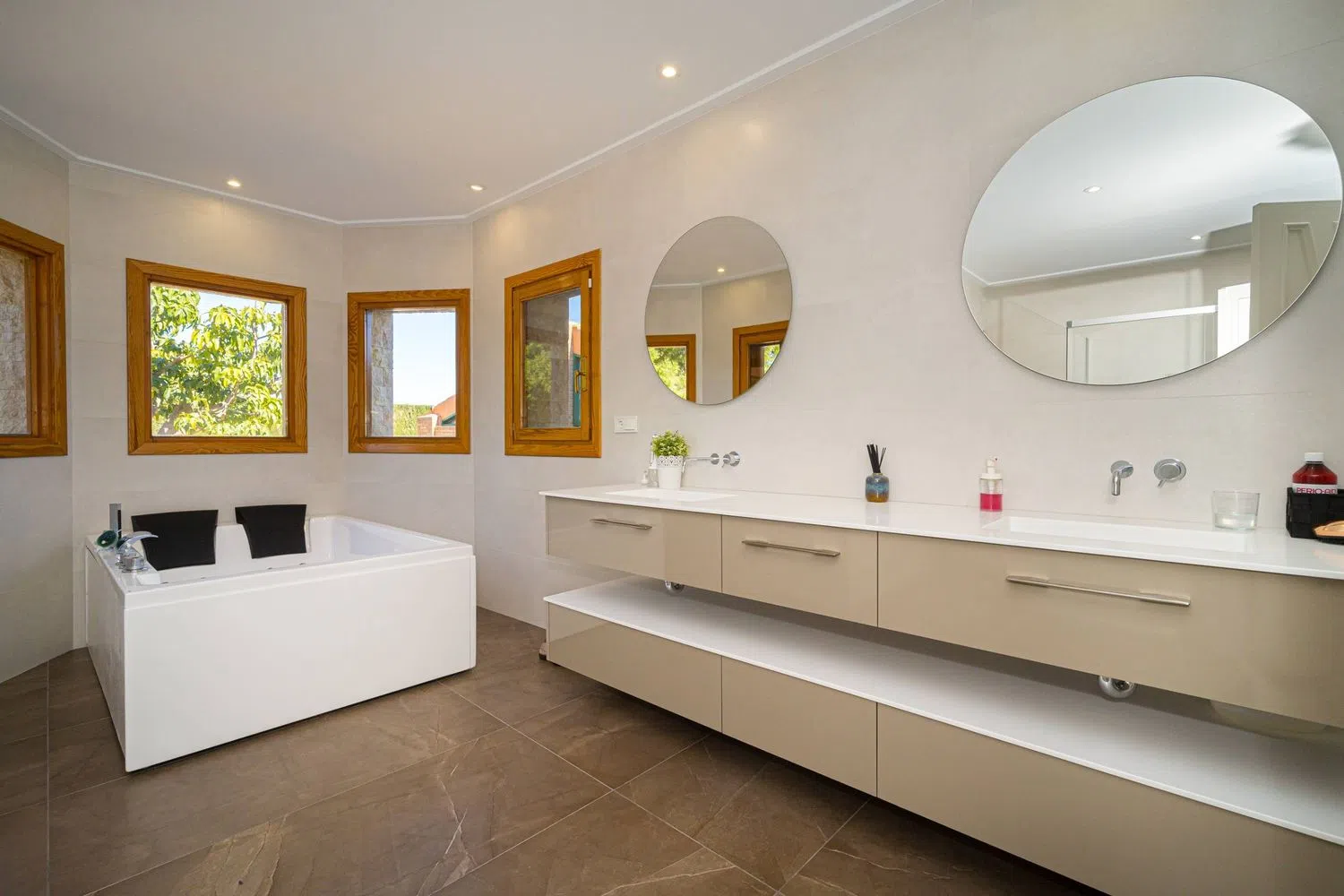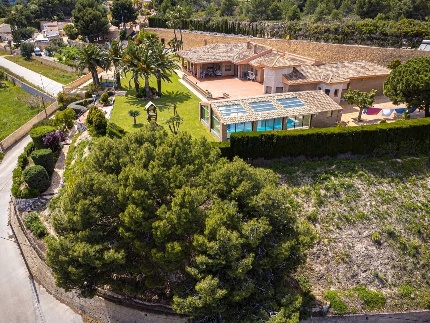 La propiedad, muy privada y rodeada de altos muros de piedra, dispone de un amplio aparcamiento que alberga más de seis vehículos, al que se accede mediante una puerta eléctrica. En la entrada, un porche nos da paso a un espacioso recibidor. A la derecha, encontramos un enorme salón comedor de casi 80 m², con varias salidas al porche frontal y a una gran terraza lateral. A la izquierda del recibidor, un pasillo nos lleva a la cocina completamente equipada, que incluye una isla central y una zona de comedor. También hay un aseo de cortesía, un despacho que puede convertirse en un dormitorio y tres dormitorios dobles, todos con baños en suite y amplios armarios empotrados. Al final del corredor se halla el dormitorio principal tipo suite, que cuenta con un vestidor y un baño con ducha y bañera de hidromasaje, así como un área de estar ideal para desayunos.