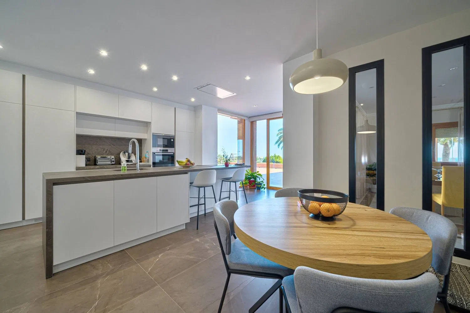 El pasillo también da acceso a un garaje para dos coches y a un pequeño taller. La villa está equipada con radiadores y aire acondicionado (sistema split frío/calor), suelos de mármol y ventanas de madera con doble acristalamiento y persianas eléctricas. Además, cuenta con un sistema de alarma para mayor seguridad.