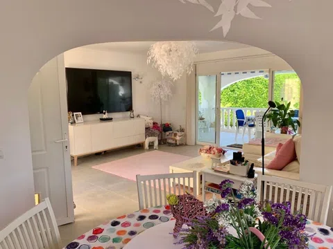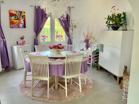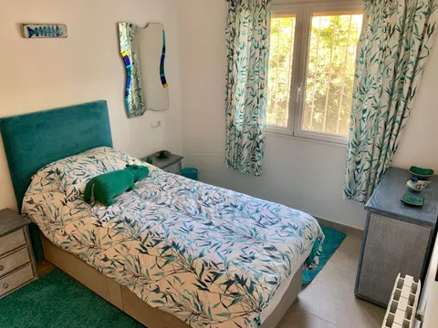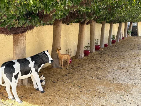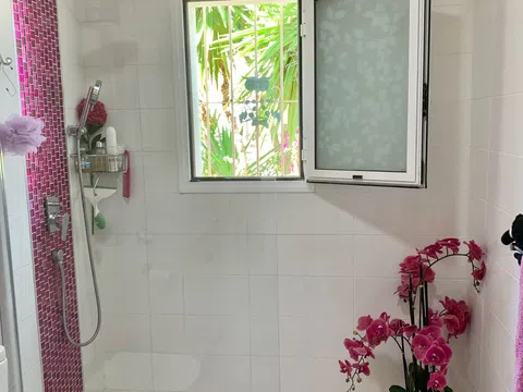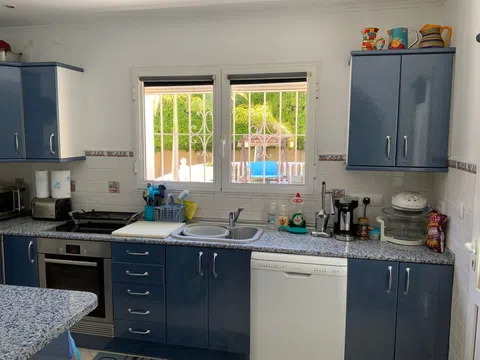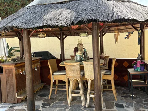 VILLA en excelente estado y con CARISMA EN PARCELA ESQUINERA Con paredes de doble hoja y suelos rebajados que la mantienen fresca en verano y cálida en invierno. UBICACIÓN PRIVILEGIADA, TRANQUILA, DE ALTA GAMA La casa, recientemente reformada, se encuentra en una zona residencial tranquila, a poca distancia de la playa y a pocos minutos de supermercados, tiendas, bares, gasolinera y restaurantes. Está lista para entrar a vivir. ATRIBUTOS CLAVE Está diseñada en dos niveles autosuficientes, ambos con aire acondicionado y entradas independientes. El almacenamiento interior incluye 7 armarios dobles y 2 individuales, una unidad de estanterías ajustables de suelo a techo ideal para libros o zapatos y una gran área junto al lavadero que podría convertirse en un dormitorio adicional. Al entrar por la puerta principal, hay un hermoso jardín bien presentado y de fácil mantenimiento. La casa es luminosa, espaciosa y moderna, con una sala de estar de planta abierta, que es el corazón del hogar. Todas las ventanas dan a zonas verdes. Junto a ella hay un arco que conduce a un maravilloso y aireado comedor circular. La cocina semiabierta incorpora una barra de desayuno, un frigorífico/congelador americano y tomas para lavavajillas y lavadora/secadora. Ha sido totalmente modernizada y cuenta con una lámpara de diamantes con ventilador integrado. El dormitorio principal tiene aire acondicionado y ventilador de techo, 3 armarios dobles, tocador y cómoda. Dispone de baño en suite con ventilador de techo, calefacción de pared, toallero calefactado y extractor de aire. Hay dos dormitorios más; uno se utiliza actualmente como oficina. El segundo baño también ha sido modernizado y equipado con electrodomésticos modernos. La terraza superior tiene prácticamente la longitud de la casa. ¡Tiene magníficas vistas a la montaña y atardeceres impresionantes! Hay ventiladores sobre una amplia zona de asientos cubierta, que da al piscina. Hay una escalera para acceder. ESPECTACULAR PLANTA BAJA EN UNA SOLA PLANTA Doble puerta eléctrica trasera que conduce a una entrada arbolada con amplio aparcamiento. Hay un garaje integrado. El amplio dormitorio principal tiene un baño en suite con ducha, un mueble de tocador empotrado con iluminación y una cama de matrimonio y ventiladores de techo. Actualmente también se utiliza como gimnasio. Las puertas de cristal dan a la terraza y a la piscina. Las puertas dobles interiores conducen a un comedor o sala de estar. La cocina de planta abierta tiene un frigorífico/congelador americano, con un frigorífico adicional grande para el entretenimiento en verano. Una puerta de la cocina conduce a la terraza y a la zona de la piscina, lo que resulta muy cómodo para las cenas al aire libre. Desde el comedor, una puerta conduce al garaje integrado, que se utiliza actualmente como sala de juegos. Se utiliza una caldera de gas para calentar el agua. Detrás de esta habitación hay un aseo y un lavabo. El lavadero tiene tomas para lavadora, secadora y posibilidad de instalar un frigorífico/congelador adicional. La caldera de gasoil es para calefacción central y agua. Hay un taller con enchufes eléctricos. Tiene una combinación de diferentes zonas para relajarse y 5 grifos, puntos USB y enchufes eléctricos. El jardín delantero está plantado con árboles frutales, palmeras y flores. Hay una zona de descanso privada y relajante. A un lado hay una hamaca en una zona y luego un jardín aislado con mesa y sillas con plantas espléndidas y un agujero para un tendedero. A continuación se encuentra la zona de la cabaña con electricidad e iluminación, se extiende y es excelente para el entretenimiento. Puede relajarse en un columpio cercano. También hay aparcamiento para dos coches, además de espacio en la larga entrada arbolada. La piscina mide 8 m x 4 m con amplios escalones, luz integrada y sistema de riego automático, fácil de mantener. Los azulejos antideslizantes rodean la pis