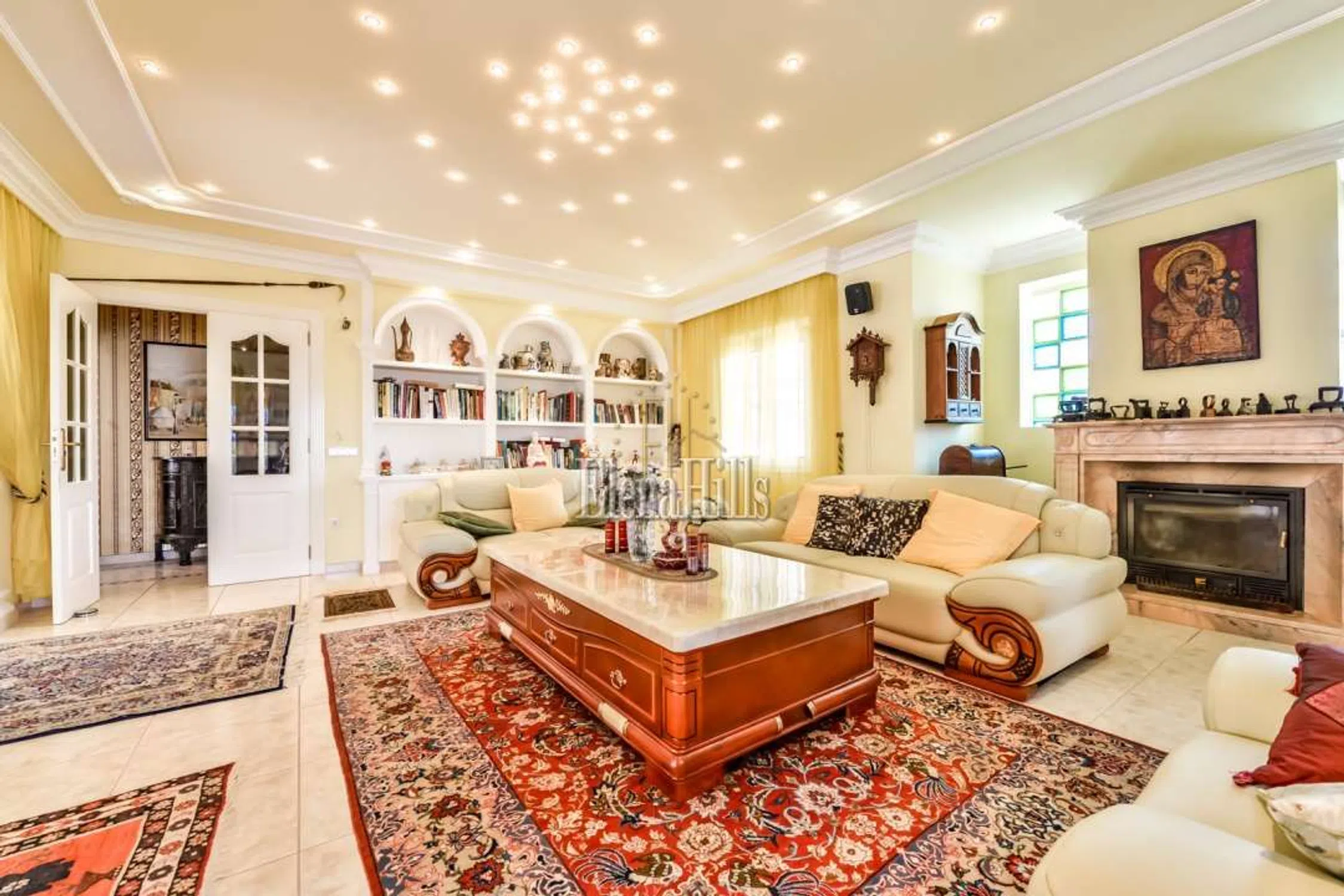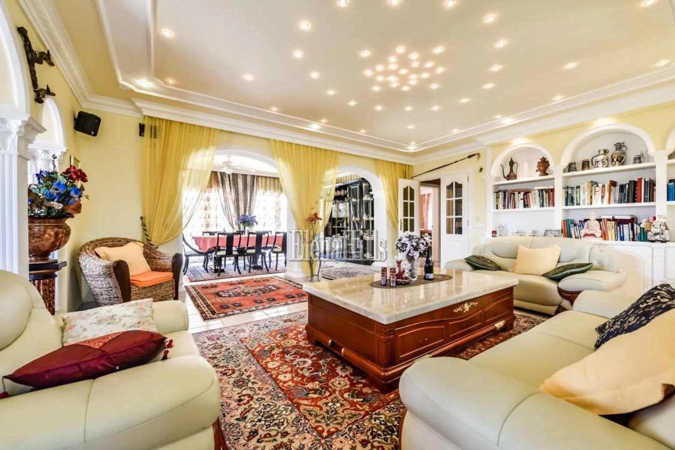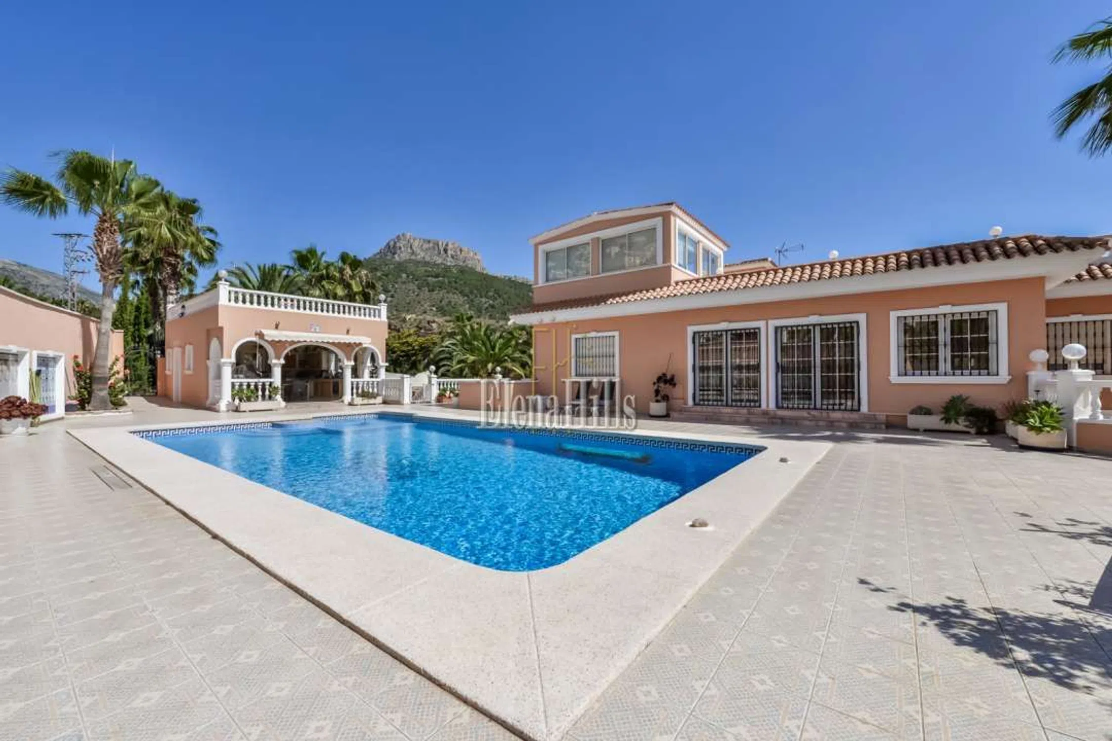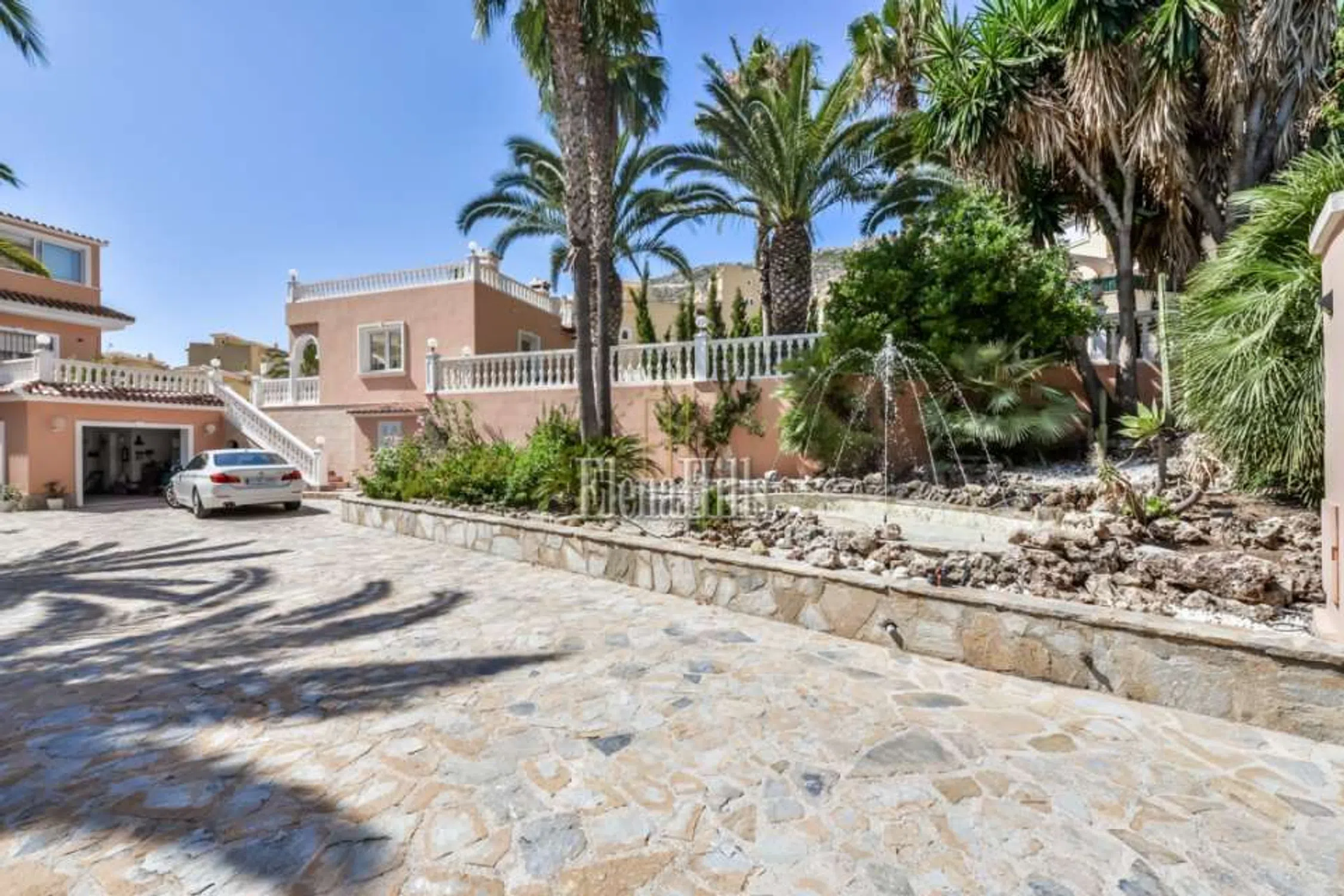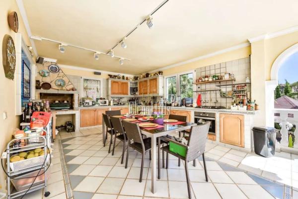 Esta prestigiosa villa de unos 460m² tiene una fantástica vista sobre el mar y está situado en una parcela de 3.800m² con plano de árboles maduros. Bien equipado con todas las comodidades hacen de esta propiedad una villa de lujo perfecto. Las puertas de entrada accionados eléctricos lleva en el parque con jardín con un estanque, una fuente y una glorieta. La puerta de entrada conduce a un amplio garaje para varios coches. La villa dispone de dos plantas, que se dividen de la siguiente manera: en la planta baja hay tres dormitorio y dos baños y una oficina. El dormitorio principal es muy espacioso y tiene un atractivo cuarto de baño con una gran bañera y jacuzzi. Una ducha y un inodoro con bidé están separados. Revestimientos de mármol italiano de altísima calidad. El salón se divide en varias secciones separadas por columnas y arcos. El salón real con sus sofás de cuero y chimenea. Por la noche la iluminación, así como un cielo estrellado invitan a un estado de ánimo positivo y hasta romántico. El área de TV también está generosamente equipada con sofás de cuero y acceso a un balcón donde se puede disfrutar de las fantásticas vistas sobre la ciudad de Calpe y el mar. La zona de comedor, también separada por arcos ofrece un montón de espacio para reuniones numerosas. En la misma planta se encuentra la cocina amplia y un trastero contiguo. Asimismo, un dormitorio atractivo, con cuarto de baño, que está dividido por un arco de medio punto que da un toque especial. Todas las habitaciones están equipadas con sistemas de sonido de alta calidad. El salón también se separa de la escalera, que conduce a una gran terraza. Desde aquí se puede disfrutar de una vista impresionante sobre Calpe, Peñon de Ifach. Aquí una habitación que actualmente está equipada como oficina. Varias puertas de patio conducen desde el salón a la terraza de la piscina con su piscina de gran tamaño de 6,5 x 13 m. Una pequeña zona separada con una fuente y sólo unos 80 cm de profundidad diseñada especialmente para los niños pequeños. Justo después de la zona de la piscina: la cocina de verano totalmente equipada, que por lo general invita al menos nueve meses al año que es el período con mejores temperaturas. Todo el menaje de cocina es muy moderno y cuenta también con una parrilla abierta. Es un espacio ideal para barbacoas apto para reuniones numerosas. Además cuenta con un aseo y ducha en este área. Cuenta además con una discoteca privada totalmente equipada. Gimnasio equipado. Suelo radiante en toda la propiedad. Esta propiedad se distingue por la alta calidad y la privacidad. La villa se encuentra en una zona tranquila y privilegiada residencial en Calpe. Tanto la autopista de Alicante o Valencia y el centro de la ciudad son fácilmente accesibles. La vista del mar es única. Equipado con todo, lo que tu corazón desea. Suelos de mármol, sofás de cuero elegante, moderna cocina de calidad y muebles de baño.