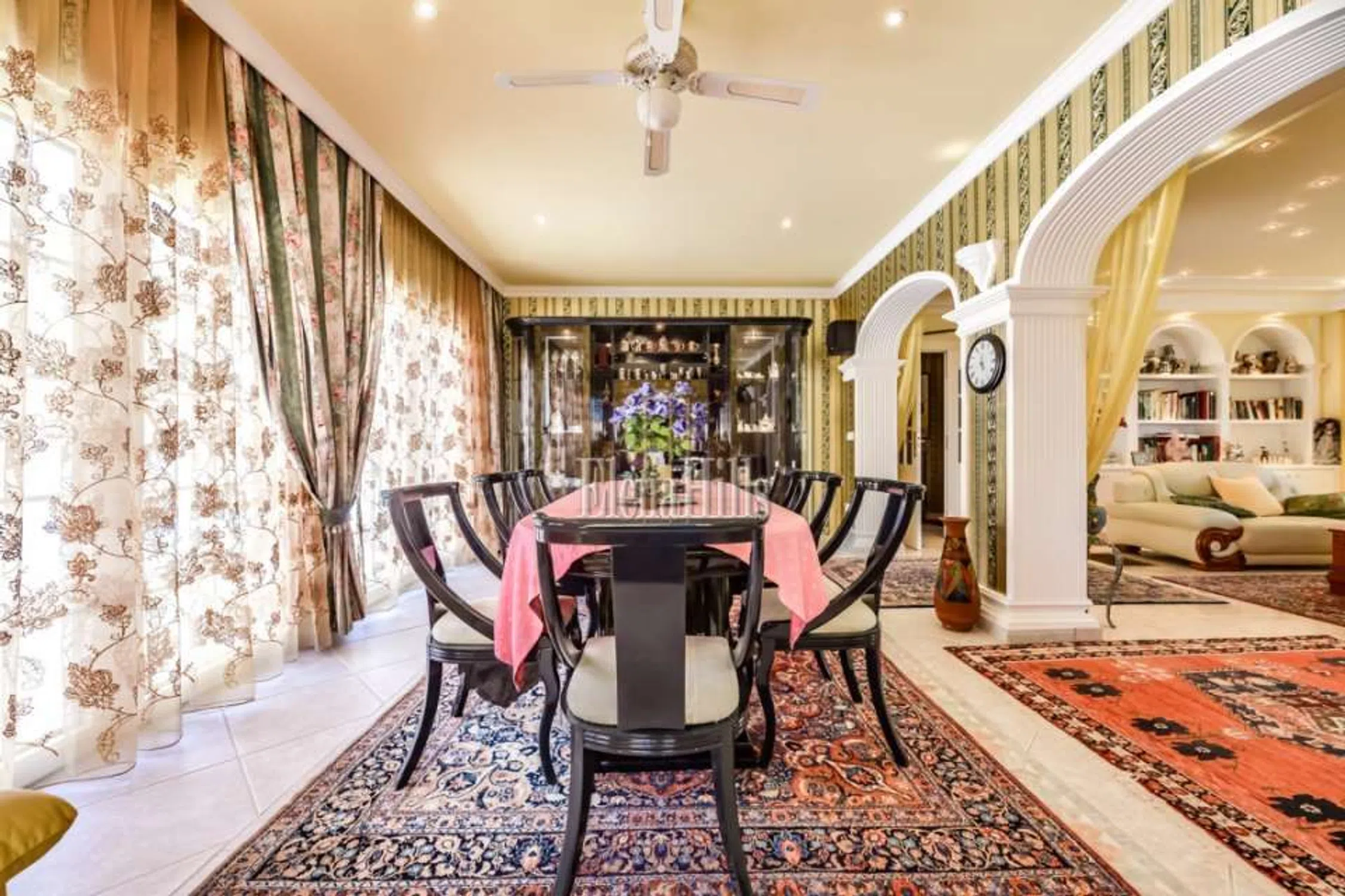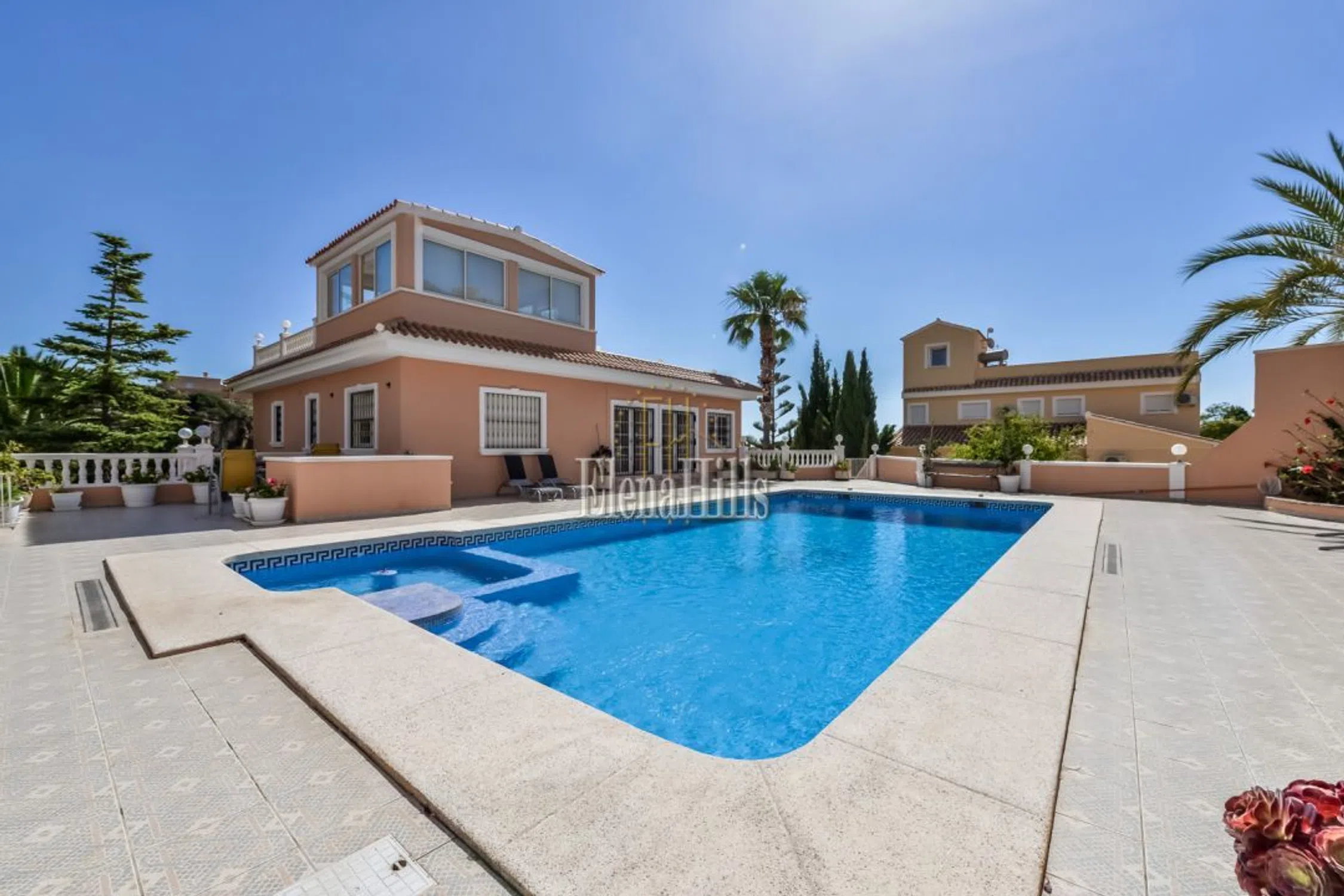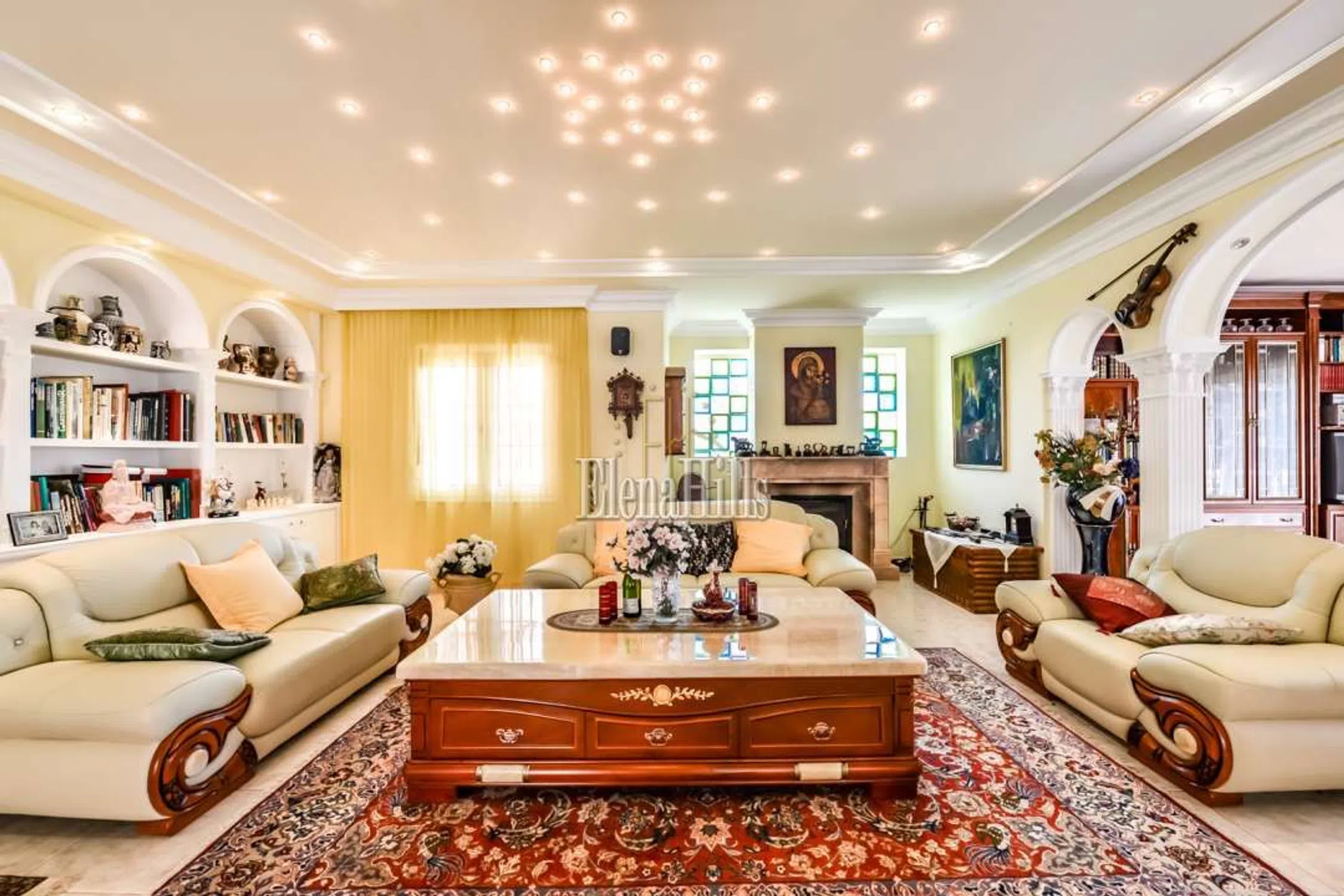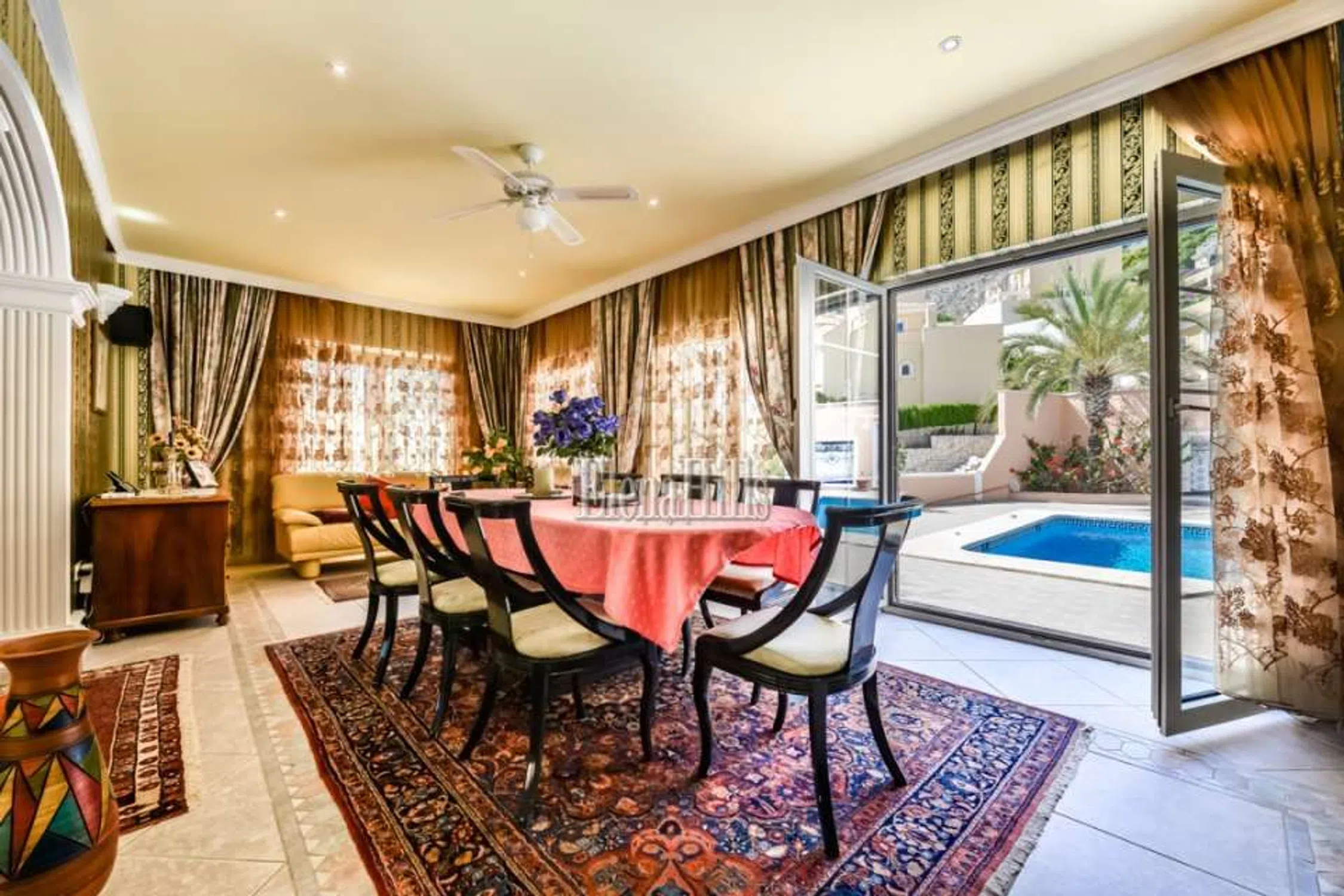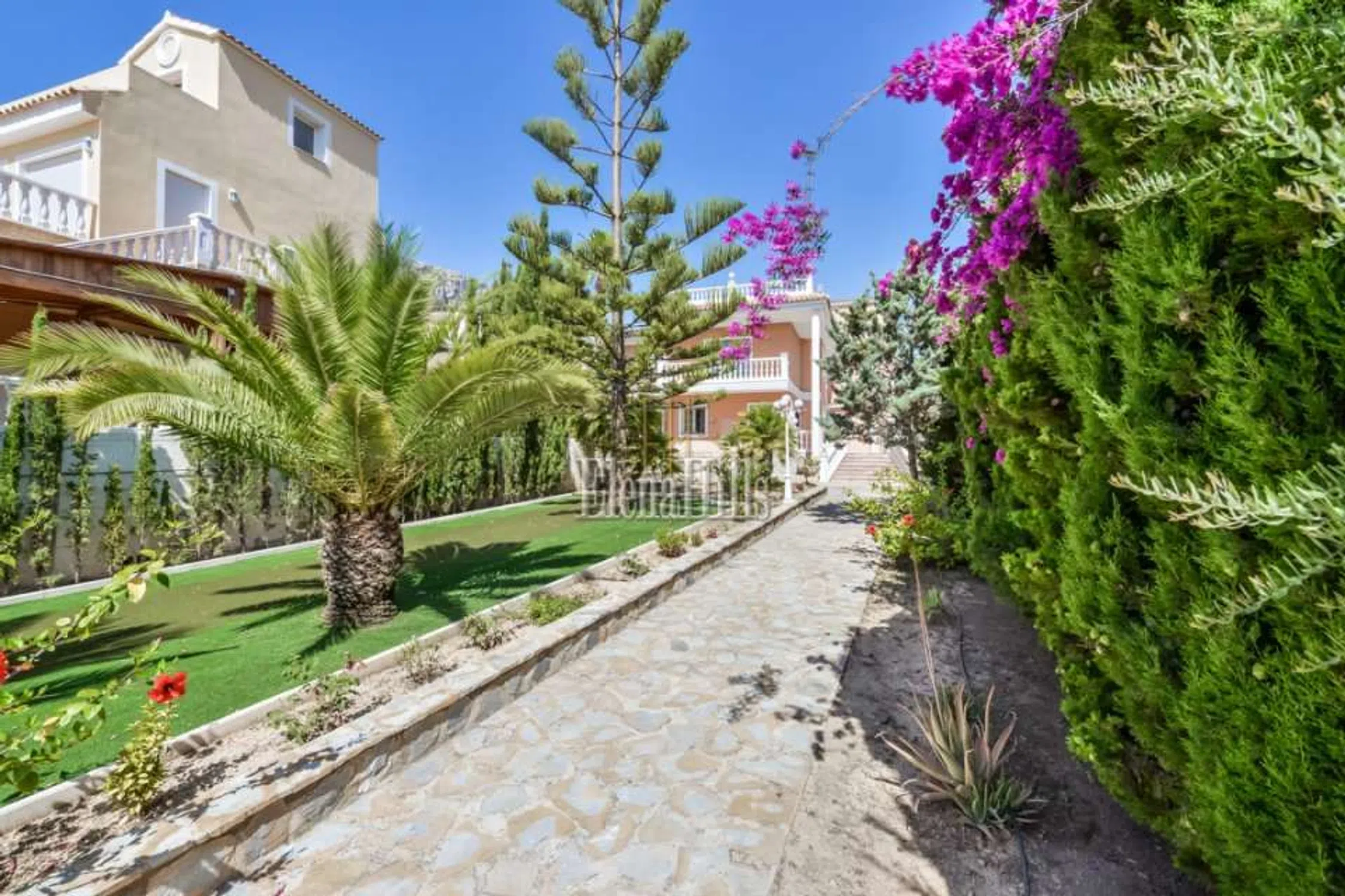 Esta prestigiosa villa de unos 460m² tiene una fantástica vista sobre el mar y está situado en una parcela de 3.800m² con plano de árboles maduros. Bien equipado con todas las comodidades hacen de esta propiedad una villa de lujo perfecto. Las puertas de entrada accionados eléctricos lleva en el parque con jardín con un estanque, una fuente y una glorieta. La puerta de entrada conduce a un amplio garaje para varios coches. La villa dispone de dos plantas, que se dividen de la siguiente manera: en la planta baja hay tres dormitorio y dos baños y una oficina. El dormitorio principal es muy espacioso y tiene un atractivo cuarto de baño con una gran bañera y jacuzzi. Una ducha y un inodoro con bidé están separados. Revestimientos de mármol italiano de altísima calidad. El salón se divide en varias secciones separadas por columnas y arcos. El salón real con sus sofás de cuero y chimenea. Por la noche la iluminación, así como un cielo estrellado invitan a un estado de ánimo positivo y hasta romántico. El área de TV también está generosamente equipada con sofás de cuero y acceso a un balcón donde se puede disfrutar de las fantásticas vistas sobre la ciudad de Calpe y el mar. La zona de comedor, también separada por arcos ofrece un montón de espacio para reuniones numerosas. En la misma planta se encuentra la cocina amplia y un trastero contiguo. Asimismo, un dormitorio atractivo, con cuarto de baño, que está dividido por un arco de medio punto que da un toque especial. Todas las habitaciones están equipadas con sistemas de sonido de alta calidad. El salón también se separa de la escalera, que conduce a una gran terraza. Desde aquí se puede disfrutar de una vista impresionante sobre Calpe, Peñon de Ifach. Aquí una habitación que actualmente está equipada como oficina. Varias puertas de patio conducen desde el salón a la terraza de la piscina con su piscina de gran tamaño de 6,5 x 13 m. Una pequeña zona separada con una fuente y sólo unos 80 cm de profundidad diseñada especialmente para los niños pequeños. Justo después de la zona de la piscina: la cocina de verano totalmente equipada, que por lo general invita al menos nueve meses al año que es el período con mejores temperaturas. Todo el menaje de cocina es muy moderno y cuenta también con una parrilla abierta. Es un espacio ideal para barbacoas apto para reuniones numerosas. Además cuenta con un aseo y ducha en este área. Cuenta además con una discoteca privada totalmente equipada. Gimnasio equipado. Suelo radiante en toda la propiedad. Esta propiedad se distingue por la alta calidad y la privacidad. La villa se encuentra en una zona tranquila y privilegiada residencial en Calpe. Tanto la autopista de Alicante o Valencia y el centro de la ciudad son fácilmente accesibles. La vista del mar es única. Equipado con todo, lo que tu corazón desea. Suelos de mármol, sofás de cuero elegante, moderna cocina de calidad y muebles de baño.