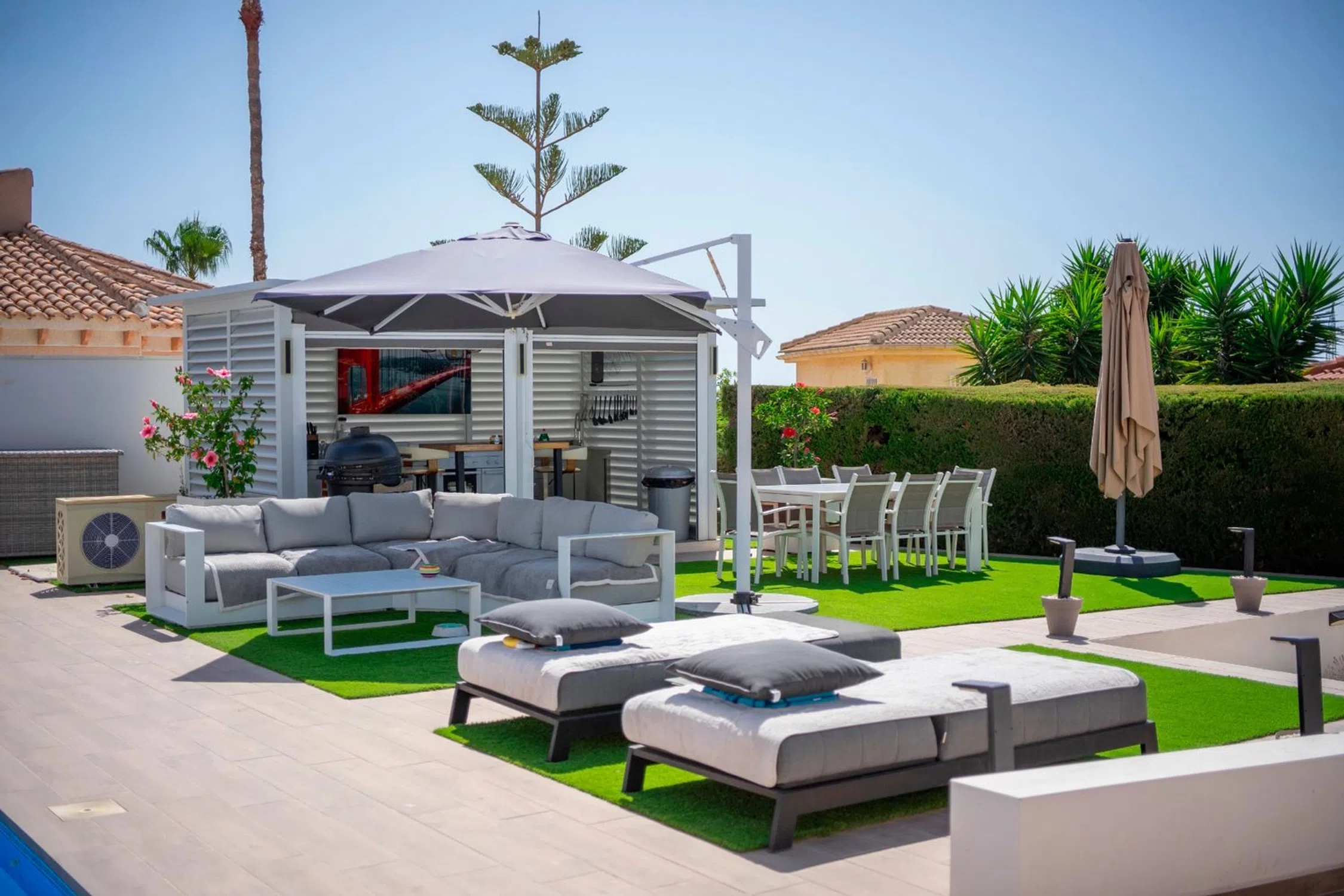 Villa Excepcional que Combina Comodidad Moderna con Elegancia Mediterránea Atemporal — Vistas Elevadas al Lago y al Mar Esta villa excepcional combina magistralmente las comodidades contemporáneas con la arquitectura mediterránea atemporal, creando un refugio de lujo a pocos pasos del centro de la ciudad, pero perfectamente aislado para una máxima privacidad. Elegantes detalles en piedra, fachadas blancas clásicas y líneas modernas y limpias amplifican el carácter sofisticado de la casa. Ubicada en una parcela elevada, la propiedad cuenta con vistas panorámicas del paisaje natural circundante, lagos salados e incluso el lejano mar Mediterráneo, ofreciendo una sensación única de apertura y tranquilidad que rara vez se encuentra tan cerca de la ciudad. Características Clave Tres Dormitorios con Baño Privado: Cada dormitorio ofrece proporciones generosas, armarios empotrados y baños privados con accesorios de primera calidad y piedra natural. Espacio Abierto: Un diseño perfecto une las áreas de estar, comedor y salón bajo techos altos, inundando el interior con luz natural. Las puertas correderas conectan con una sala de invierno cerrada con cortinas de cristal, ideal para la relajación durante todo el año y para disfrutar de las amplias vistas. Cocina Gourmet y Lavadero: La cocina elegante y totalmente equipada se complementa con un lavadero independiente y un conveniente aseo de invitados (de cortesía). Entradas Dobles y Estacionamiento Seguro: Dos entradas independientes con portones brindan acceso flexible. Debajo de la villa, un garaje espacioso tiene capacidad para varios vehículos. Sujeto a excavación adicional, se puede extender a un sótano de tamaño completo adecuado para un gimnasio, cine o suites de invitados adicionales. Entretenimiento al Aire Libre Piscina Climatizada bordeada por amplias terrazas para tomar el sol Cocina de verano y barbacoa integrada para comer al aire libre Ducha junto a la piscina y WC exterior Jardín con césped en el flanco opuesto, actualmente un lienzo en blanco para jardinería, deportes o juegos Potencial de Expansión: El permiso de planificación existente permite la construcción de una casa de huéspedes independiente de hasta tres dormitorios. La parcela también se puede segregar legalmente, ofreciendo atractivas posibilidades para el desarrollo futuro o la reventa. Ubicación Ubicada en una ubicación privilegiada, "lo mejor de ambos mundos", la propiedad se encuentra en el corazón de la ciudad, a poca distancia de cafés, boutiques y servicios esenciales, pero discretamente escondida en una calle tranquila, lo que garantiza paz, privacidad e impresionantes vistas al lago y al mar. Atractivo de Inversión Ya sea que se conciba como una residencia permanente prestigiosa, una escapada de vacaciones indulgente o una inversión de alquiler de alto rendimiento, esta villa representa una oportunidad única en una ubicación inmejorable, con margen para agregar aún más valor con el tiempo. Organice su visita privada hoy para experimentar todo su potencial.
