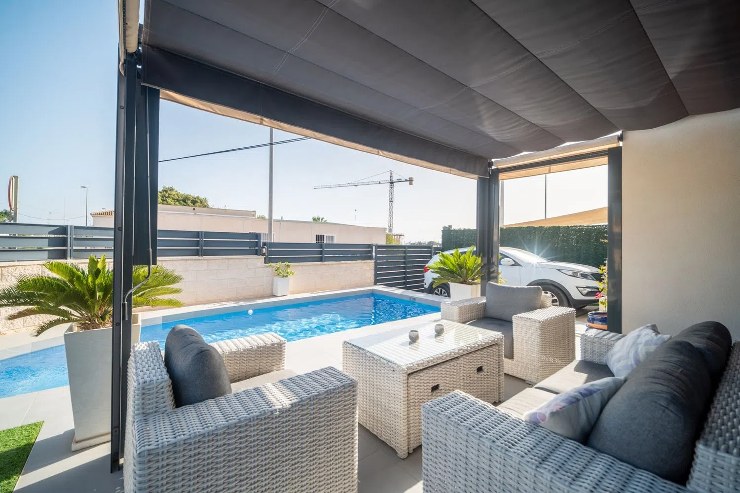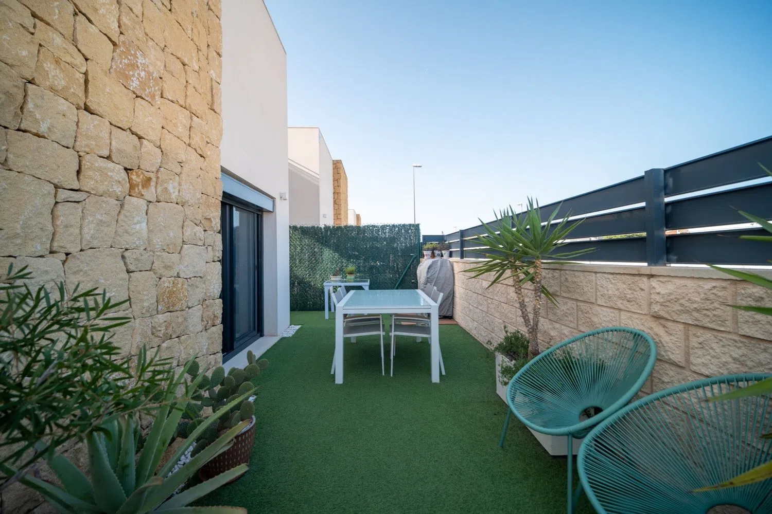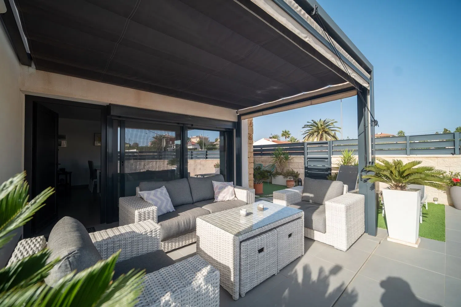 La vida al aire libre es un atractivo destacado, con un amplio espacio ideal para la relajación o el entretenimiento. La propiedad incluye una amplia terraza y un jardín paisajista, perfecto para disfrutar del clima mediterráneo. Además, dispone de una plaza de aparcamiento privada y acceso a una piscina comunitaria, lo que realza aún más su atractivo. La villa se encuentra cerca de una variedad de servicios, incluyendo tiendas, restaurantes e instalaciones recreativas, lo que la convierte en un lugar ideal para residir todo el año o como un refugio vacacional.