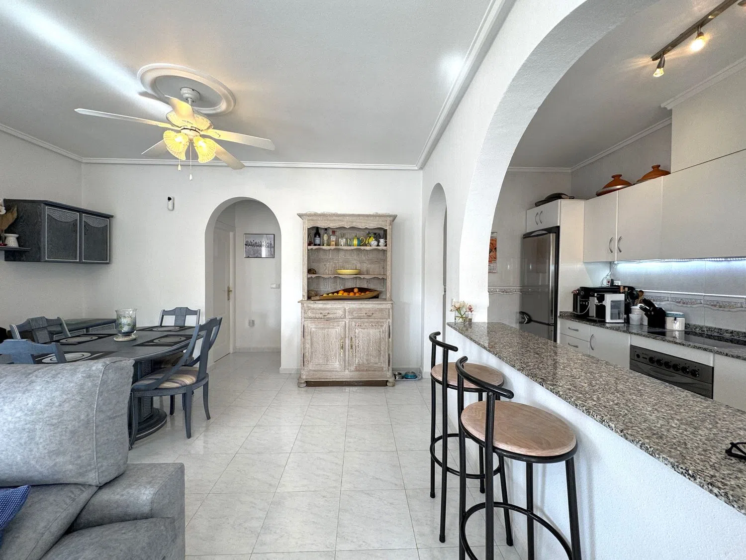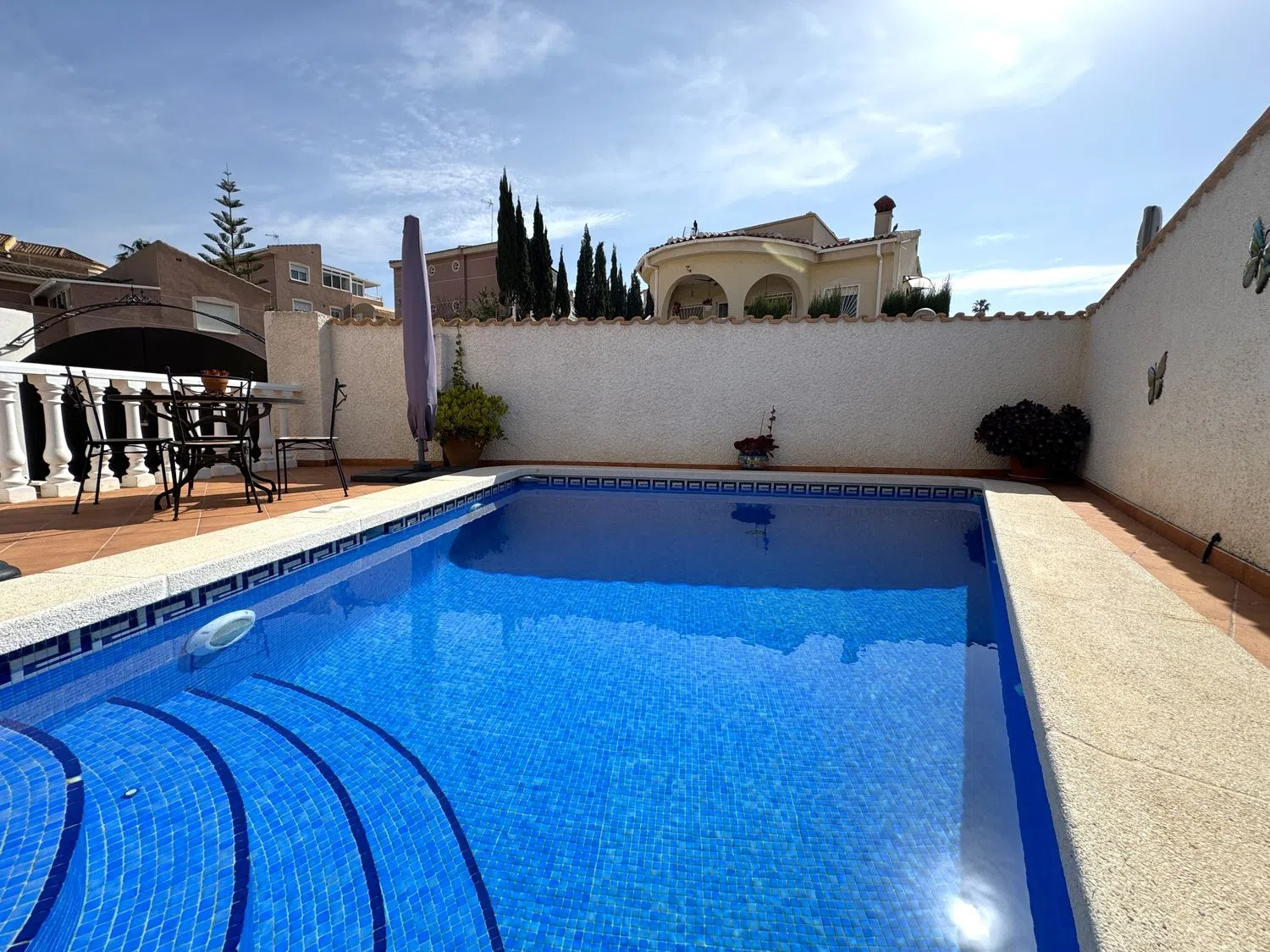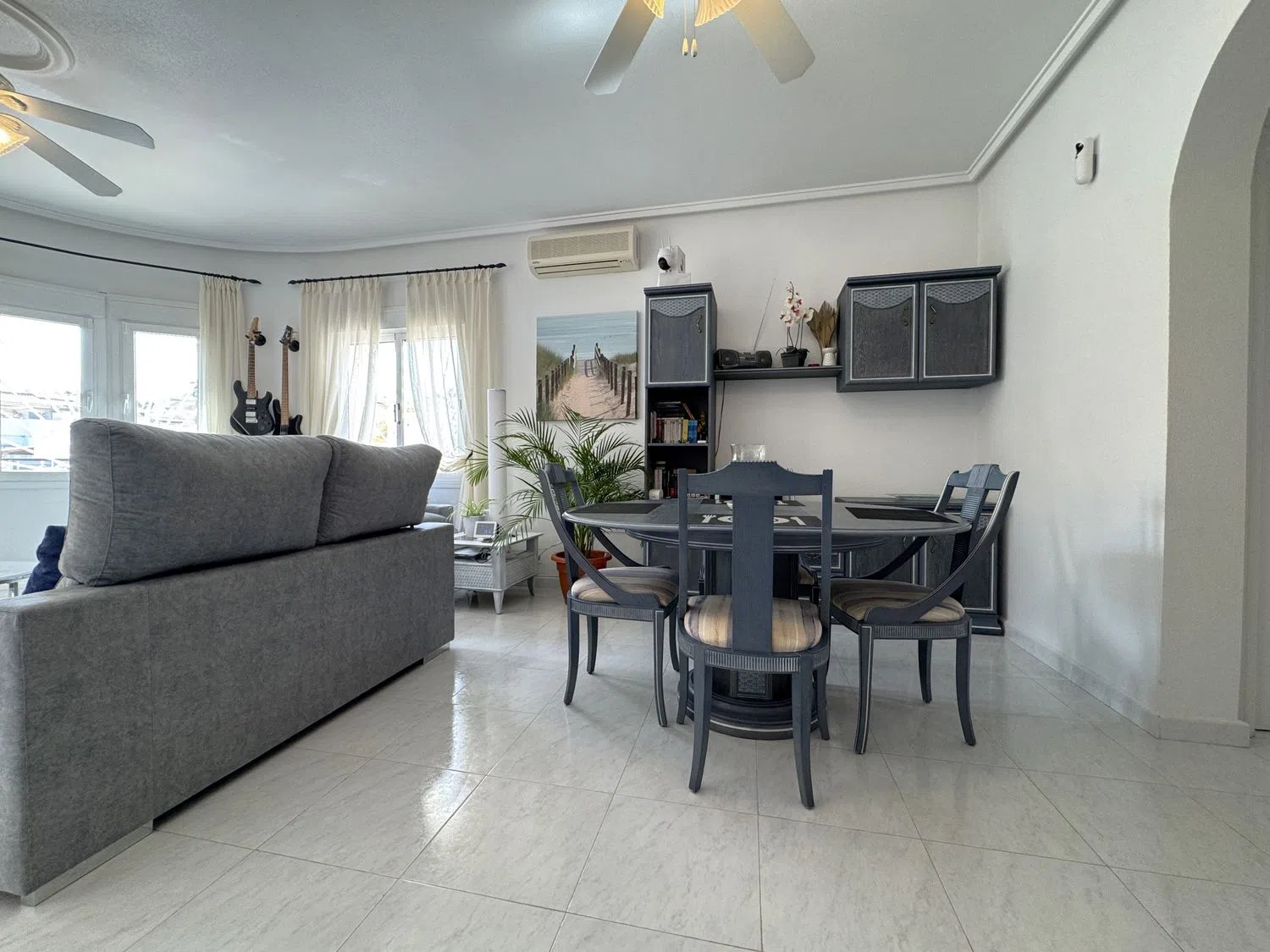 Bedrums Real Estate ofrece a la venta este chalet amueblado, acogedor y con acabados de primeras calidades, cercano al campo de Golf La Marquesa, en Ciudad Quesada, Rojales. Cuenta con una distribución de 2 dormitorios, un cuarto de baño, cocina equipada de estilo americana, salón-comedor, porche y una gran terraza exterior. Incluye instalación y 3 máquinas de A/A, ventiladores de techo con lámpara, armarios empotrados, chimenea, carpintería exterior de aluminio-climalit, suelos cerámicos. La vivienda tiene una superficie construida de 85 m2, orientación Sur, es totalmente exterior y disfruta de luminosidad y luz natural en sus estancias. Sita sobre una parcela de 266 m2 con muros de obra, piscina, barbacoa, solárium, jardín, aparcamiento para vehículos y suelo pavimentado. Además posee un semisótano con espacio suficiente para ser usado como trastero o almacén. La propiedad fue construida en 2004 y mantiene un estado de conservación excelente. La zona donde se ubica es ideal para residir todo el año, dispone de todo tipo de servicios en sus alrededores, mercadillos donde poder disfrutar de productos locales, zonas de restauración y ocio, supermercados, centro de salud, etc. Si nos desplazamos encontramos el mar y las playas más cercanas a 7 km, el municipio de Guardamar del Segura a 9 km y la ciudad de Torrevieja a 10 km.