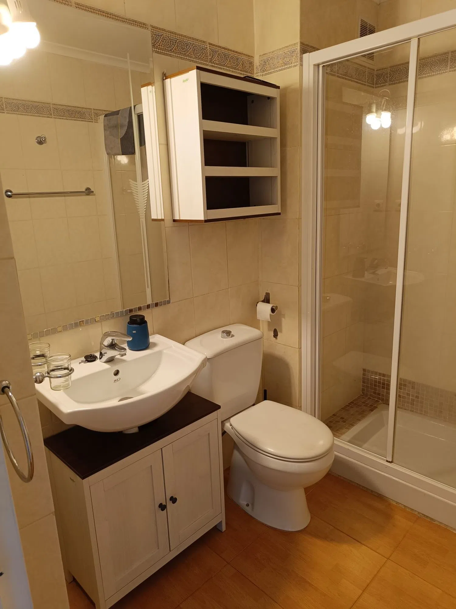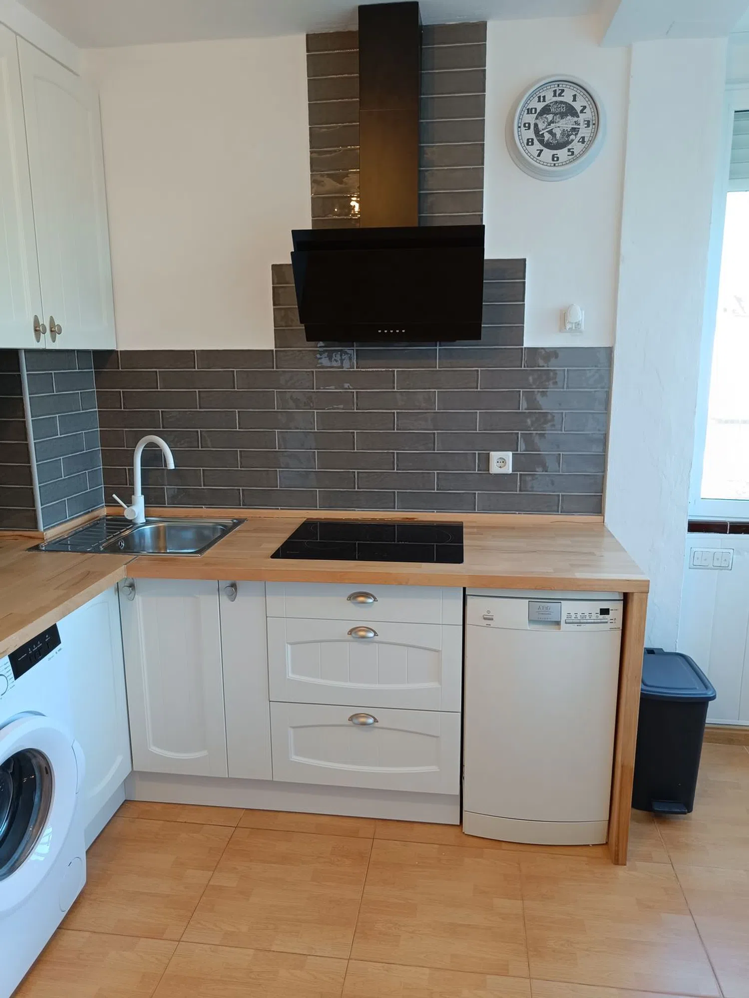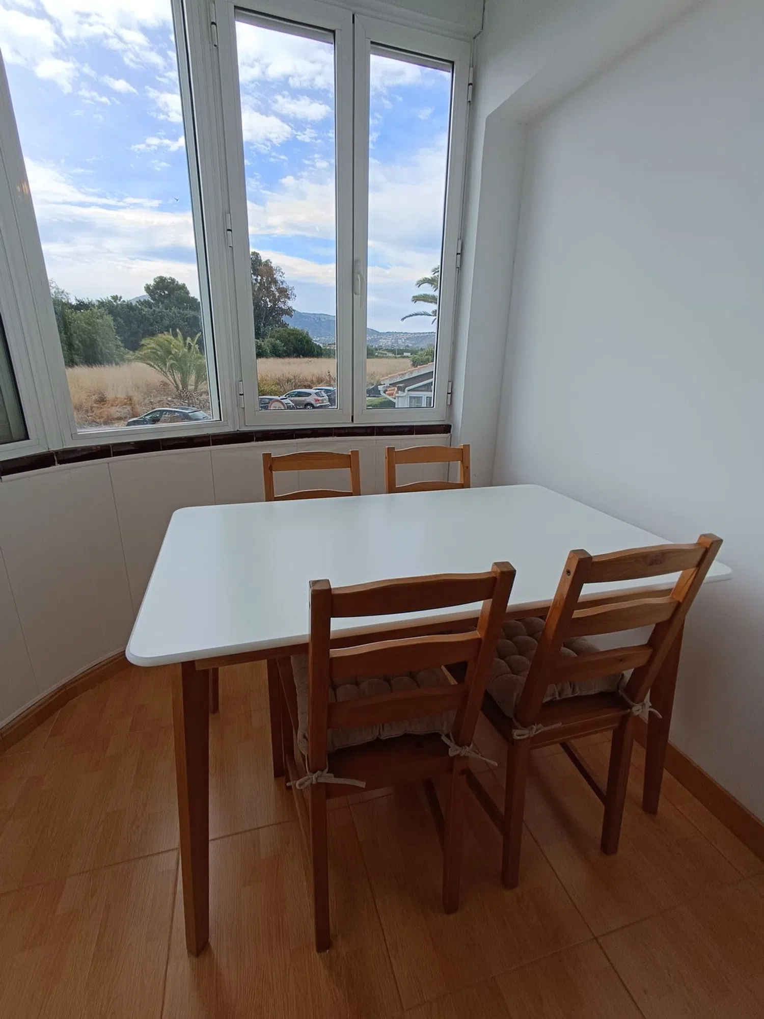 El apartamento, diseñado para ser accesible con pocas escaleras, es un entresuelo que ofrece comodidad. Dispone de espacio de estacionamiento en la entrada. Consta de dos habitaciones y un baño, y aunque no tiene balcón, cuenta con un moderno sistema de aire acondicionado tipo Split, instalado recientemente en junio de 2024, que proporciona tanto frío como calor en el salón. La cocina ha sido reformada y está equipada con nevera, lavadora y lavavajillas, lo que la hace ideal para estancias prolongadas.