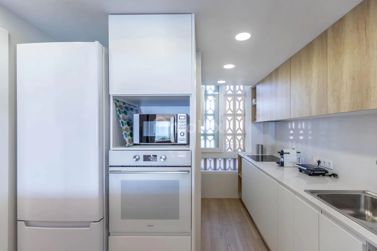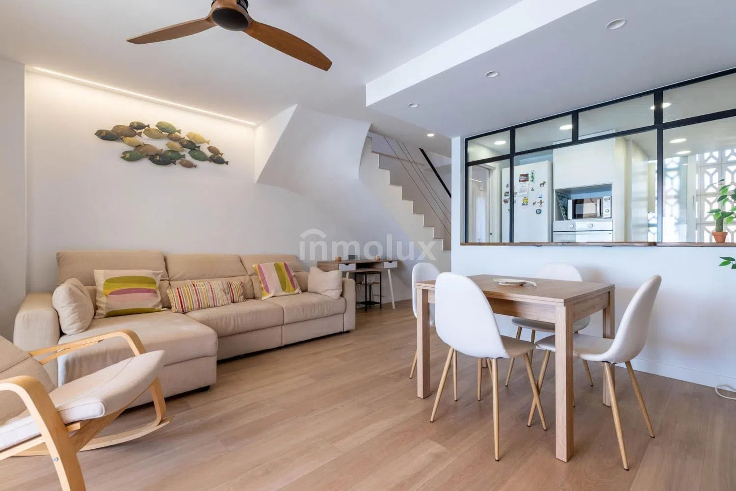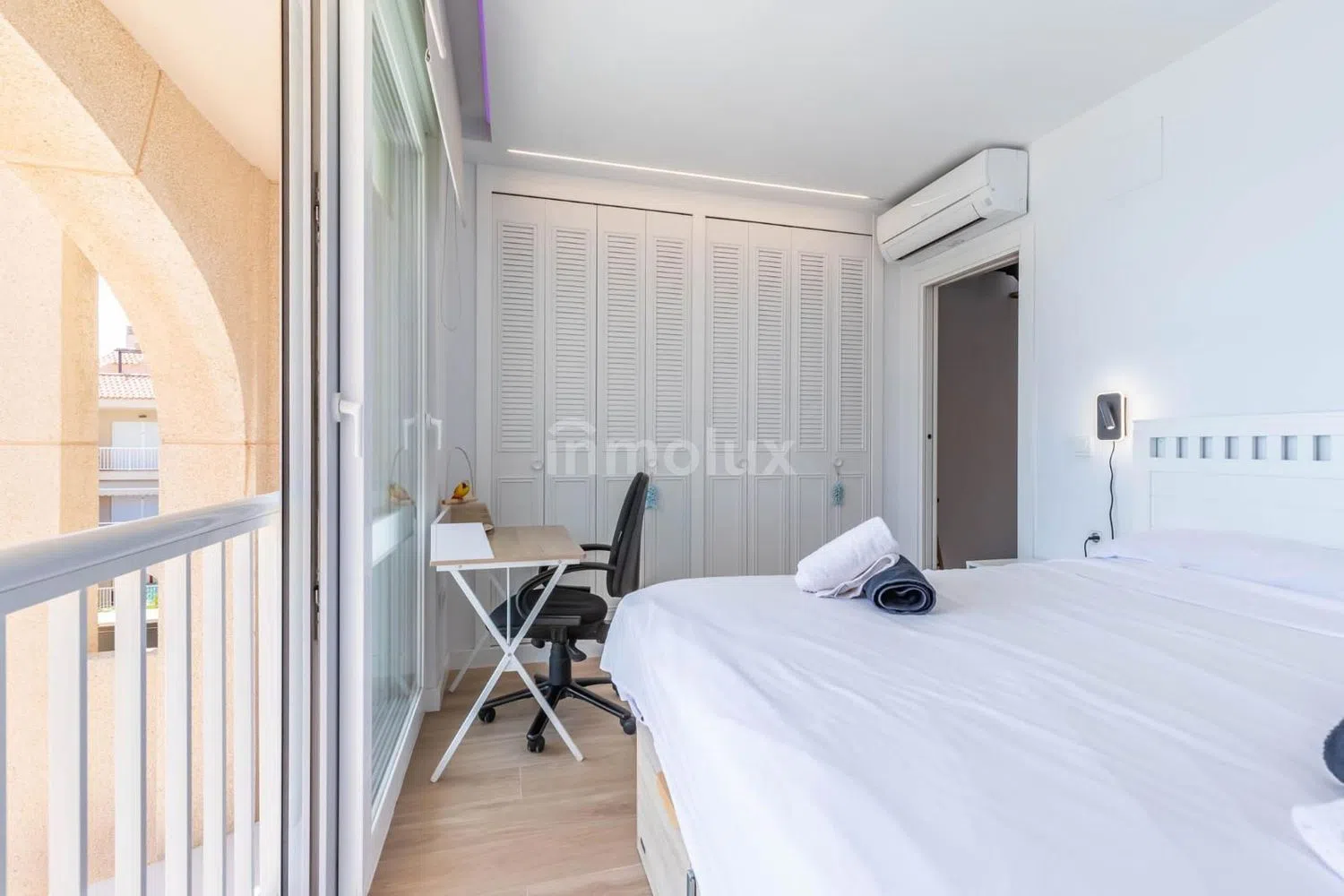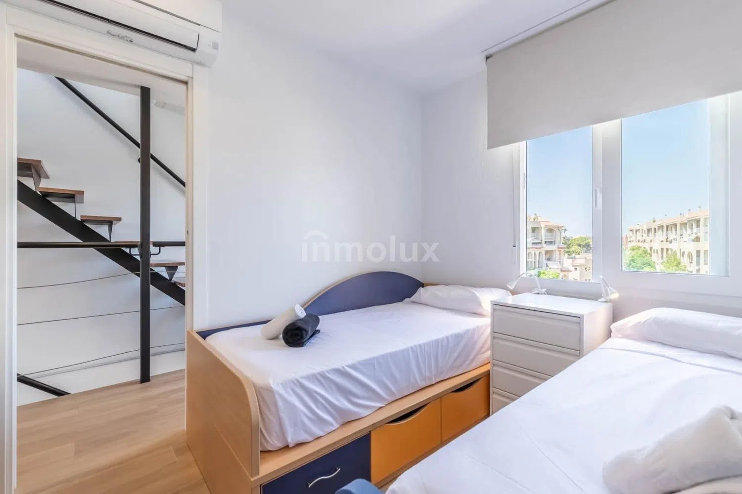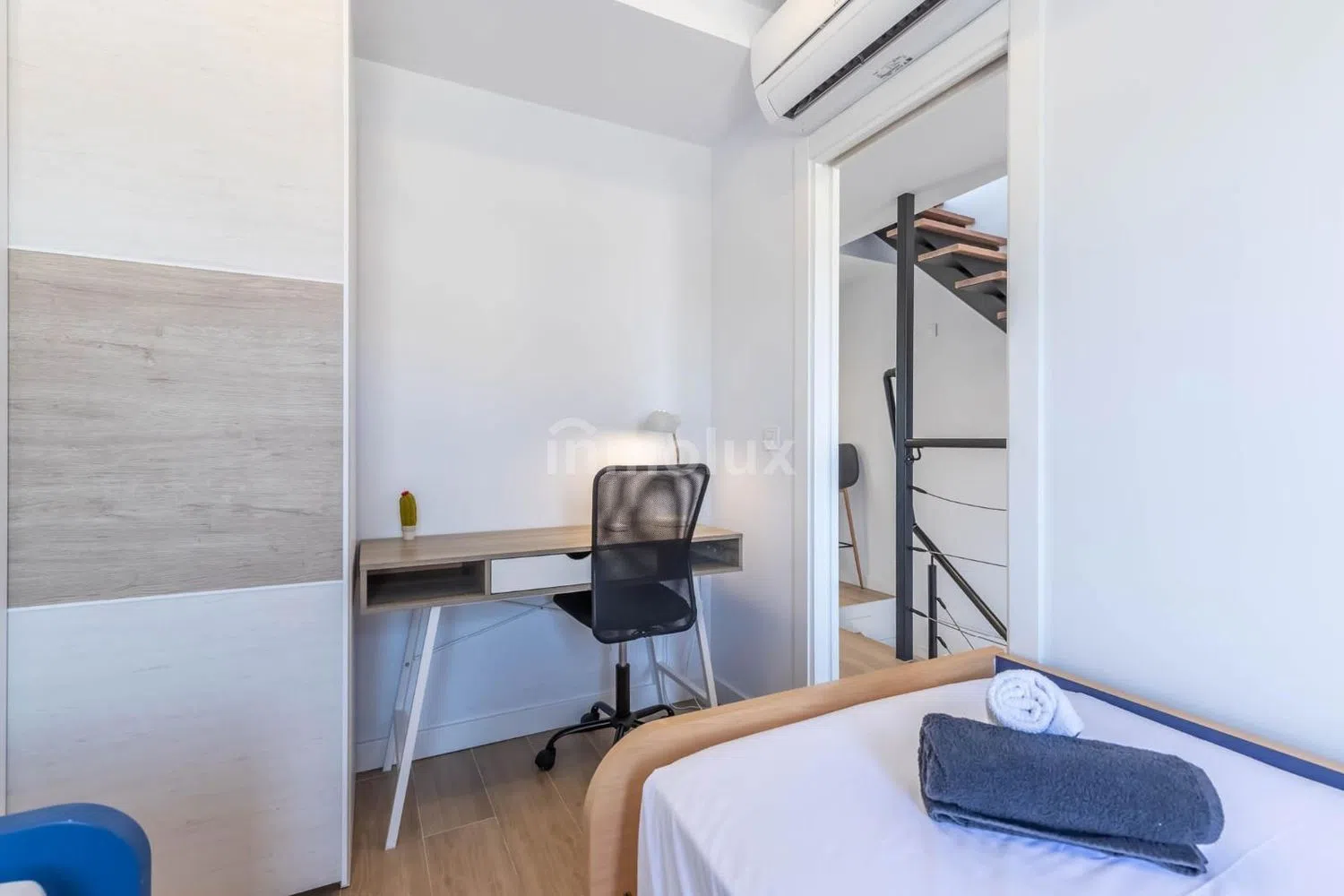 En la planta superior, encontrarás dos dormitorios equipados con armarios empotrados y aire acondicionado canalizado, garantizando el máximo confort. El baño ha sido reformado con materiales de alta calidad y cuenta con una moderna ducha. La iluminación con luces LED en toda la vivienda aporta un toque contemporáneo y elegante a cada estancia.
