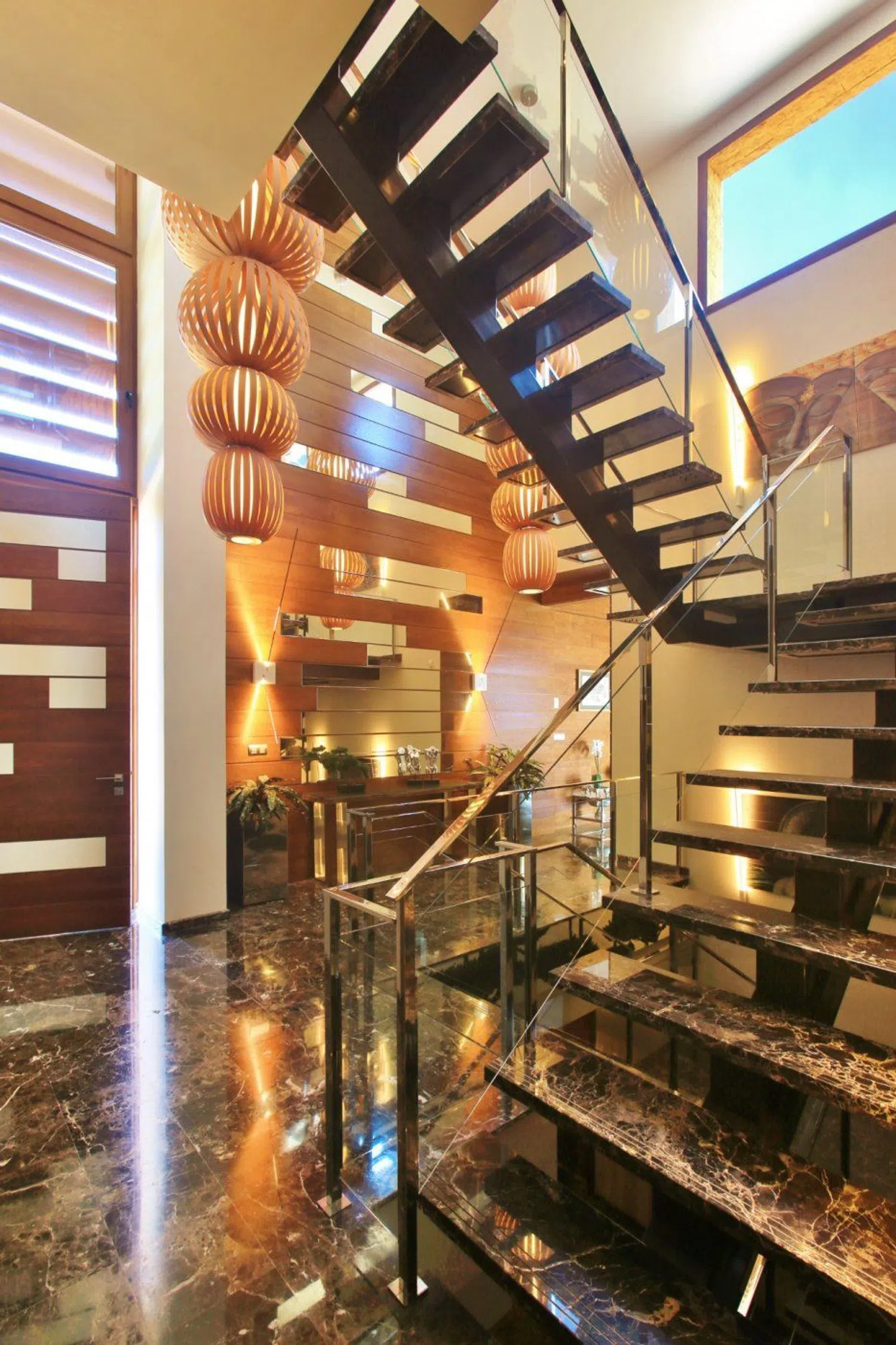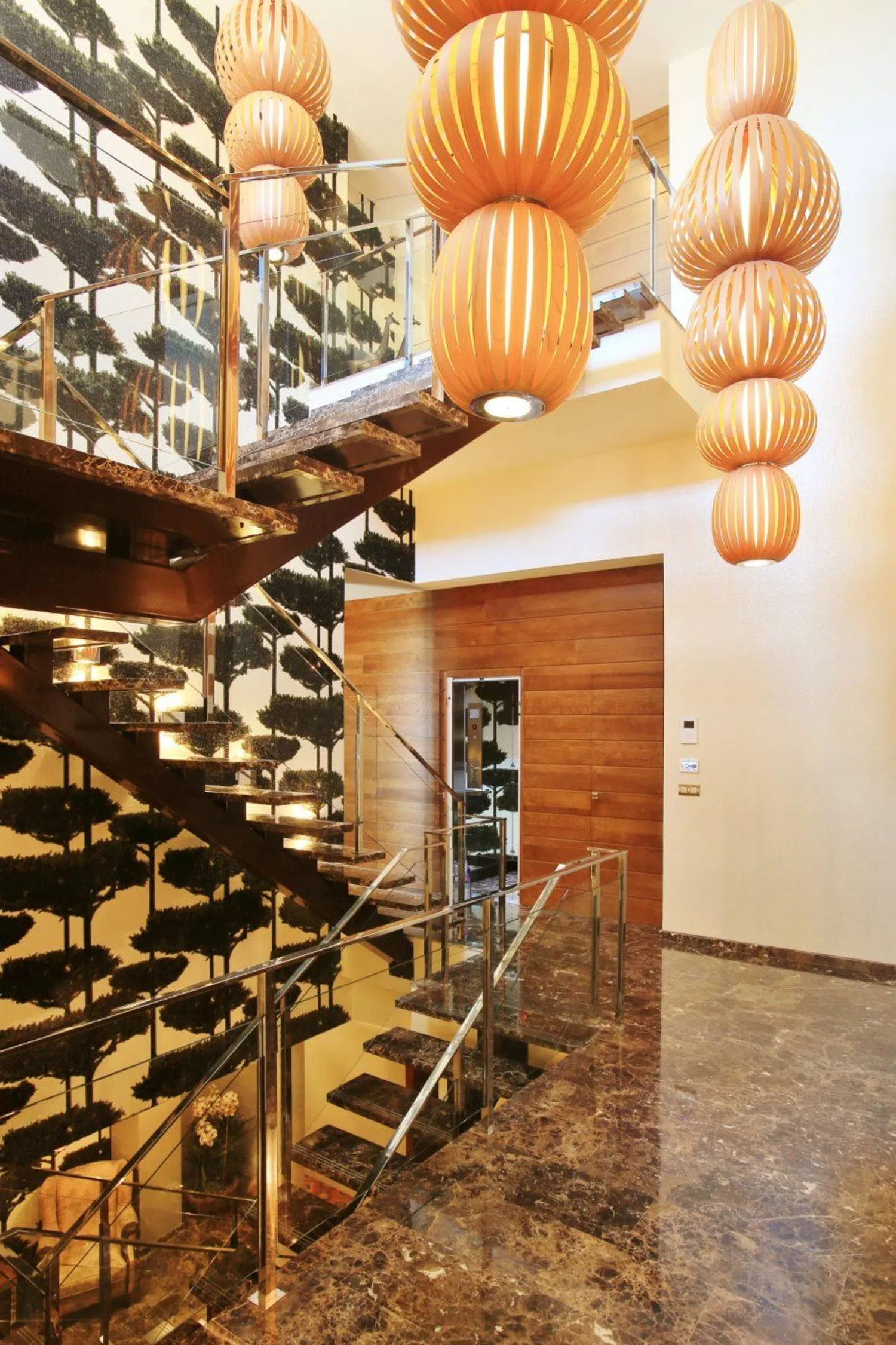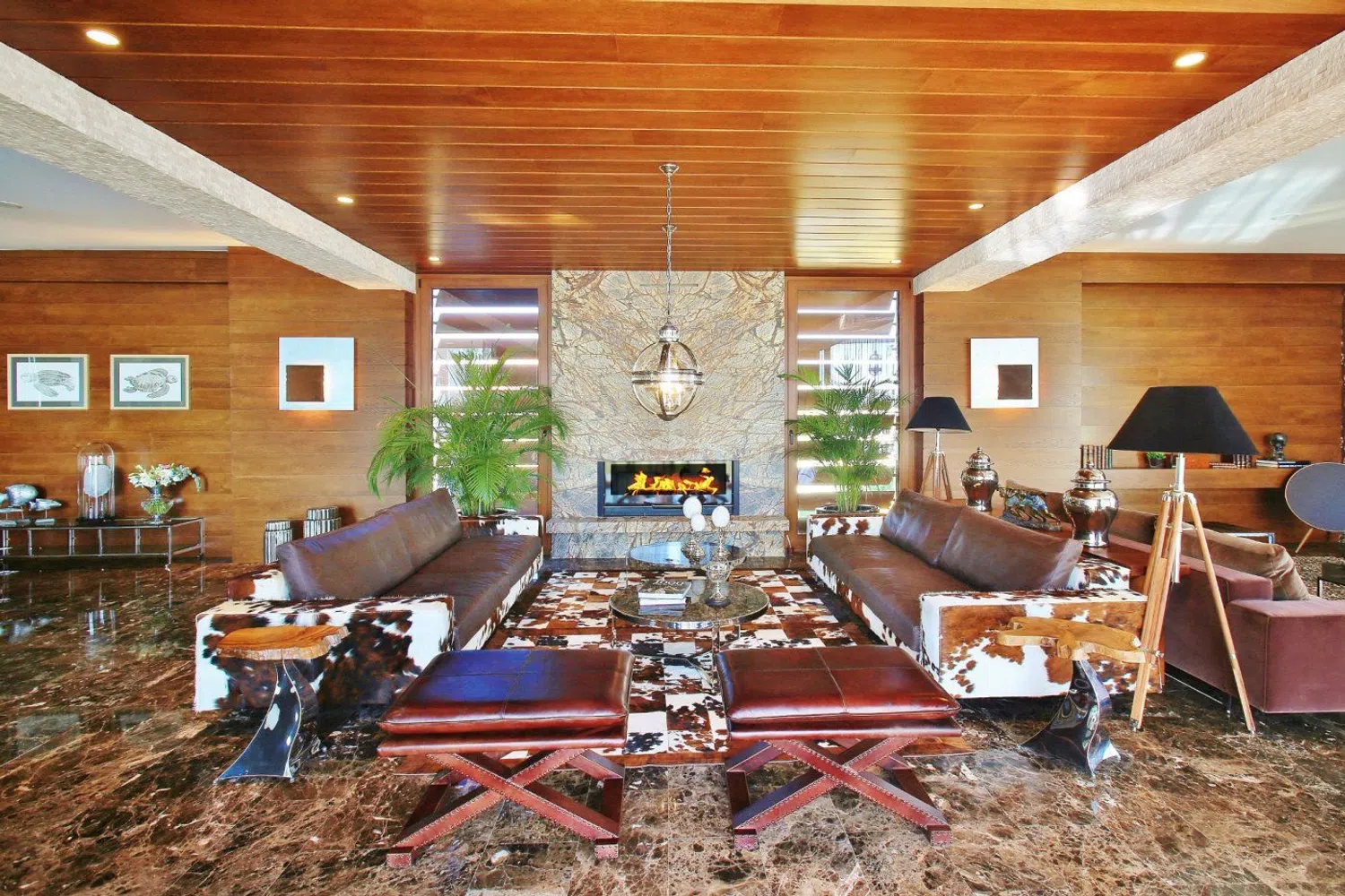 Distribuida en dos niveles, la entrada se realiza a través de un vestíbulo espectacular con techos altos, que conduce a una luminosa sala de estar equipada con chimenea. Las lámparas, diseñadas a medida, aportan un toque exclusivo y diferenciador a los espacios. Sin escatimar en recursos, se han utilizado materiales de alta calidad en toda la propiedad, acentuando su singularidad.