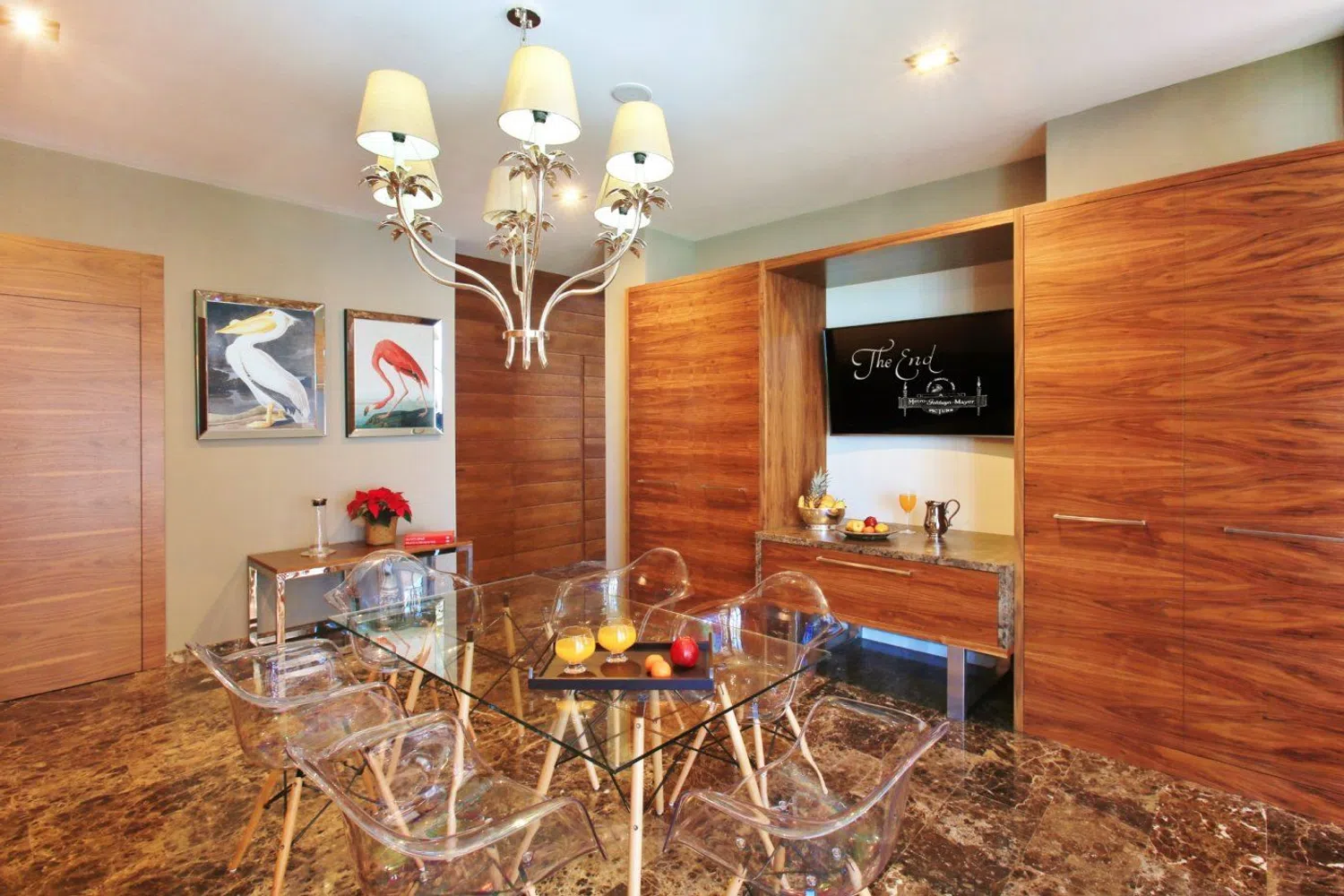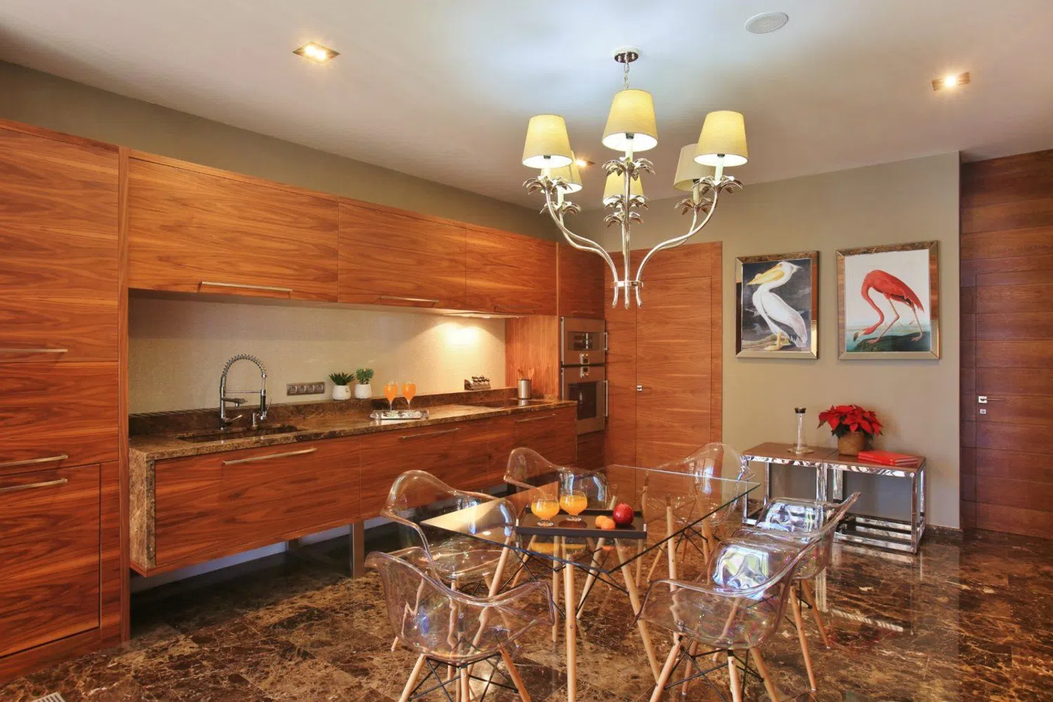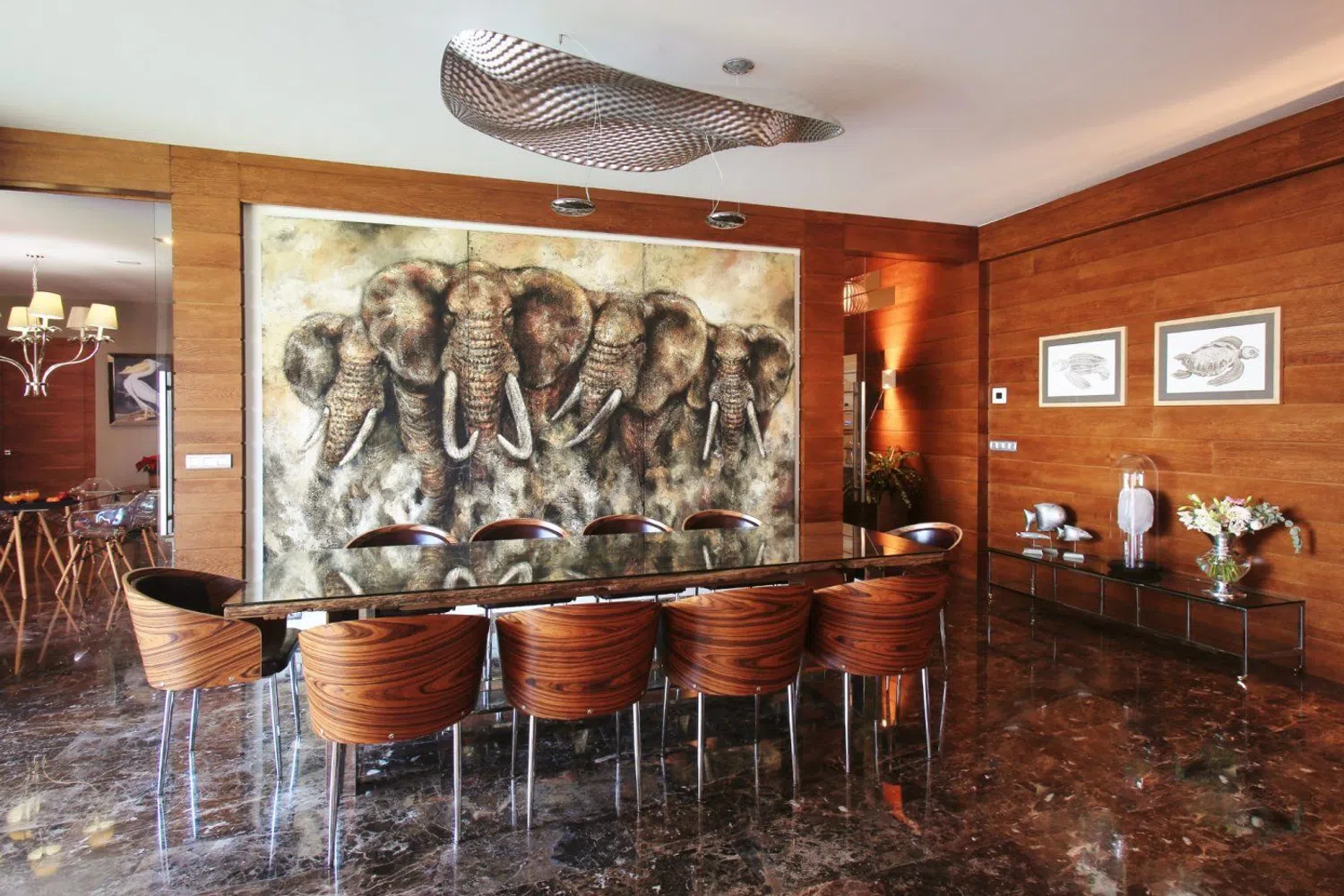 Distribuida en dos niveles, la entrada se realiza a través de un vestíbulo espectacular con techos altos, que conduce a una luminosa sala de estar equipada con chimenea. Las lámparas, diseñadas a medida, aportan un toque exclusivo y diferenciador a los espacios. Sin escatimar en recursos, se han utilizado materiales de alta calidad en toda la propiedad, acentuando su singularidad.