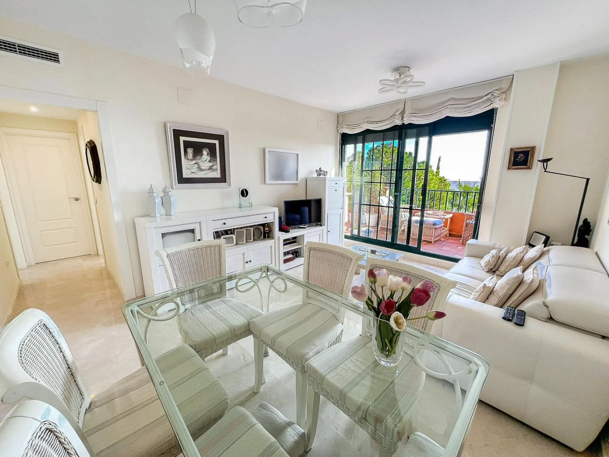 Impresionante apartamento reformado con orientación Sur, ubicado en exclusiva urbanización en Sierra Cortina (Finestrat). Compuesto por 2 amplios dormitorios, 2 baños (uno de ellos en suite) y cocina independiente. Desde el salón y dormitorios podemos acceder a sus dos terrazas con increíbles vistas despejadas, con superficies de 19m2 (terraza semidescubierta) y 11,5m2 (terraza descubierta). Dotada con aire acondicionado centralizado, armarios empotrados y alarma. Plaza de garaje de 12m2 y trastero de 6m2, incluidos en el precio. Esta exclusiva urbanización cuenta con piscina comunitaria y zonas ajardinadas muy bien cuidadas y mantenidas.