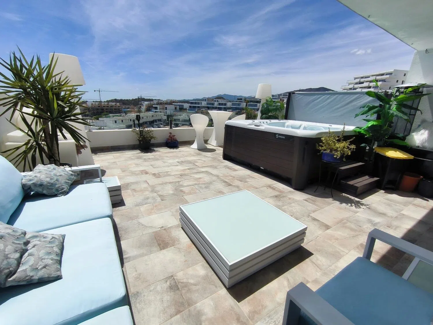 La cocina de diseño moderno, equipada con los más altos estándares, invita a desarrollar tus habilidades culinarias mientras te bañas en la refrescante brisa marina. Cada uno de los tres dormitorios se presenta como un santuario de paz y confort, con su propio baño, garantizando privacidad y comodidad tanto para los residentes como para sus invitados. El dormitorio principal, además, ofrece acceso a una terraza privada con un jacuzzi, un lugar perfecto para disfrutar de la tranquilidad y la belleza del paisaje.