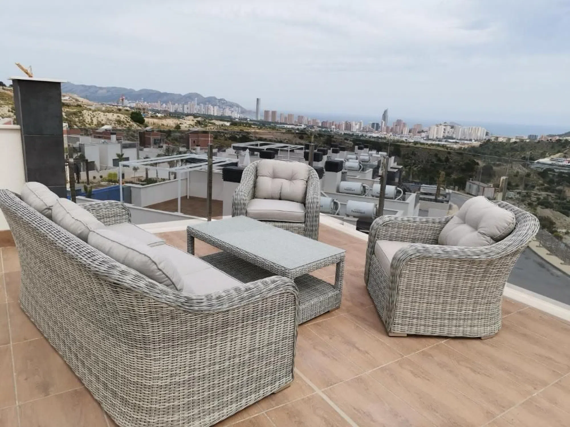 Se ofrece a la venta un magnífico ático de nueva construcción, ubicado en una zona pintoresca con vistas abiertas al Mar Mediterráneo y a la ciudad de Benidorm. Esta residencia consta de tres dormitorios y dos baños, una espaciosa sala de estar y tres terrazas bellamente diseñadas, creando un espacio único para vivir y descansar. Una de las terrazas tiene acceso desde la sala de estar, la segunda desde un dormitorio, proporcionando un acceso cómodo al aire libre. Una ventaja adicional es una gran terraza superior, equipada con muebles de jardín, desde donde se abren vistas impresionantes. La barandilla de vidrio de la terraza superior garantiza la continuidad de la vista panorámica. El complejo cuenta con dos amplias piscinas climatizadas que funcionan con energía solar, una piscina infantil y una gran zona para el esparcimiento de los niños. Este ático representa una excelente oportunidad para los amantes del confort, las comodidades modernas y los magníficos paisajes marinos. [IW].