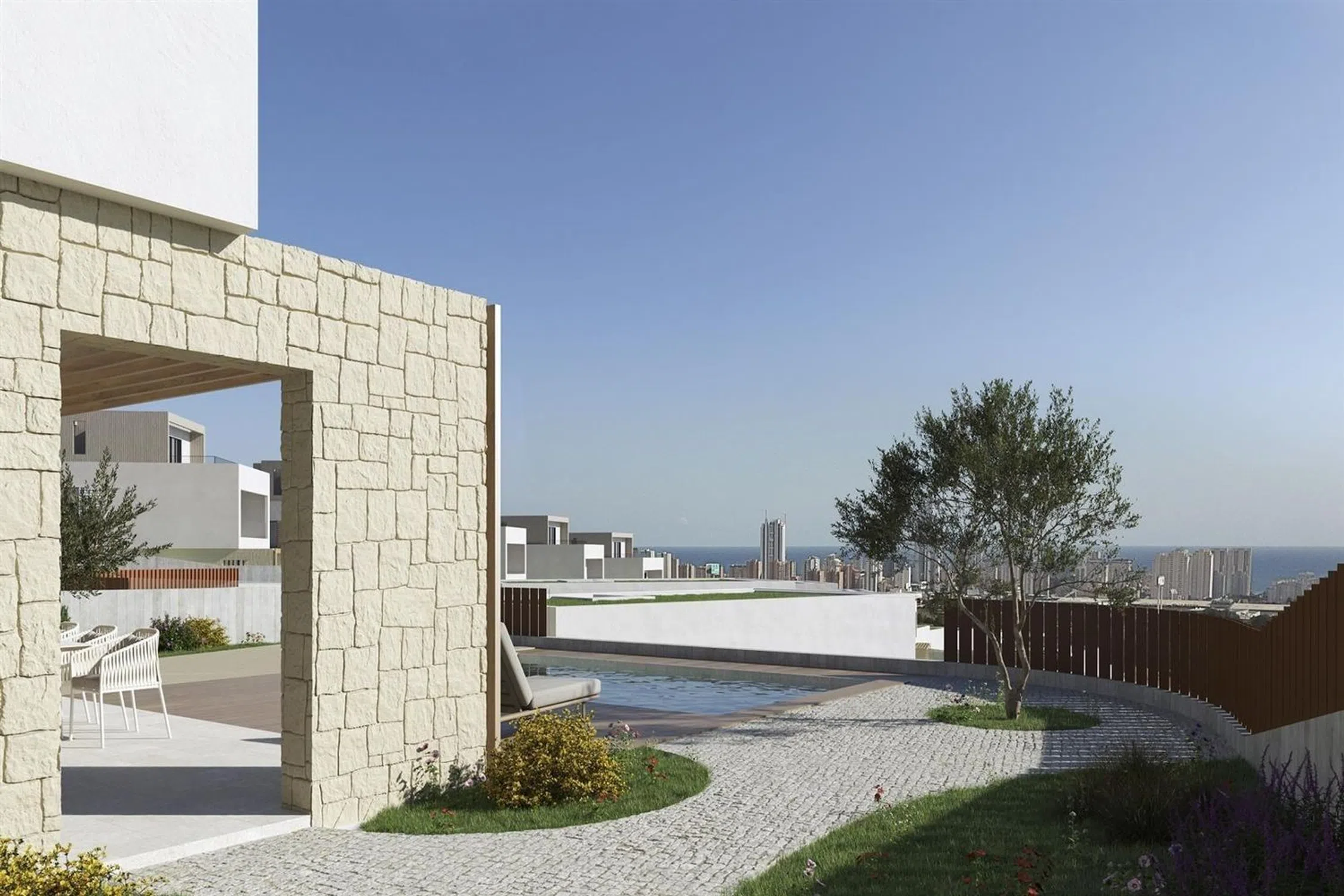 Villas de lujo independiente con piscina, con 4 dormitorios, en las que ll estilo mediterráneo se fusiona con la modernidad y la naturaleza. La villa cuentan con una distribución escalonada, totalmente integrada en el entorno. La parcela, de 620 metros cuenta con un amplio estacionamiento para dos vehículos. La piscina, una hermosa lámina de agua y tumbonas te conducen a la planta baja, a la que se accede a través de un gran ventanal abatible. Junto a ella, la zona de barbacoa configurable según tus necesidades. La villa ofrece carpintería de aluminio de alta calidad, persianas motorizadas en dormitorios, terraza superior y un interior elegante con suelos de porcelánico y carpintería en tonos blancos. Los baños se integran a la perfección, con muebles de diseño y encimeras encastradas. La villa también incluye tecnología eficiente, tomas eléctricas, iluminación LED y sistema de ventilación. En resumen, estas villas de lujo en Sierra Cortina, Finestrat, no solo ofrecen calidad, diseño y comodidad, sino que también están comprometidas con la sostenibilidad, brindando una experiencia excepcional en un entorno privilegiado.