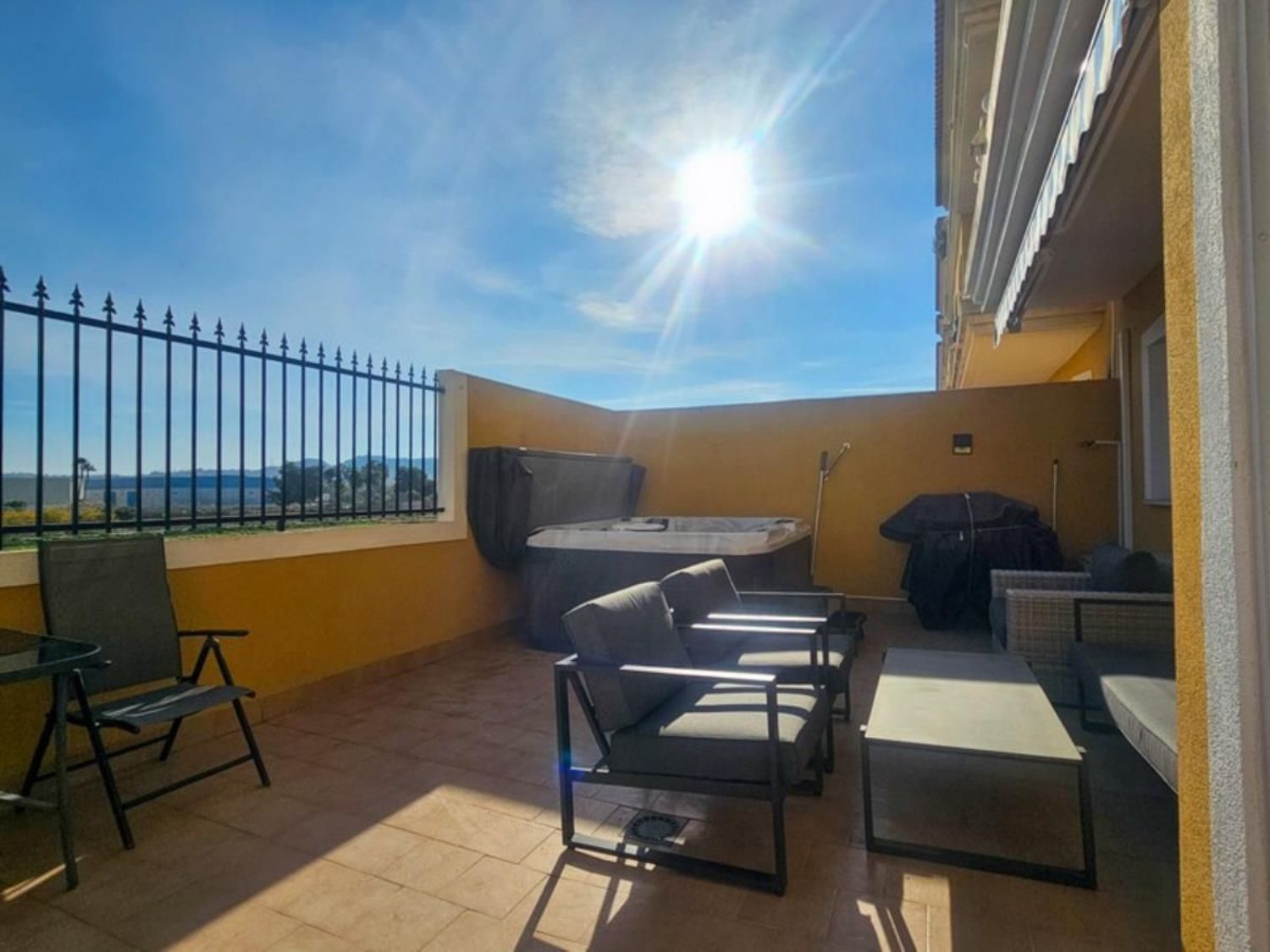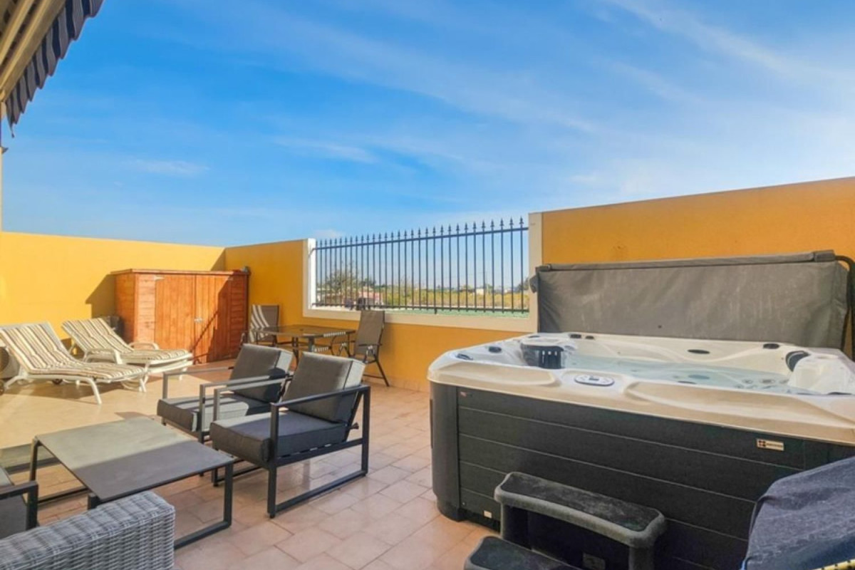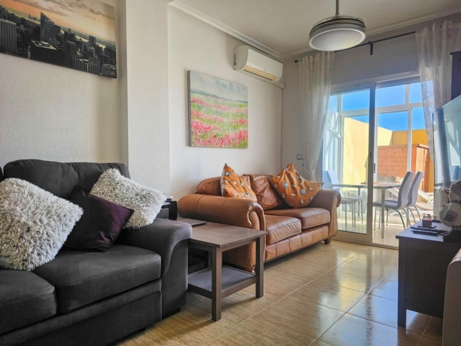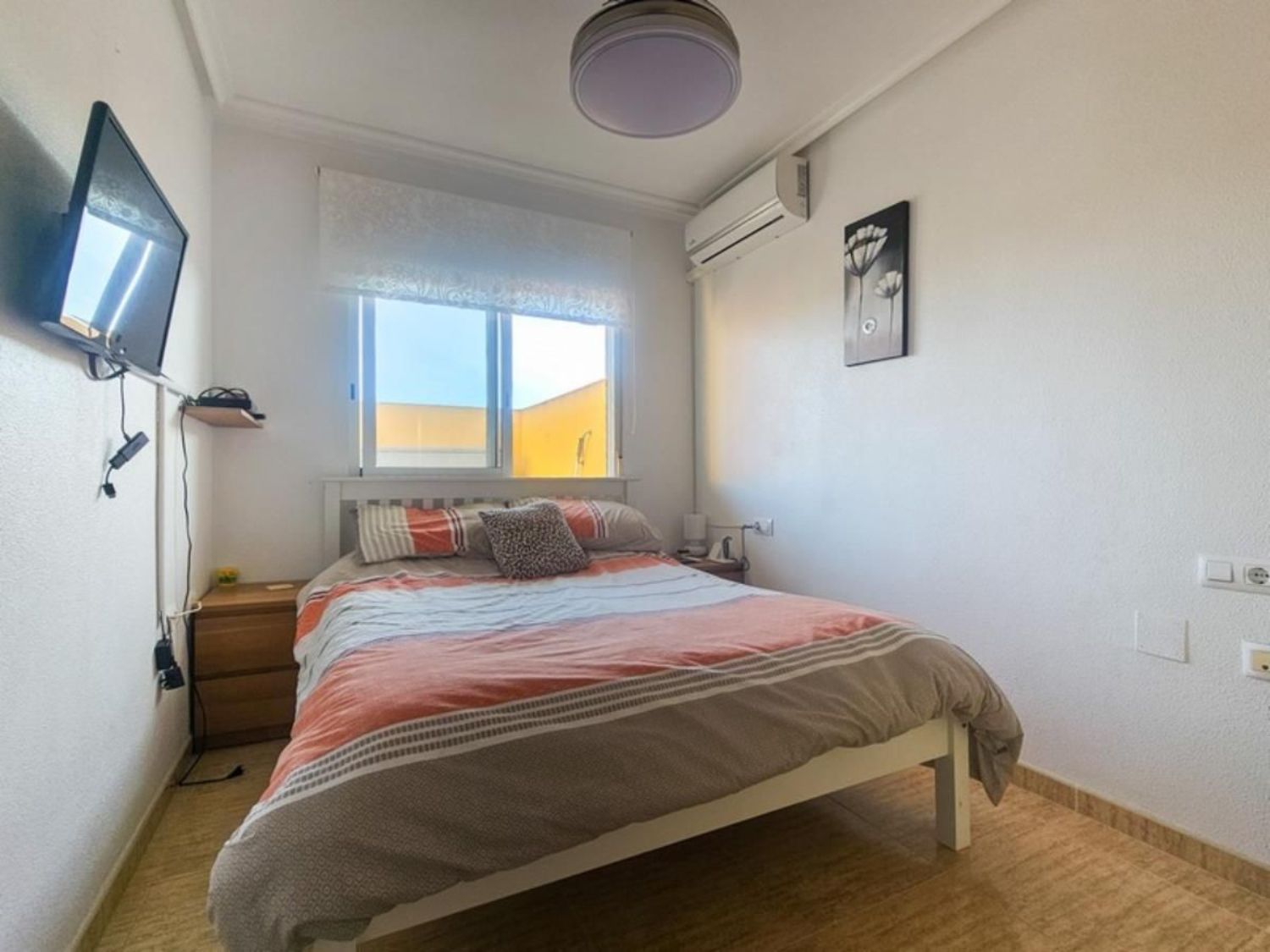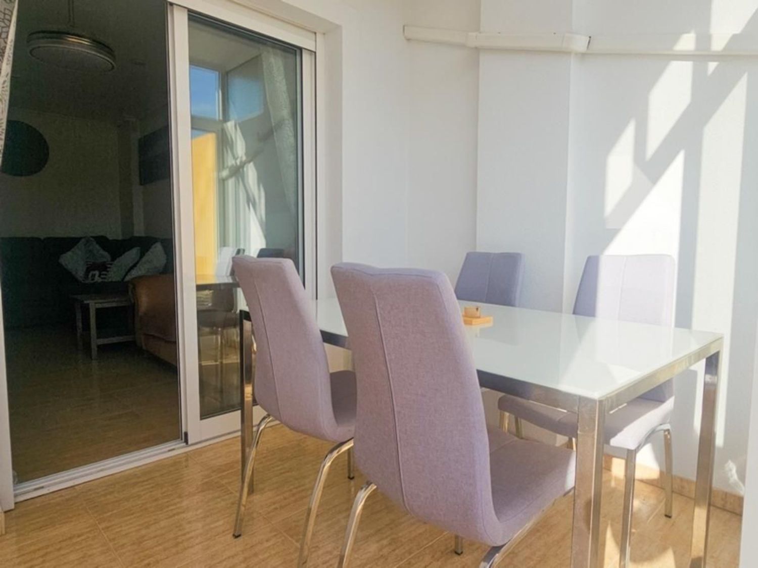 El apartamento se ofrece parcialmente amueblado y cuenta con una plaza de aparcamiento privada en el garaje subterráneo. Los residentes tienen acceso a una piscina comunitaria y un solárium en la azotea, al que se accede fácilmente mediante ascensor, brindando un espacio ideal para disfrutar del sol y el tiempo libre.