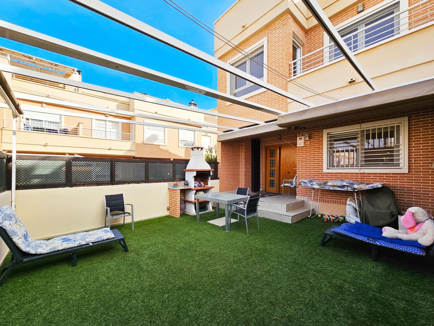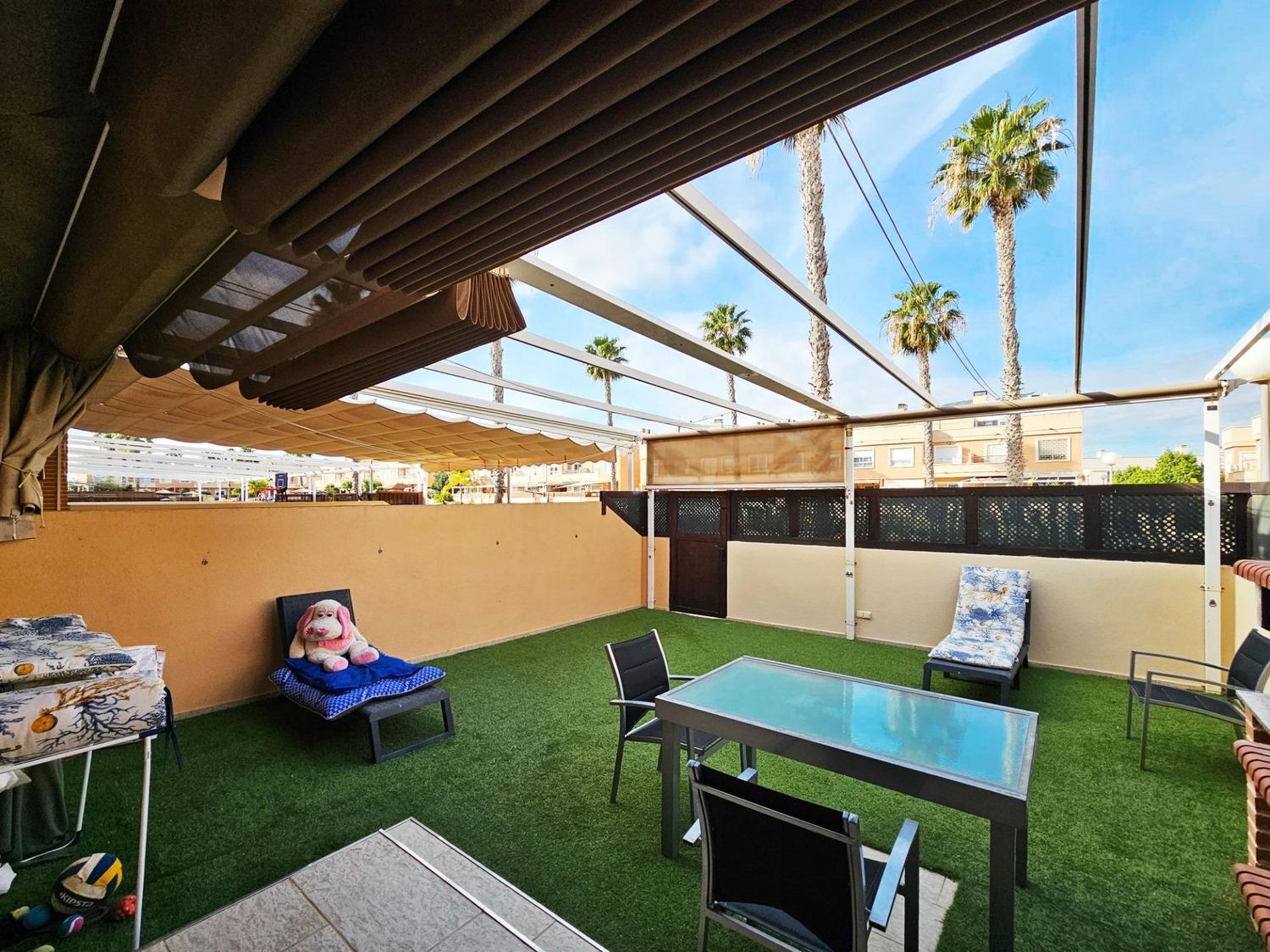 La encantadora terraza es perfecta para disfrutar del aire libre y cuenta con barbacoa, toldos y césped artificial, creando un espacio de relax. Este bungalow se halla en impecables condiciones, listo para ser habitado y, al estar situado en esquina, ofrece un nivel de privacidad superior en comparación con otras propiedades de la misma zona. La comunidad cuenta con piscina y pistas de tenis, y el aparcamiento techado añade una comodidad extra al día a día.
