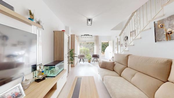 Adosado reformado con solárium y plaza de garaje en primera línea – Playa del Carabassí. Vivienda pareada totalmente reformada, ubicada en urbanización privada frente al mar, en la zona baja de Gran Alacant, a escasos metros de la playa del Carabassí. Dispone de 4 piscinas, pistas deportivas (tenis, pádel, fútbol y baloncesto), club social y restaurante. Distribución: Planta baja: salón-comedor con amplios ventanales, cocina abierta equipada y aseo. Planta primera: dos dormitorios dobles y un baño completo con ducha. Planta superior: terraza-solárium con vistas al mar y a la montaña, cocina exterior y barbacoa. Incluye plaza de garaje subterránea numerada. La vivienda se vende amueblada y equipada con aire acondicionado en todas las estancias. Ubicación excelente a 10 minutos del aeropuerto y cerca de todos los servicios.
