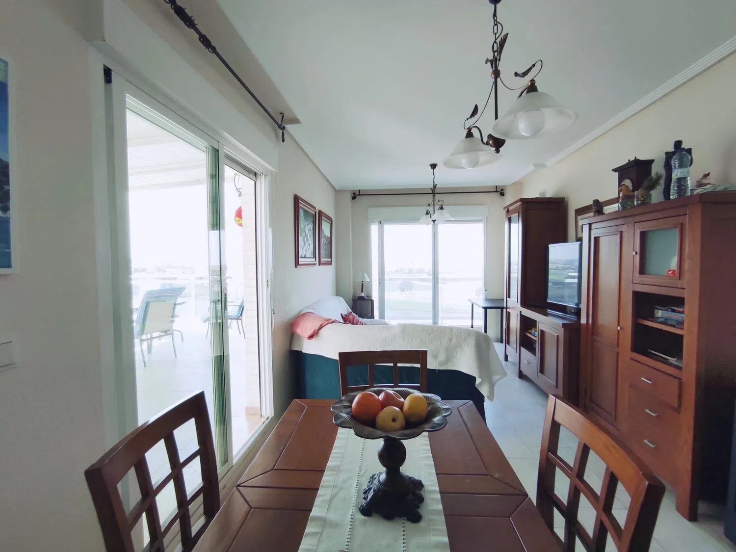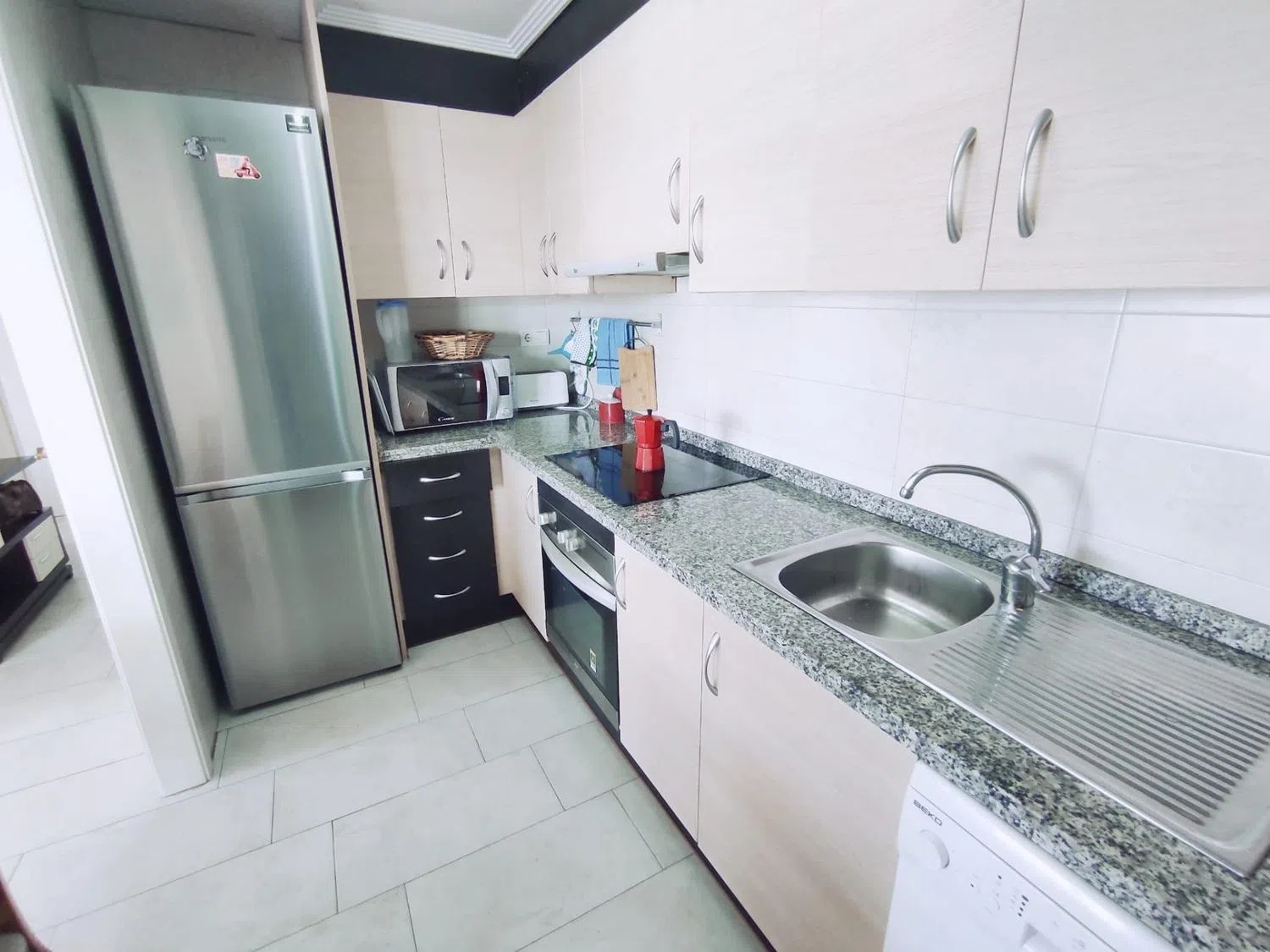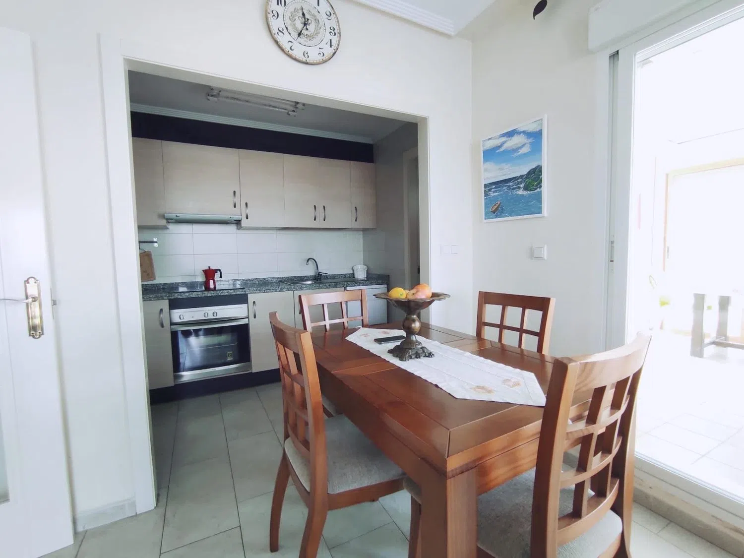 La cocina, abierta al comedor, cuenta con una pequeña despensa, creando un espacio funcional y agradable. El comedor es amplio y luminoso, con acceso a las dos terrazas de la vivienda desde diferentes puntos.