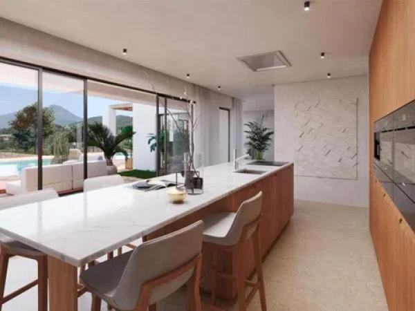 El acceso a la villa es a través de una puerta corredera eléctrica con mando a distancia, que conduce a un amplio espacio de estacionamiento para dos vehículos. Las escaleras dan acceso a la planta principal, donde se despliega un salón-comedor con vistas encantadoras. La cocina abierta, moderna y espaciosa, incluye una isla central y está totalmente equipada con electrodomésticos de primera línea. Esta planta también cuenta con un aseo para invitados y una gran despensa. Desde aquí se accede a múltiples terrazas, adornadas con elegantes pérgolas de madera, a los extensos jardines y a la deslumbrante piscina con clorador salino y sistema de pH.