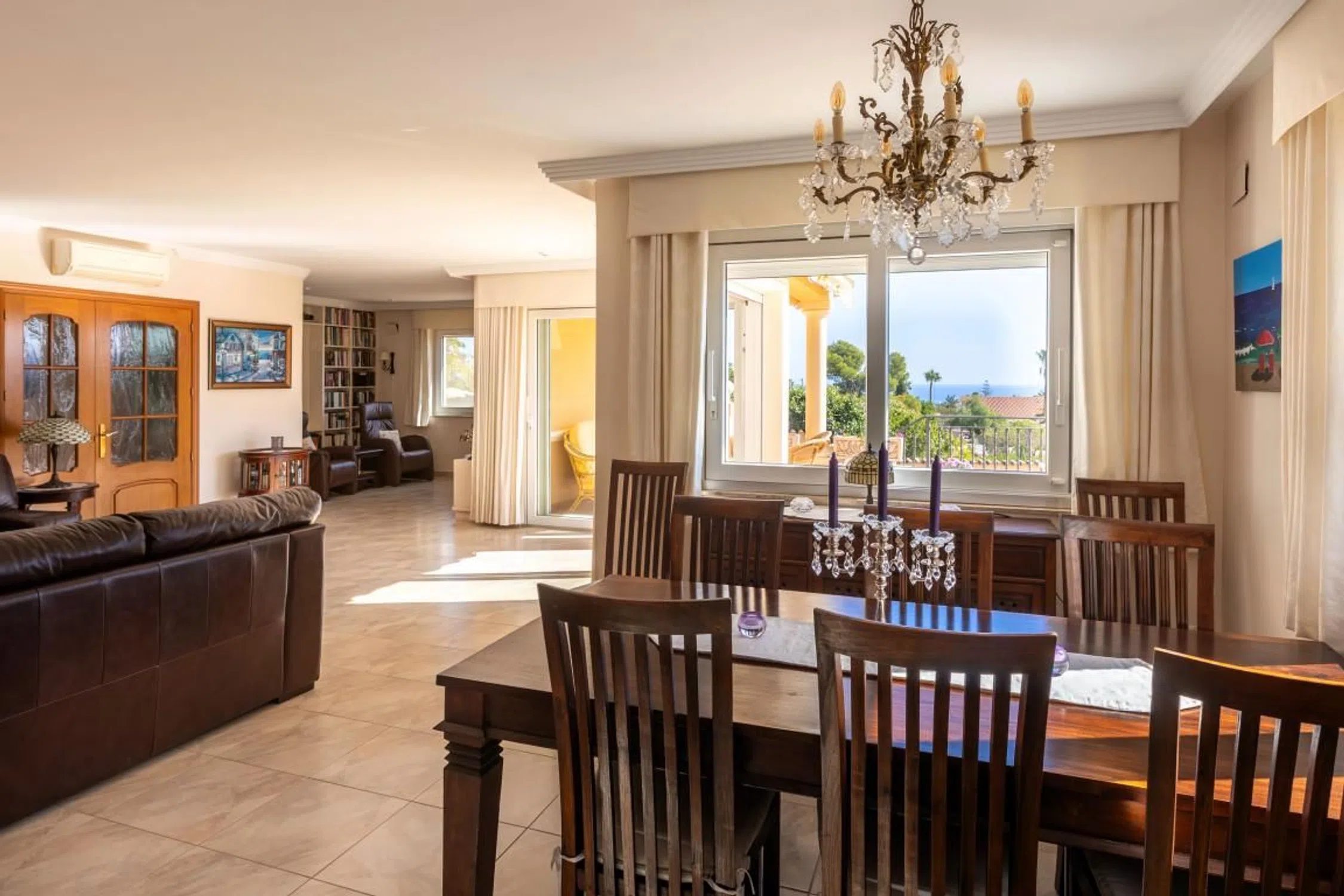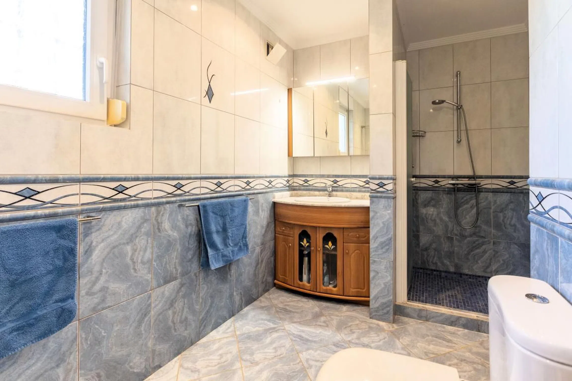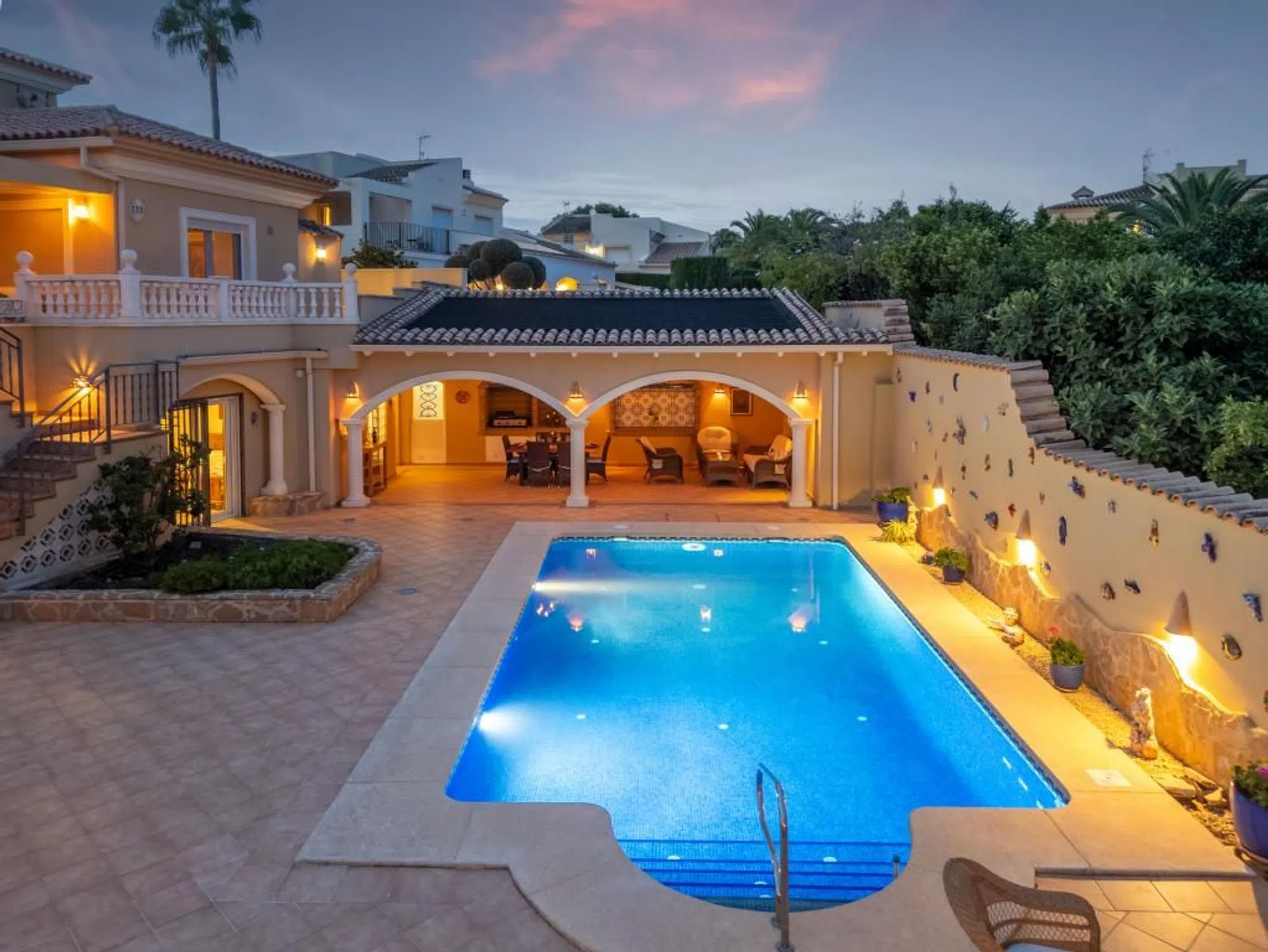 ¡Propiedad fantástica y acogedora en un entorno maravilloso y con preciosas vistas! Propiedad preciosa ubicada en una zona residencial tranquila y popular, a poca distancia del centro de Alfaz del Pi. Todos los servicios necesarios se encuentran cerca, como supermercados, restaurantes, tiendas y transporte público. La zona cuenta con varios colegios internacionales, entre ellos dos colegios noruegos; varios parques temáticos y centros comerciales, magníficas instalaciones deportivas, hermosas playas y rutas de senderismo, además de actividades para todas las edades. El aeropuerto de Alicante está a solo 40 minutos en coche. Descripción de la casa: La casa, construida entre 2005 y 2008, consta de dos plantas más una azotea, con tabiques y columnas de hormigón armado. Las paredes tienen un aislamiento térmico de aproximadamente 40 cm de espesor, con una cámara de aire entre el techo y el tabique (también con aislamiento), y una buena altura de techo en todas las habitaciones (unos 255 cm). Existe una cámara de aire entre la planta baja y el suelo. Se han instalado rejillas de ventilación en todos los dormitorios, salones y baños. La casa goza de gran privacidad, al final de un comunidad de tres viviendas, en la penúltima posición de una calle sin salida. Uno de sus lados linda con el Barranco Fondo, y se encuentra a más de 50 metros de la casa más cercana al otro lado del barranco. La casa está orientada este/sur y ofrece magníficas vistas al mar, con preciosos amaneceres, vistas a la Sierra Helada y, a lo lejos, se divisa el acantilado de Calpe. Interior: • Primera planta (planta de entrada): Recibidor con amplio armario, aseo de invitados con ducha. Escaleras que suben a la azotea y bajan a la planta inferior. Amplio salón con chimenea de gas y sala de TV, además de cocina y comedor. En esta misma planta también hay un dormitorio con baño privado que incluye ducha y bañera. • Planta inferior: Recibidor con acceso al amplio dormitorio principal con vestidor y baño completo con ducha y bañera de hidromasaje. En la planta inferior también hay un dormitorio estándar con armario. Desde el recibidor se accede a una zona de invitados con un amplio salón, preparado para instalar una cocina, así como dos dormitorios y un baño. La zona de invitados tiene su propia entrada desde su terraza. • La casa está muy bien construida, según los estándares noruegos, y cuenta con aislamiento en suelos, paredes y techo. Fresca en verano y cálida en invierno. • Ventanas de aluminio/PVC, de fabricación alemana, con doble acristalamiento y cristal de seguridad en las puertas de patio sin rejas. • Calefacción por agua en todas las plantas, además de suelo radiante eléctrico en el baño conectado al dormitorio principal de la planta baja. También hay calefactores radiantes en todos los baños. • Aire acondicionado/bombas de calor en el salón y el dormitorio. • Aspiradora central con 6 tomas. Exterior: Terraza en la azotea: La terraza ofrece vistas panorámicas de 360 grados a Sierra Bernia, Calpe, Albir con el mar, Sierra Helada, el horizonte de Benidorm y Puig Campana. Está preparada para la instalación de un jacuzzi, con acceso a agua, electricidad y desagüe. Planta baja: Amplio aparcamiento para 2-3 coches. Acceso a la terraza a través de una puerta exterior al salón. Hay un pequeño trastero tras la puerta. Fuera del salón: Amplia terraza con espacio para una zona de estar y una mesa de comedor. Sótano exterior: La piscina de 37 m² cuenta con válvulas de limpieza de fondo automáticas, bomba de contracorriente y sistema de retrolavado automático. La calefacción solar mediante canales de agua en el tejado prolonga considerablemente la temporada de baño. La piscina dispone de un sistema de electrólisis para agua salada. Zona de barbacoa/comedor cubierta al final de la piscina, con espacio para numerosos invitados. Cocina exterior integrada, aseo y ducha independie