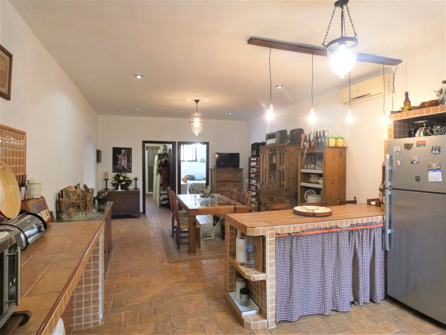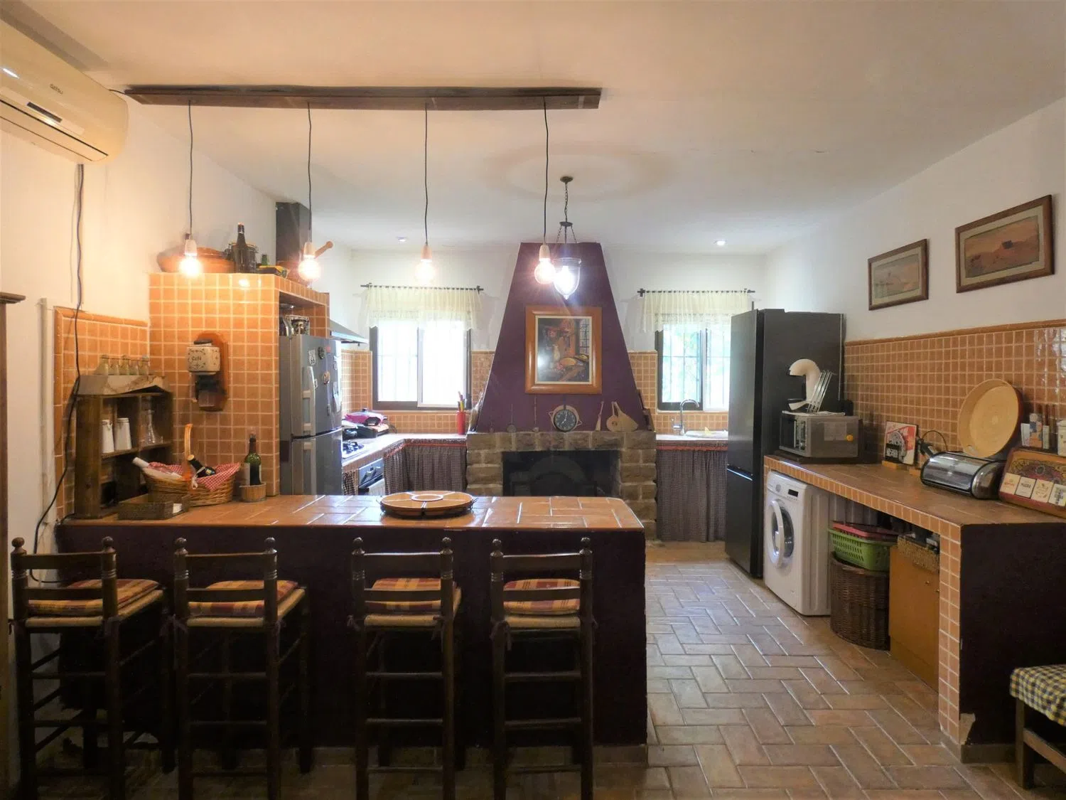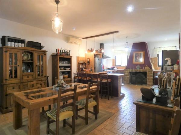Al entrar, serás recibido por una acogedora sala de estar que cuenta con una estufa de hierro fundido, proporcionando un rincón cálido y cómodo para reuniones sociales. Más allá, descubrirás una cocina magistralmente diseñada, con generosas superficies de trabajo y una chimenea que añade un toque especial al ambiente.