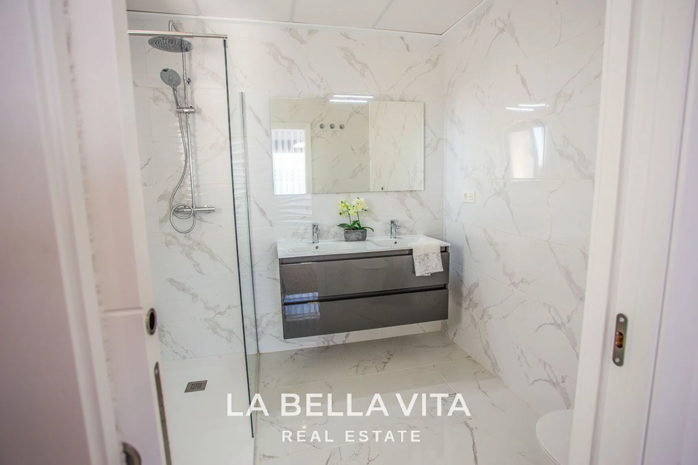 Caracterizada por sus líneas puras, luz natural y una cómoda distribución en una sola planta, esta moderna villa en La Herrada, Los Montesinos, ofrece un ambiente tranquilo y bien diseñado, rodeado del encanto mediterráneo. Detalles cuidados, materiales de calidad y amplios espacios exteriores definen una propiedad creada para una vida contemporánea y sencilla. Diseñada en una sola planta, la villa cuenta con 3 dormitorios y 2 baños, incluyendo un baño en suite en el dormitorio principal. El luminoso salón-comedor se conecta fluidamente con la cocina abierta, creando un espacio práctico ideal tanto para el día a día como para reuniones informales. Grandes ventanales maximizan la entrada de luz natural y ofrecen agradables vistas al jardín y la terraza. Características interiores 3 dormitorios con armarios empotrados 2 baños modernos con mamparas de ducha Calefacción por suelo radiante en todos los baños Muebles de baño con espejos e iluminación integrada Cocina totalmente equipada con nevera, campana extractora, vitrocerámica, horno, lavadora y lavavajillas Preinstalación de aire acondicionado en toda la vivienda Espacios exteriores La villa se encuentra en una parcela privada con un excelente potencial para el desarrollo de espacios exteriores Vida en la propiedad. Un jardín rodea la propiedad, y se puede añadir una piscina opcional para quienes deseen disfrutar al máximo del clima. La terraza ofrece un entorno agradable para comer al aire libre o simplemente relajarse al sol. Además, la propiedad incluye: Puerta automática para coches Preinstalación para carga de coches eléctricos Persianas eléctricas de aluminio en los dormitorios Acristalamiento "Guardian Sun" para una mayor eficiencia energética Calidad y confort La villa incorpora características prácticas diseñadas para mejorar el confort y la durabilidad: Puerta de entrada de seguridad con seis puntos de anclaje Armarios con interiores revestidos de madera, cajones y barras para colgar ropa Materiales y acabados de alta calidad en toda la vivienda Ventanas de doble acristalamiento y aislamiento moderno Ubicación Situada en la zona residencial de La Herrada, Los Montesinos, la villa disfruta de un entorno tranquilo con fácil acceso a todos los servicios esenciales. Tiendas, cafeterías, restaurantes, supermercados, colegios y centros de salud se encuentran en las inmediaciones, creando un entorno cómodo y acogedor. Las playas de Guardamar del Segura y Torrevieja se encuentran a poca distancia en coche, al igual que varios campos de golf de la zona. El aeropuerto de Alicante y las principales vías de comunicación son fácilmente accesibles, lo que hace que viajar sea sencillo y eficiente. Esta villa de nueva construcción de una sola planta ofrece confort, practicidad y un relajado estilo de vida mediterráneo en una de las zonas residenciales mejor comunicadas de la Costa Blanca.