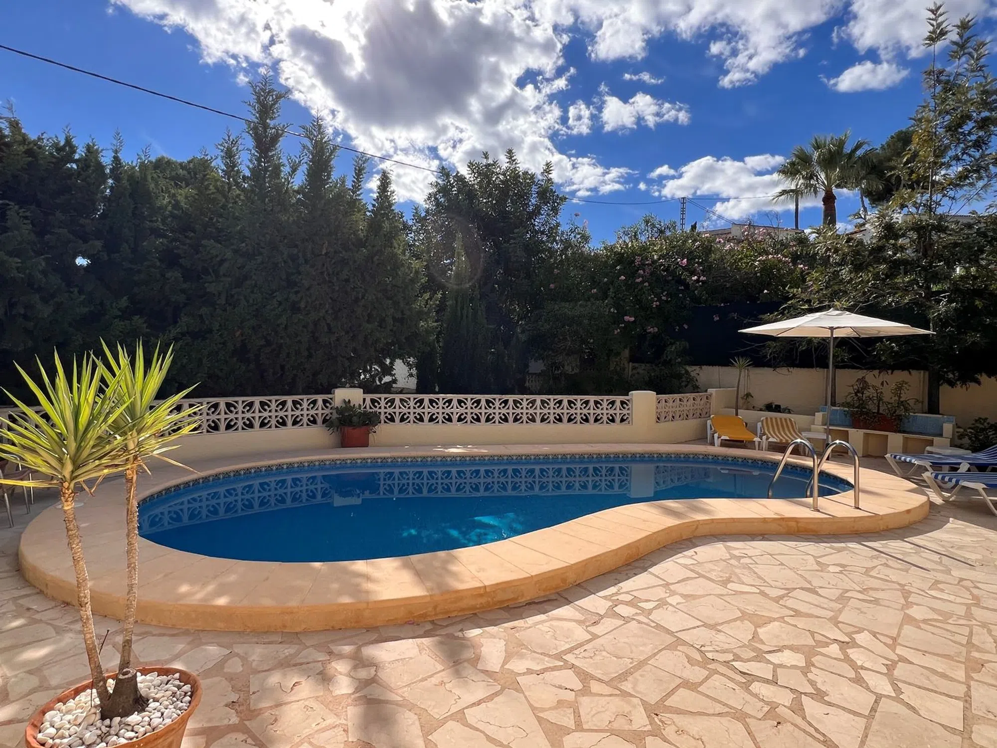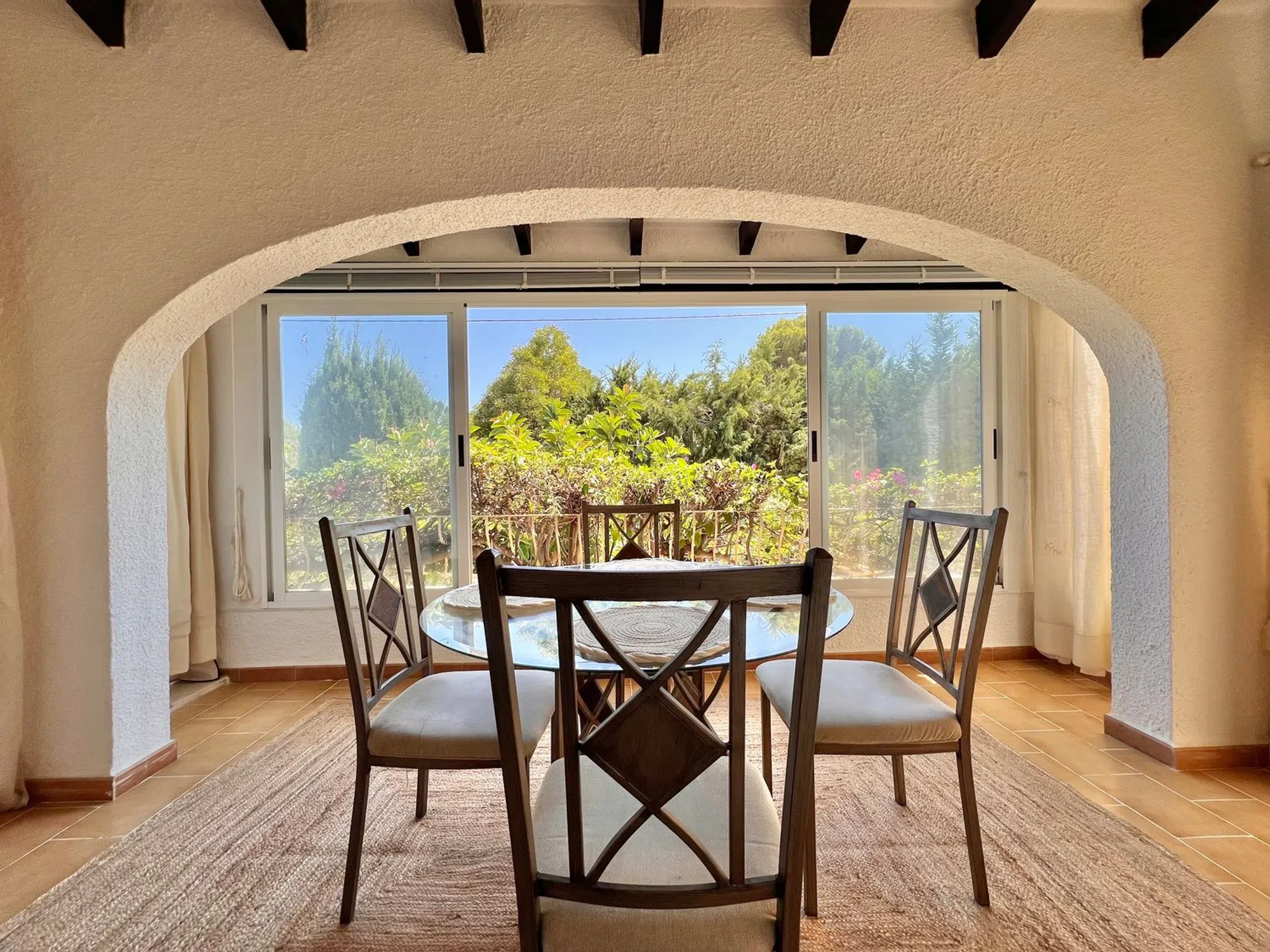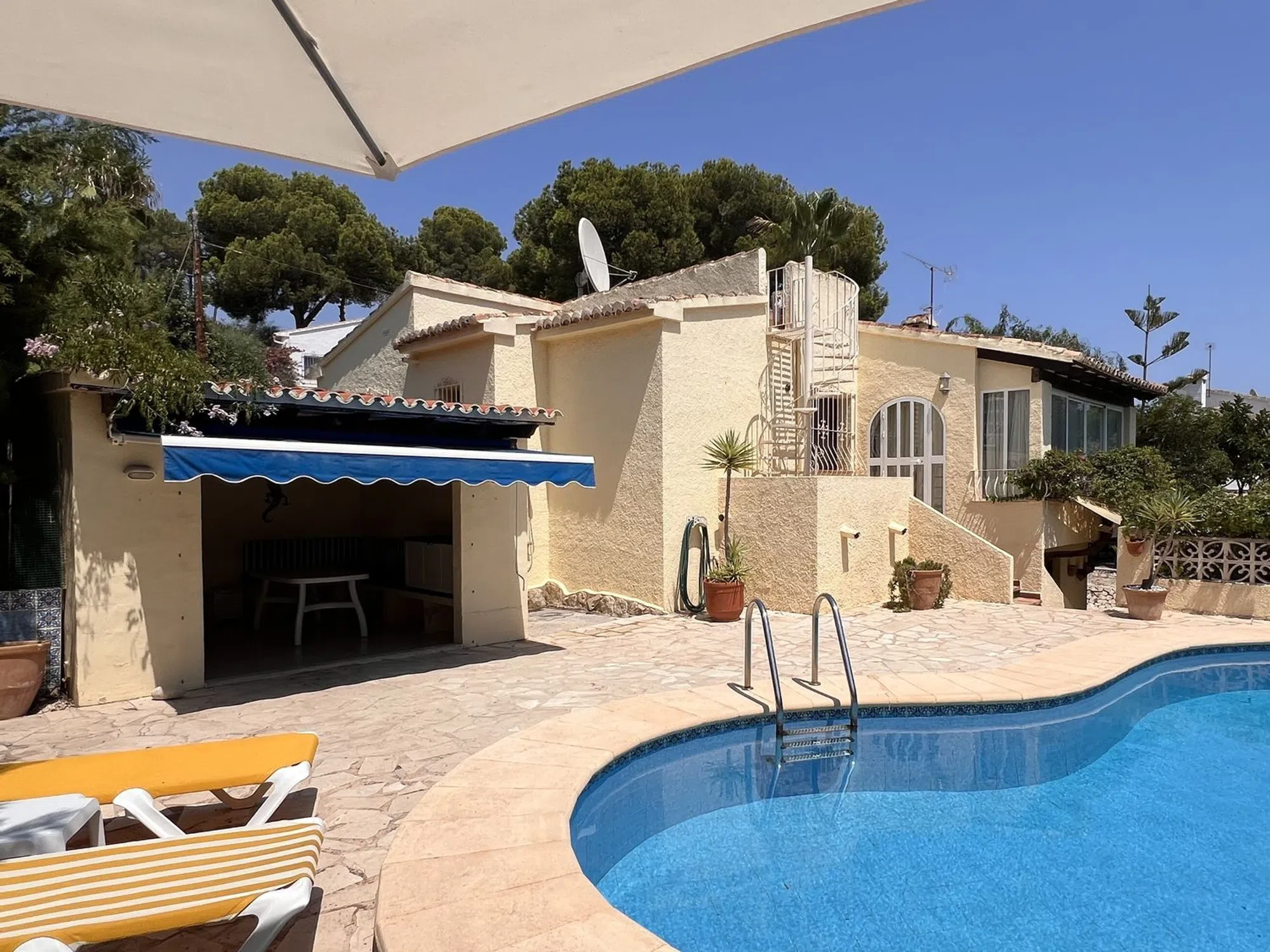 ¿Busca una villa tradicional mediterránea a poca distancia a pie de la playa y del centro de Moraira? Esta espaciosa villa independiente se encuentra en una tranquila calle sin salida en una zona residencial verde. La casa goza de una ubicación excelente, con el centro y la playa de Moraira a poca distancia a pie, y con un bar, restaurante y supermercado a pocos minutos a pie. Amplia parcela llana. La vivienda consta de 2 plantas. En la planta principal: entrada, comedor luminoso con vistas al jardín y acceso a una terraza adicional, acogedor salón con chimenea. Cocina independiente totalmente equipada con puerta exterior. Recibidor con acceso al espacioso dormitorio principal con baño en suite con inodoro, lavabo y ducha, un segundo dormitorio de gran tamaño y baño independiente con inodoro, bañera y lavabo. Ambos dormitorios tienen armarios empotrados. En la planta baja se encuentran el garaje y un dormitorio adicional con baño en suite con ducha y aseo, y una habitación contigua que actualmente sirve de trastero. Una escalera exterior da acceso a la azotea con bonitas vistas de los alrededores y vistas parciales al mar. Exterior: Acceso mediante puerta peatonal y puerta para vehículos. Entrada al garaje. Atractivo jardín con varios niveles y plantas mediterráneas maduras, piscina privada en forma de riñón con solárium, acogedora zona de barbacoa cubierta con comedor. Características: Calefacción central de gas con radiadores. Aire acondicionado en el dormitorio principal. Ventanas de madera y aluminio.