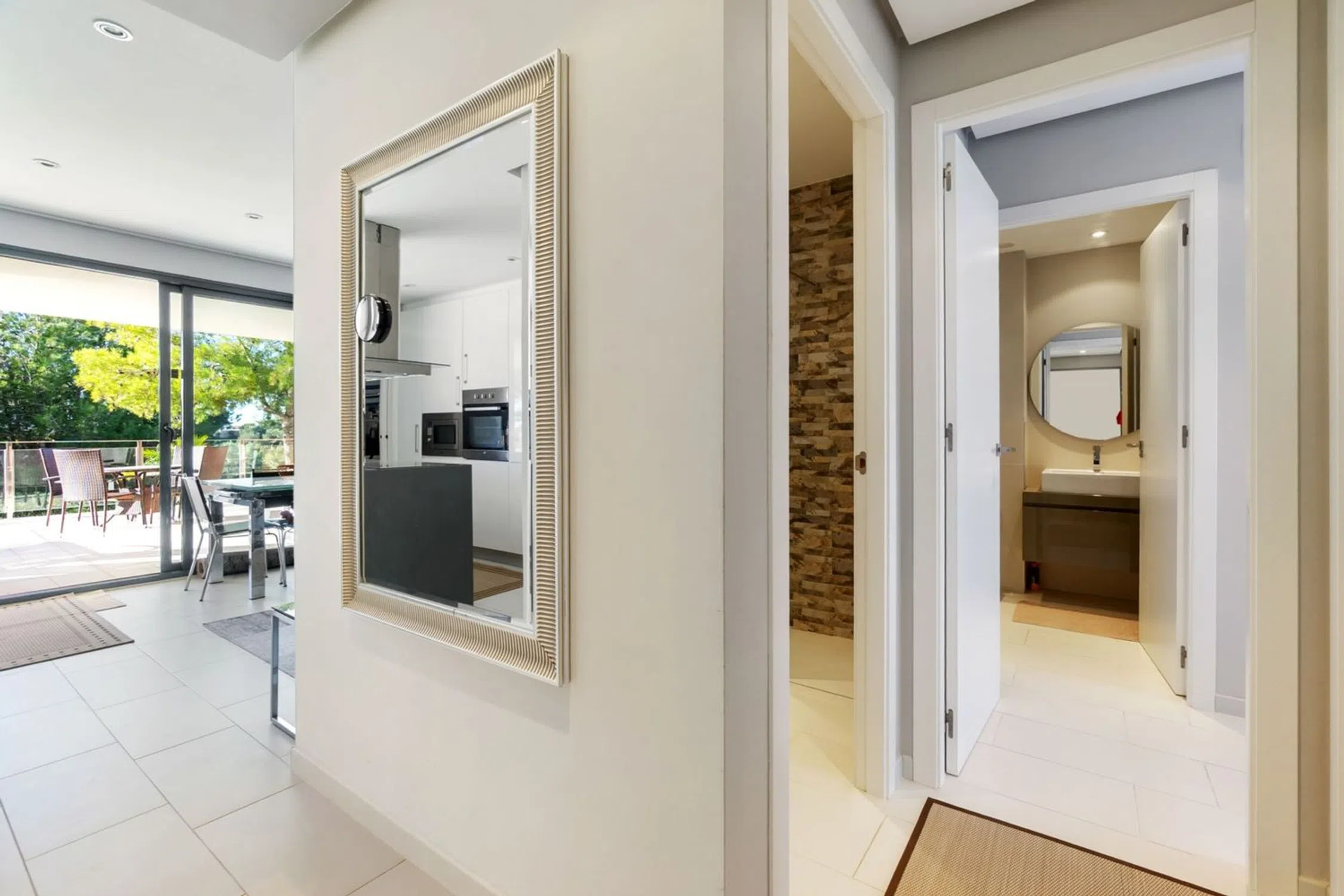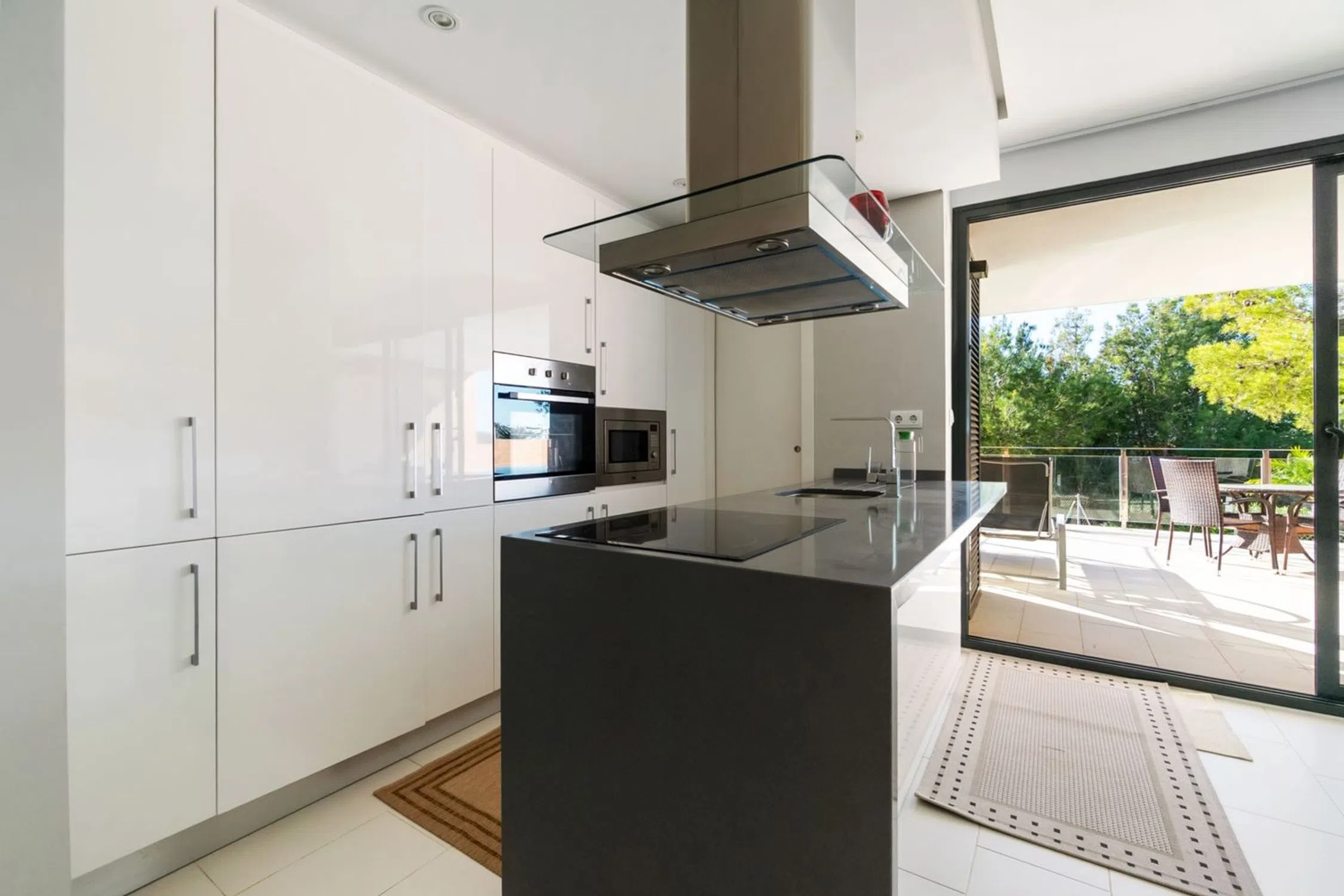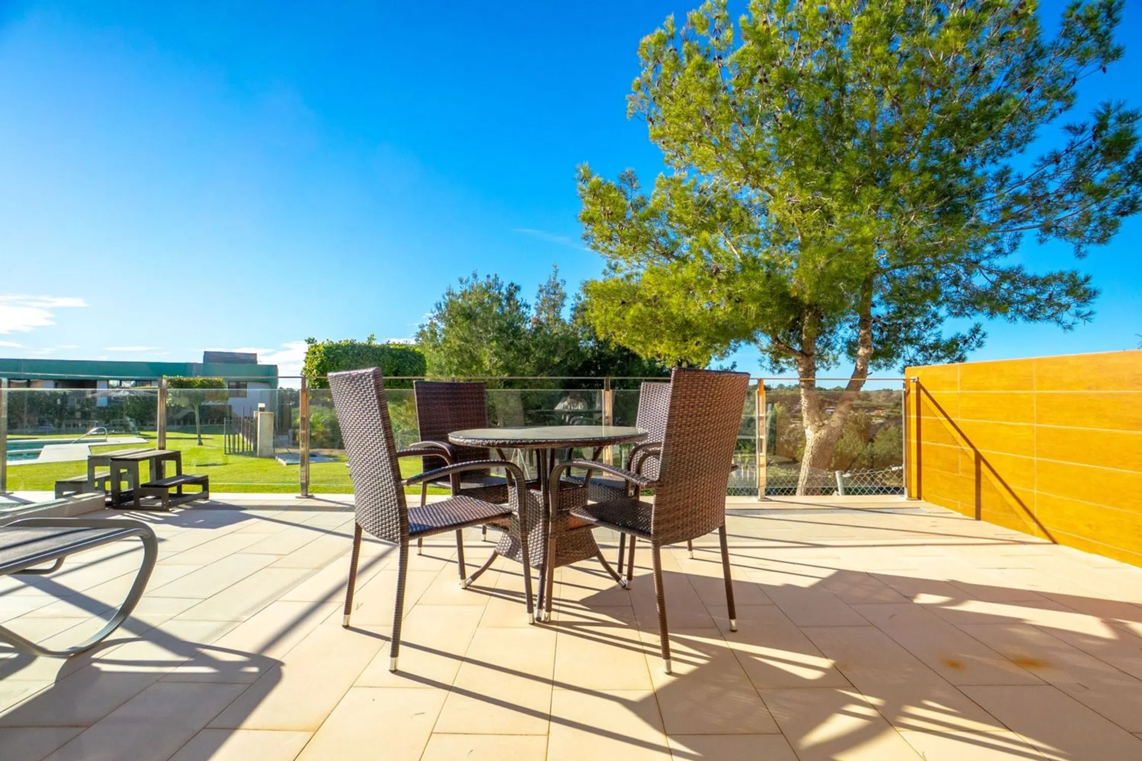 Bienvenido a esta armoniosa y cuidada residencia en planta baja, ubicada en una de las zonas verdes más populares de Villamartín. Aquí vivirá en contacto con la naturaleza y a poca distancia de todos los servicios, ya que encontrará una amplia gama de restaurantes, bares y tiendas en la calle Estrecho de Bonifacio y la popular plaza de Villamartín. Para los amantes del golf, varios de los campos de golf más famosos de la zona están a poca distancia, como Villamartín Golf, Campoamor y Las Ramblas. Además, podrá llegar al conocido centro comercial La Zenia Boulevard en solo unos minutos en coche, perfecto para ir de compras, disfrutar del ocio y disfrutar de la buena comida durante todo el año. A su llegada, le recibirá un amplio y acogedor patio en la parte delantera de la casa, un lugar ideal para tomar un café por la mañana, cenar al aire libre o relajarse a la sombra. También dispone de aparcamiento privado, si lo desea, para mayor comodidad y seguridad en su día a día. Al cruzar la puerta, le recibe un interior luminoso y acogedor con una distribución óptima entre la cocina y el salón. Las amplias superficies acristaladas inundan la casa de luz natural y crean un ambiente maravillosamente diáfano. La moderna cocina está elegantemente decorada con puertas claras, soluciones de almacenamiento bien pensadas y una amplia superficie de trabajo, perfecta para quienes disfrutan cocinando y socializando al mismo tiempo. Desde el salón, se abre otro espacio fantástico: una soleada terraza orientada al sur con vistas a la exuberante piscina. Aquí podrá disfrutar del sol desde primera hora de la mañana hasta última hora de la tarde, relajarse en una tumbona o preparar la mesa para disfrutar de largas y deliciosas comidas bajo el cálido aire mediterráneo. La propiedad ofrece dos amplios dormitorios, ambos con espacio para una cama doble y con puertas de cristal que dan al patio delantero, creando una agradable conexión entre el interior y el exterior. El dormitorio principal también cuenta con un elegante baño en suite para mayor comodidad y privacidad. Ambos baños están elegantemente diseñados con materiales modernos y equipados con ducha. Toda la casa está impregnada de una combinación de colores equilibrada y acogedora que, junto con el elegante interior, crea una sensación muy agradable: todo lo que tienes que hacer es mudarte y comenzar a disfrutar. La piscina compartida de la asociación es realmente especial. Sus amplias aguas azules están rodeadas de exuberante vegetación, amplias zonas para tomar el sol y sombrillas que evocan la vida en un resort y la relajación total. Aquí podrá refrescarse en los días calurosos, pasar el rato con amigos o simplemente disfrutar del hermoso entorno.