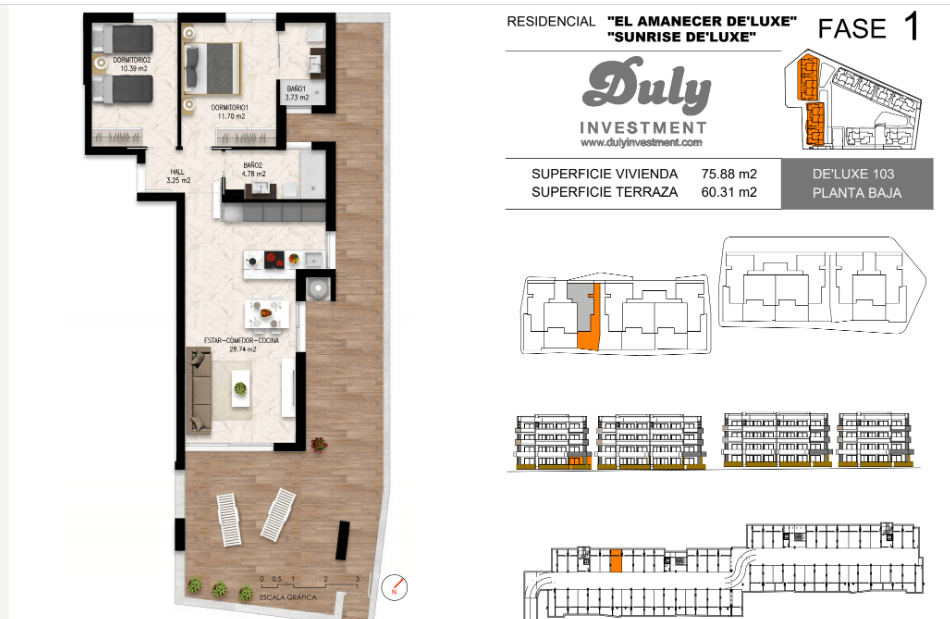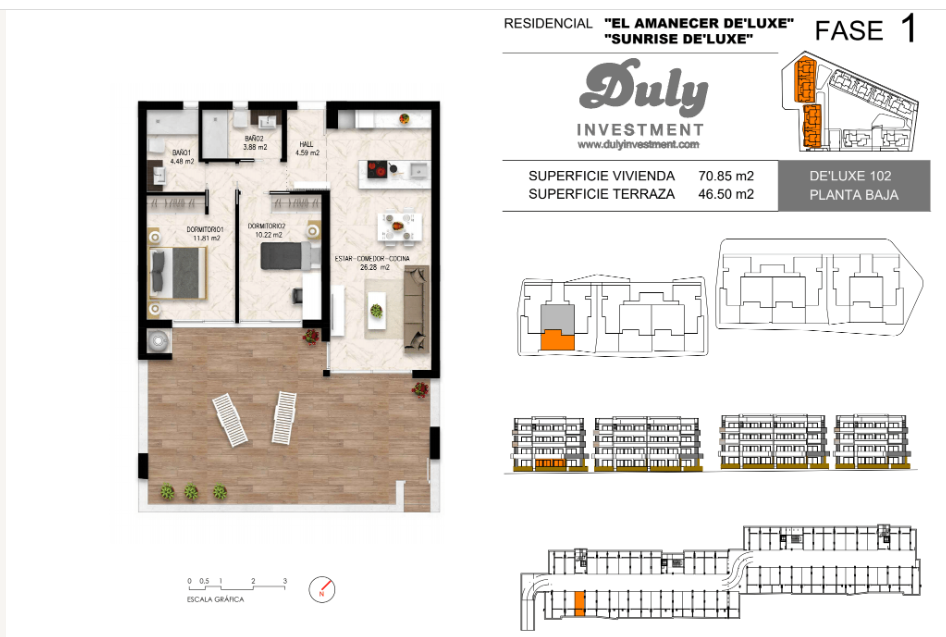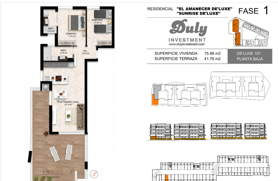 El residencial Amanecer de´Luxe está compuesto por 144 apartamentos de lujo con amplias terrazas. El total de 144 viviendas está dividido en 10 bloques que a su vez tienen planta baja, primera, segunda y áticos con terraza y solárium privado. Cada uno con su ascensor individual.