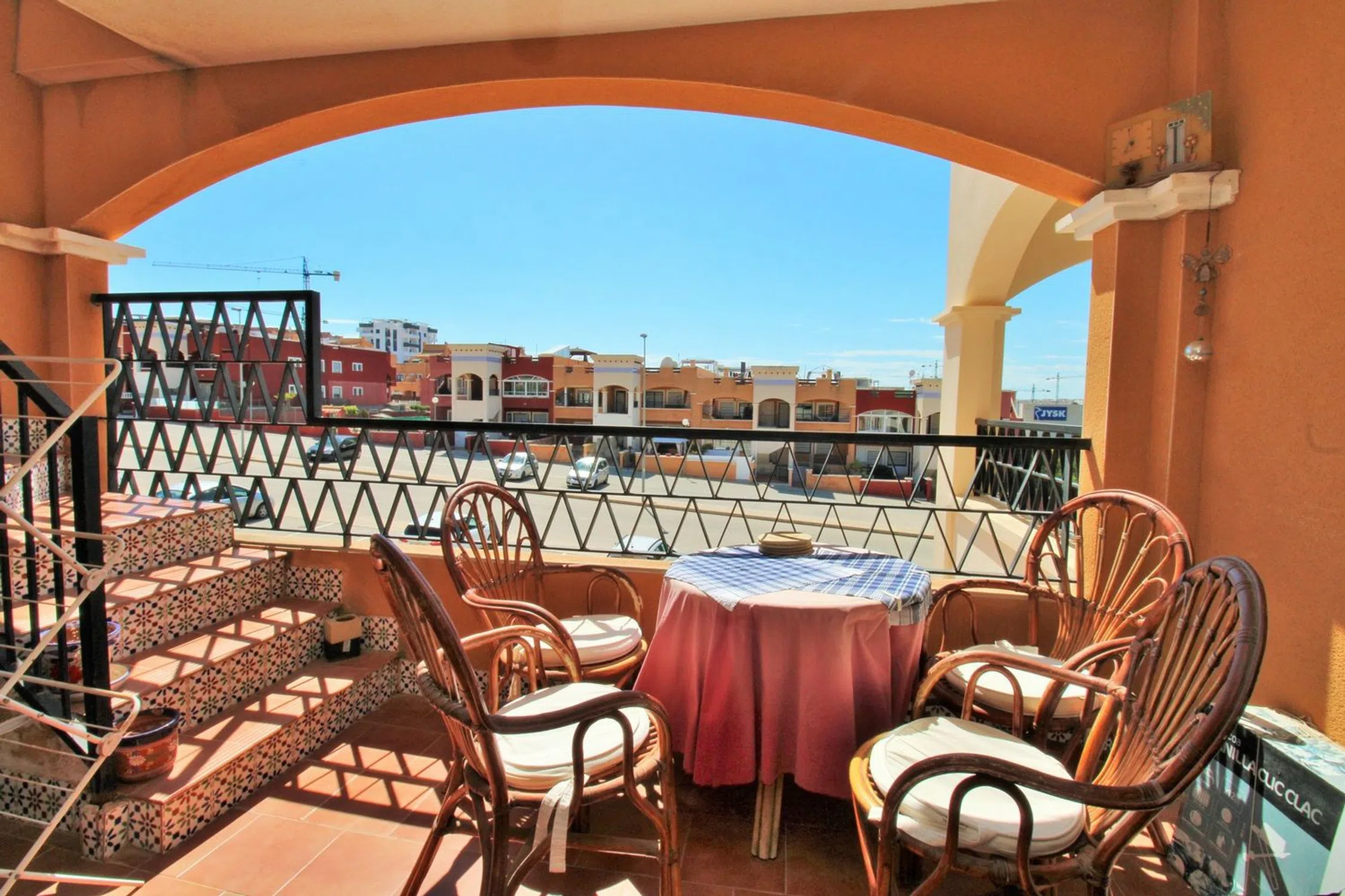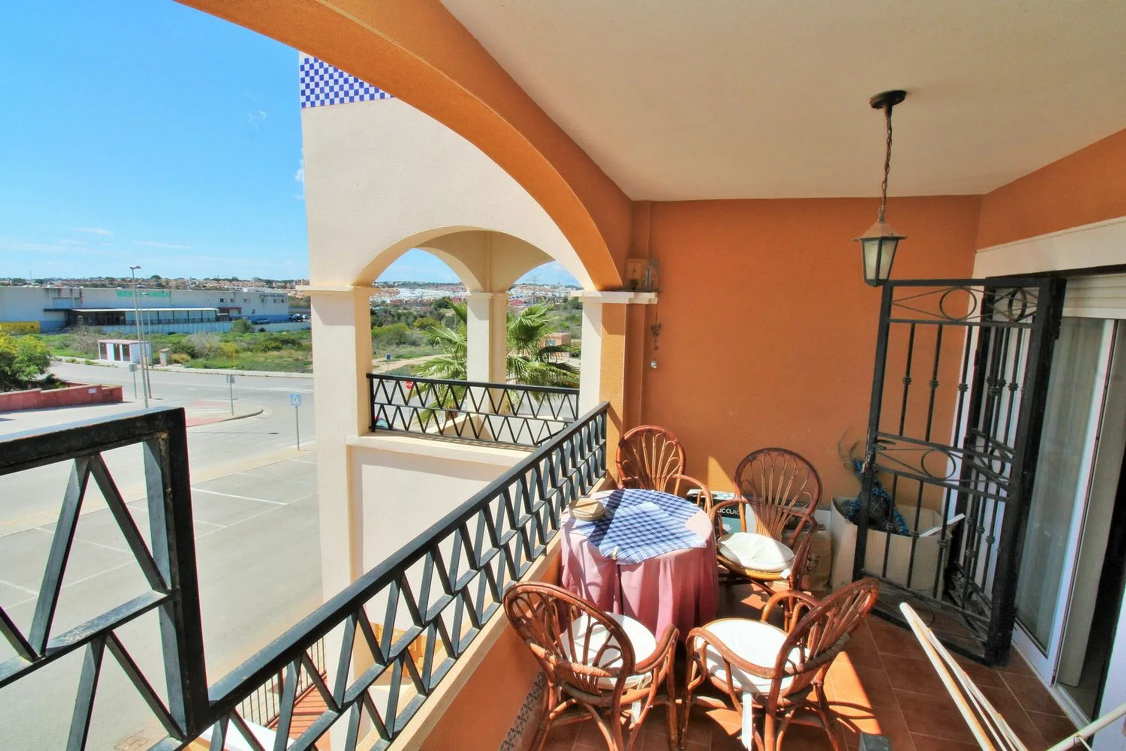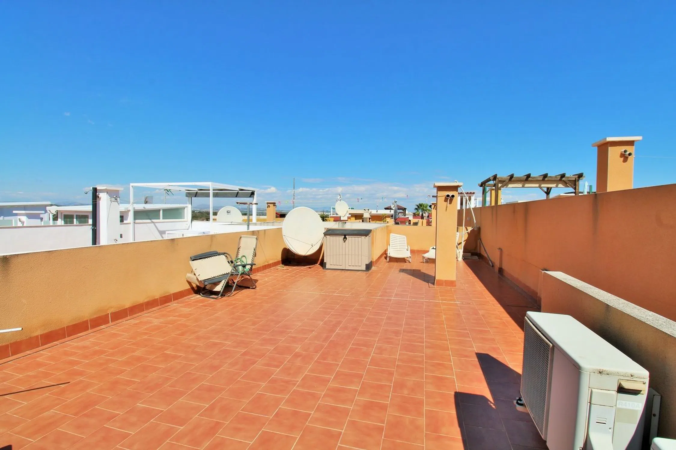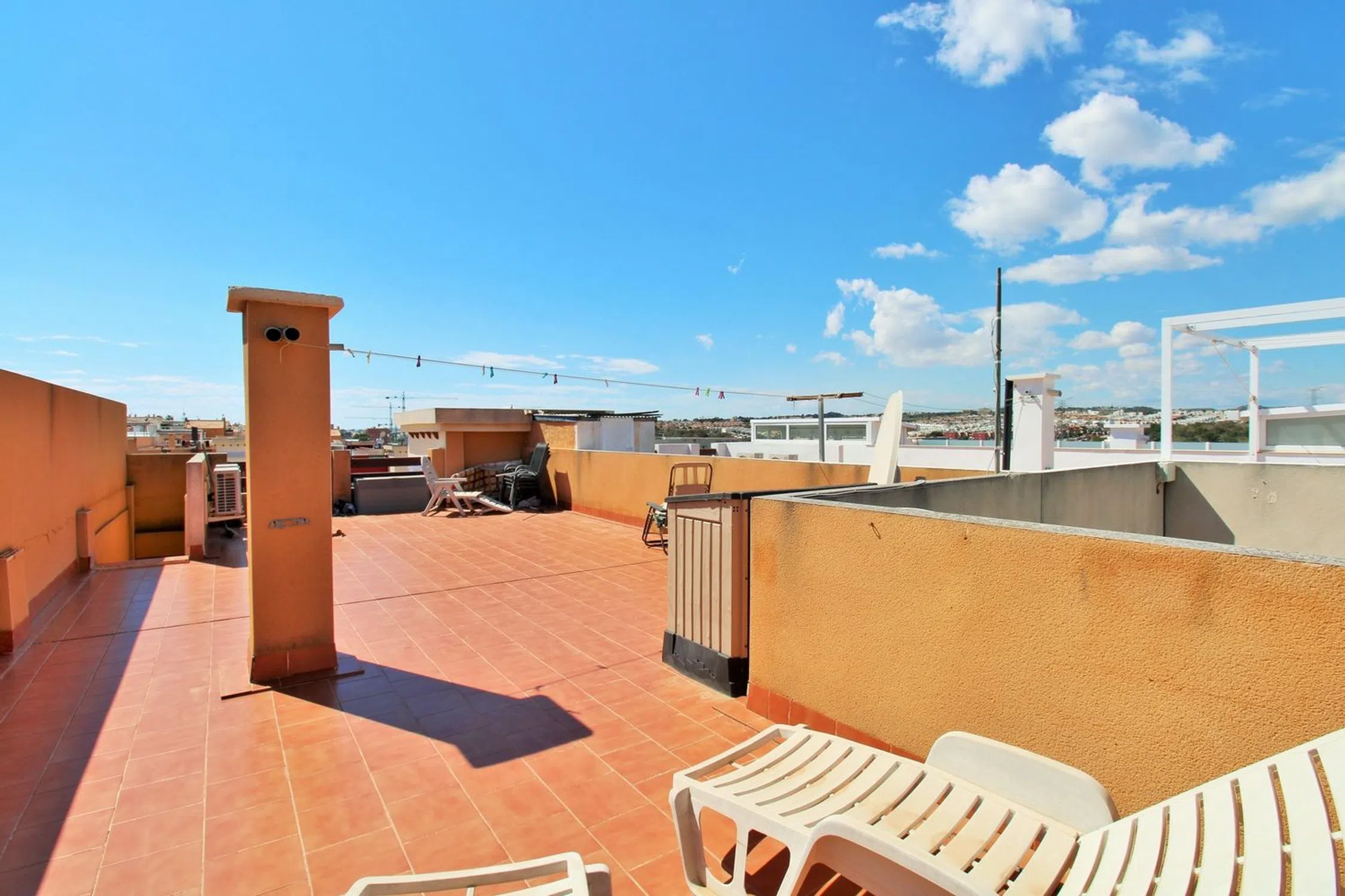 Ático luminoso orientado al sur con dos dormitorios, dos baños y un amplio solárium privado en la azotea, ubicado en la codiciada comunidad Dream Hills II en Los Altos, Orihuela Costa. Disfrute del sol todo el día gracias a su orientación ideal, con acceso a una piscina comunitaria y aparcamiento. Convenientemente situado a poca distancia de un supermercado y del centro comercial Via Park III, que ofrece una variedad de bares, restaurantes y tiendas. El apartamento cuenta con un salón-comedor bien proporcionado, una cocina independiente en la parte trasera, dos dormitorios con armarios empotrados y dos baños. En el pasillo hay armarios adicionales. Las puertas francesas del salón se abren a un balcón cubierto orientado al sur, con una escalera exterior que conduce al impresionante solárium privado en la azotea, un espacio ideal para barbacoas, entretenimiento o simplemente para tomar el sol. Se vende amueblado y equipado con aire acondicionado. Dream Hills II se encuentra en la frontera entre Orihuela Costa y Torrevieja (Los Balcones), lo que proporciona un excelente acceso a la autopista AP-7 y a la carretera costera N-332. El aeropuerto de Alicante está a menos de 45 minutos en coche. Se recomienda una visita temprana.