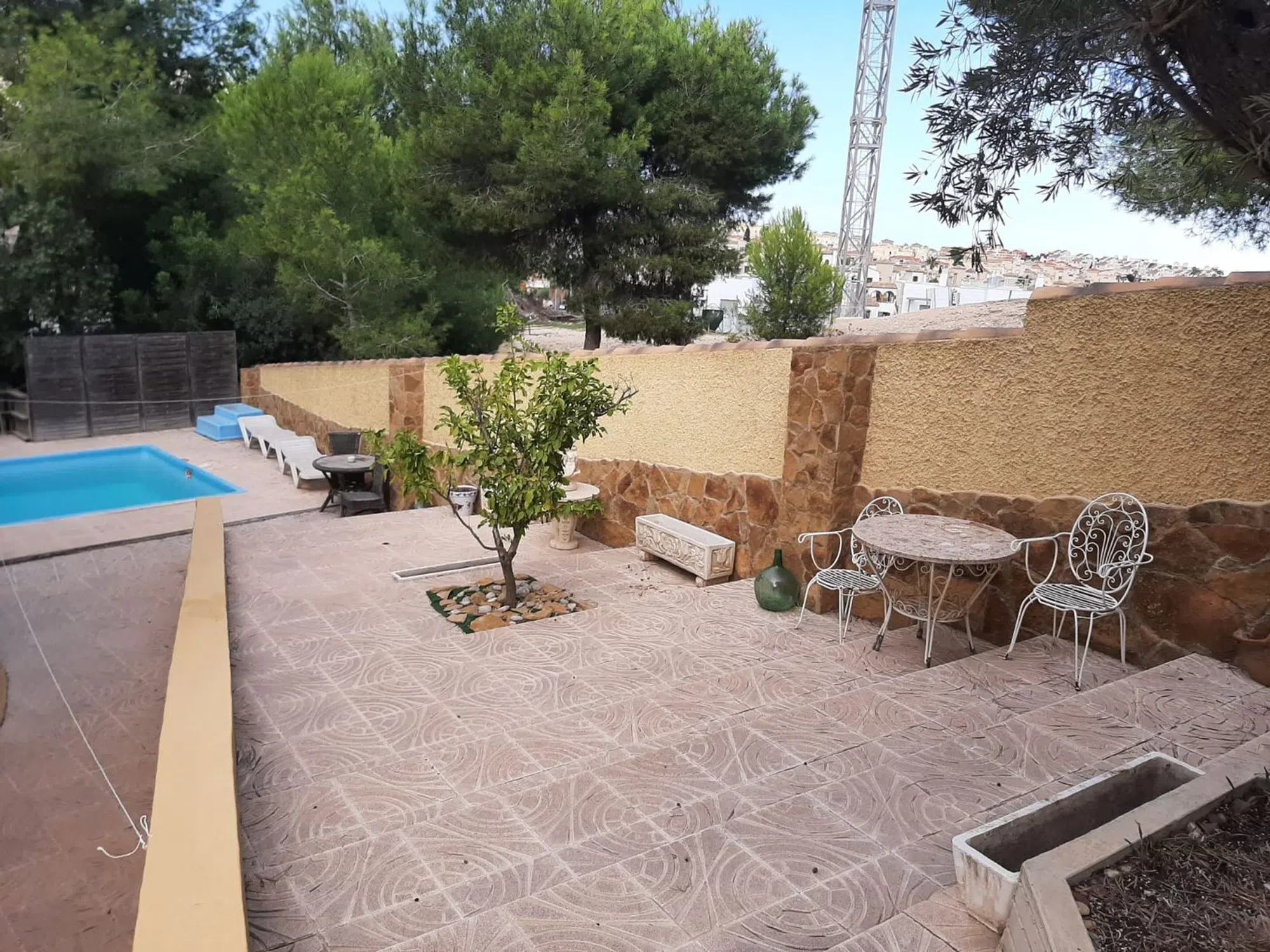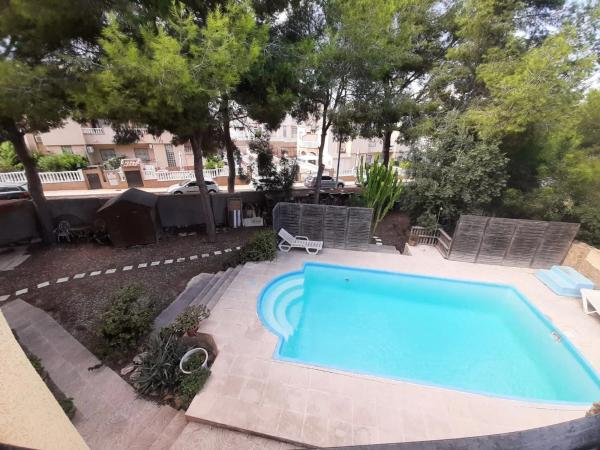 Chalet independiente con piscina privada en venta en Orihuela Costa – Alicante. Esta amplia villa independiente con piscina privada se encuentra en Las Filipinas, rodeada de varios campos de golf: Las Ramblas, Villamartín y Las Colinas Golf & Country Club están a menos de 10 minutos en coche. El centro comercial La Fuente y los grandes supermercados están a solo 1,5 km. La casa se distribuye en amplio salón comedor con cocina semiindependiente y 6 habitaciones, 3 en la planta baja: salón, 5 habitaciones, 2 baños (1 con bañera y otro con ducha). La planta baja es la sala de estar principal y se accede a ella a través de una amplia terraza. Consta de un recibidor, un espacioso salón con comedor y una cocina semiabierta. Desde aquí, se accede a la planta superior, con una acogedora y luminosa sala de relax (ideal para leer), un dormitorio doble y un baño. La calefacción se realiza mediante caldera de gasoil y 14 radiadores distribuidos por toda la casa. Parcela de 800 m² con pinos, espacio para varios vehículos, preciosa piscina privada y zona de barbacoa. Sótano de unos 90 m² aproximadamente (en caso de alquiler quedaría cerrado) EN VENTA: 450.000 € Para más información llame al.