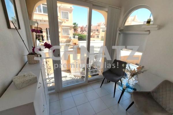 Casa adosada en venta en Villamartín. Preciosa casa adosada renovada, con solárium y jacuzzi, totalmente amueblada. Esta casa adosada en esquina de 3 dormitorios y 2 baños, recientemente renovada, ofrece la combinación perfecta de comodidad y estilo. Situada en una comunidad bien cuidada con piscina comunitaria, la vivienda está lista para entrar a vivir y se vende completamente amueblada, ideal para vivir todo el año o como vivienda vacacional. Cuenta con una luminosa y espaciosa sala de estar de planta abierta que fluye a la perfección hacia una cocina de generosas dimensiones, perfecta para recibir invitados o disfrutar de comidas familiares. La vivienda cuenta con un balcón privado y un amplio solárium equipado con jacuzzi, el lugar ideal para relajarse y disfrutar del sol. Cuidadosamente renovada, la propiedad cuenta con radiadores de gas para las acogedoras noches de invierno y un completo sistema de filtración de agua en toda la vivienda. Situada a pocos minutos de bares, tiendas y centros comerciales, esta vivienda ofrece tranquilidad y acceso a todo lo necesario. Una oportunidad llave en mano como esta no se presenta a menudo.