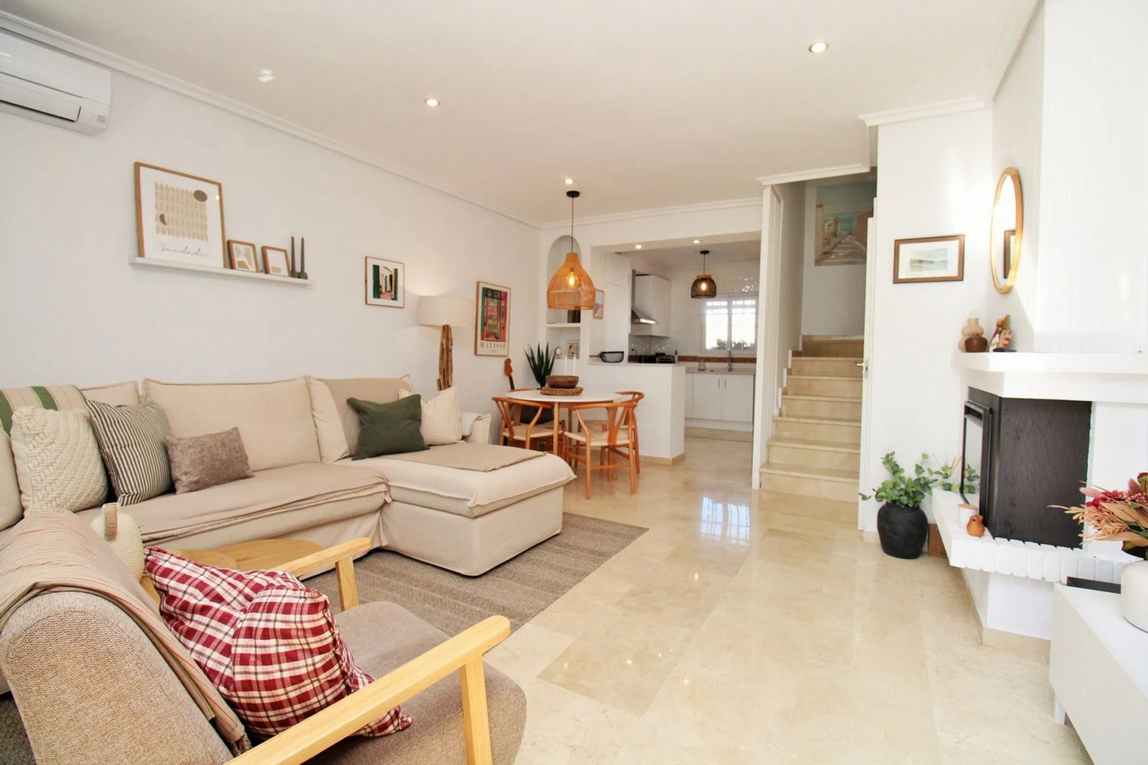 Excepcional adosado modelo Sofía orientado al sur con vistas al mar y a la piscina, situado en la prestigiosa comunidad cerrada R1B de Las Violetas, Villamartin. La propiedad ha sido ampliamente renovada durante el último año con jardines alicatados, terrazas reformadas, cocina nueva, toldos retráctiles y mobiliario y electrodomésticos de alta calidad. Una magnífica oportunidad en una de las zonas más demandadas de Villamartin. Ubicada a solo cinco minutos a pie de la Plaza de Villamartin y del campo de golf, esta vivienda impecable ofrece la combinación perfecta de comodidad, estilo y ubicación. La comunidad dispone de piscina comunitaria y jardines. En la planta baja hay un luminoso salón-comedor con chimenea, una moderna cocina renovada con galería y un aseo. Los jardines delantero y trasero han sido totalmente alicatados, y la terraza elevada con toldos retráctiles ofrece vistas a la zona de la piscina. En la planta superior hay dos dormitorios dobles con armarios empotrados y un baño familiar. El dormitorio principal dispone de un balcón privado orientado al sur con preciosas vistas al mar y a la piscina. Una escalera interior conduce al gran solárium privado con vistas panorámicas al Mediterráneo. La propiedad se vende amueblada, con aire acondicionado, y en perfecto estado. A un corto paseo de restaurantes, bares, tiendas y del golf, y a pocos minutos en coche del Zenia Boulevard y de las playas con bandera azul de la Orihuela Costa. Las viviendas en Las Violetas se venden rápido — visita recomendada.