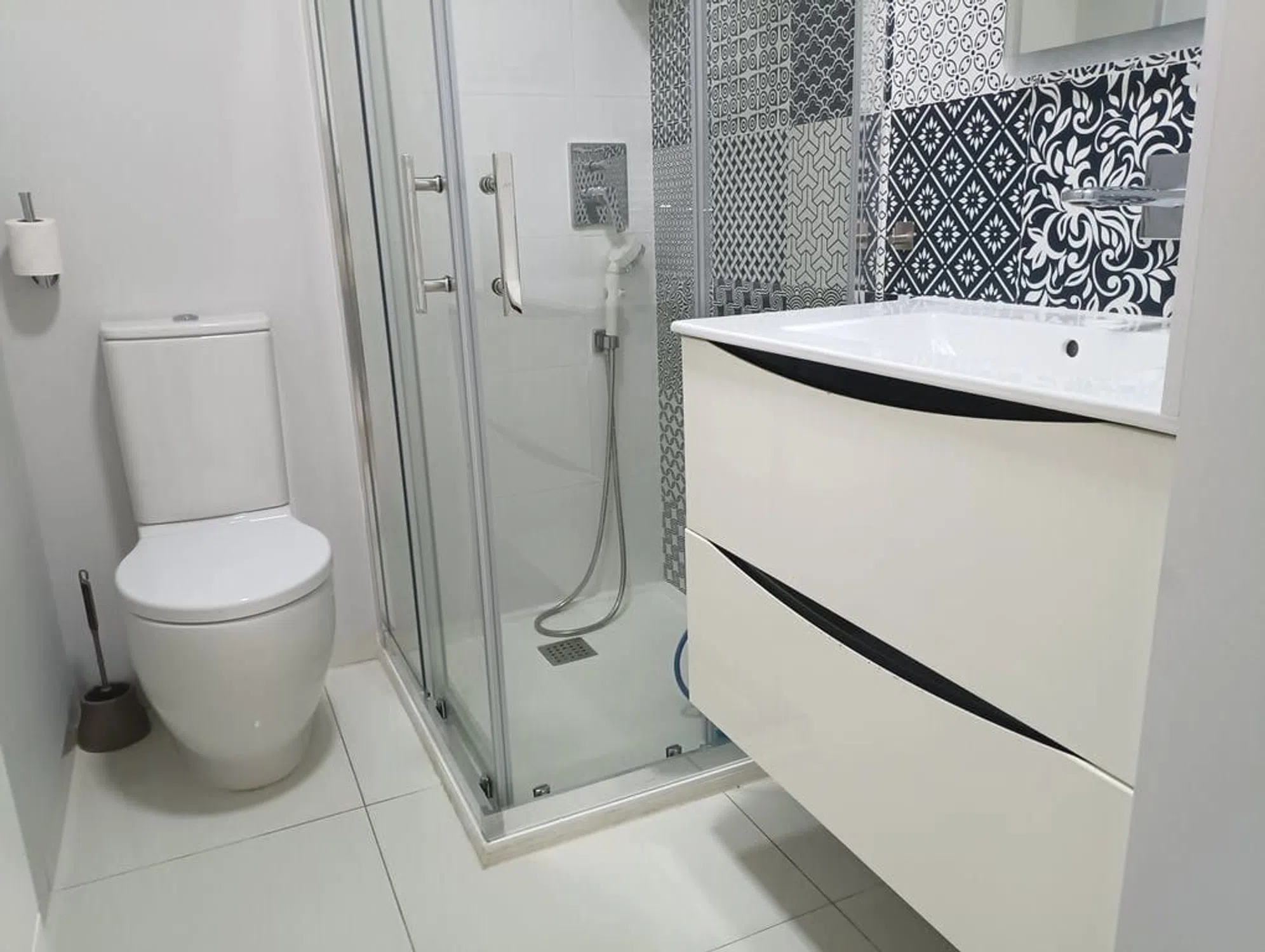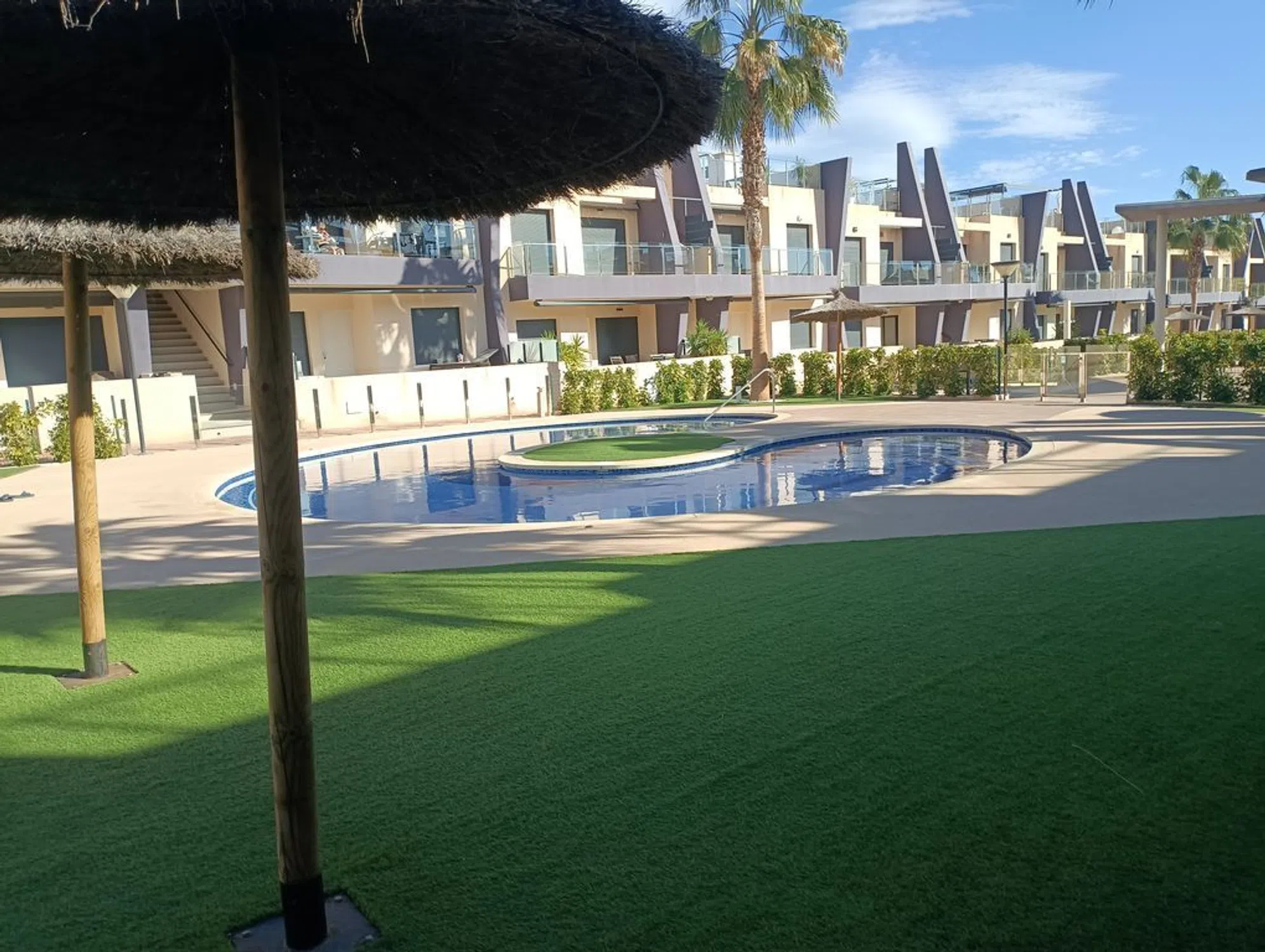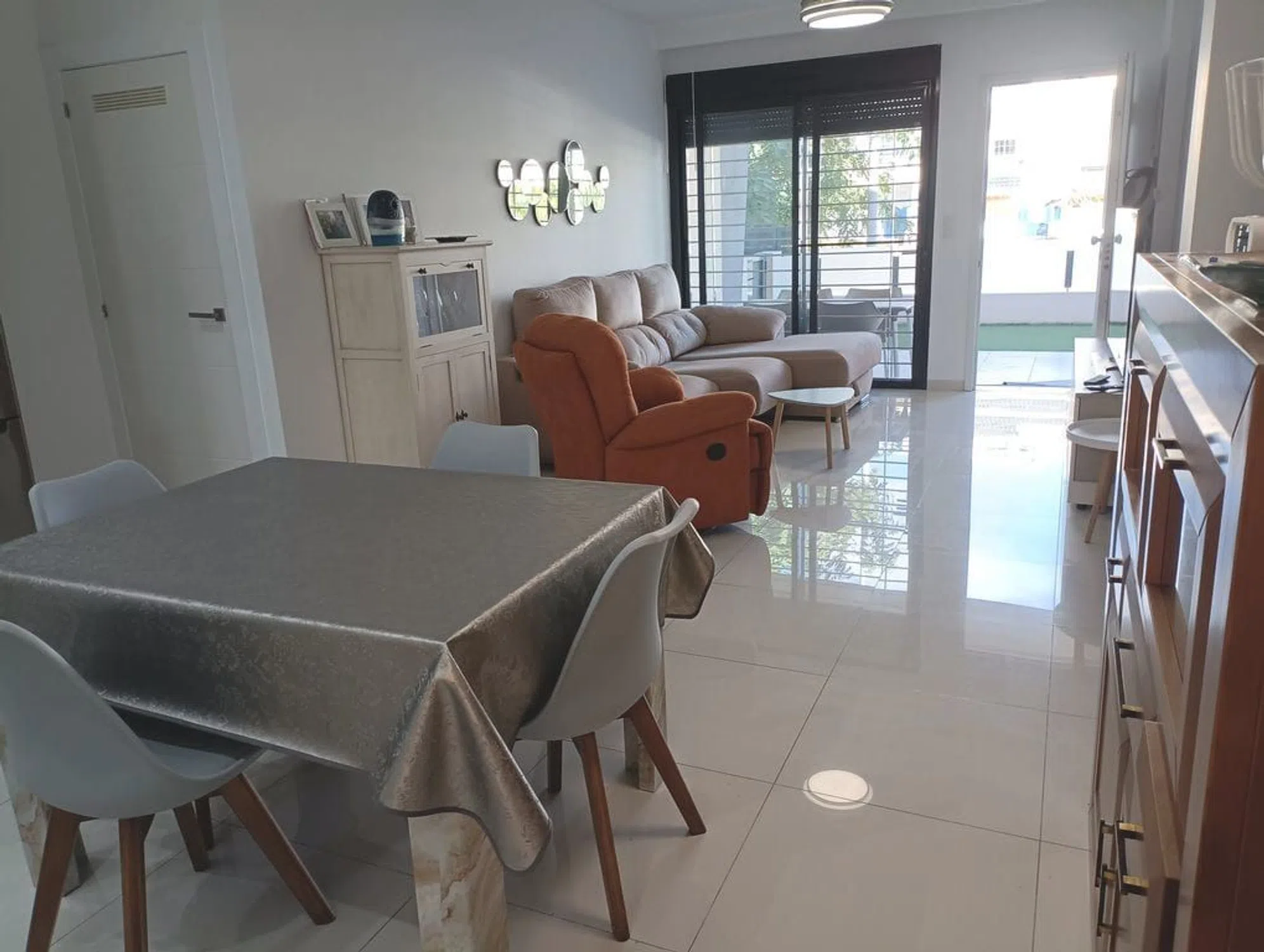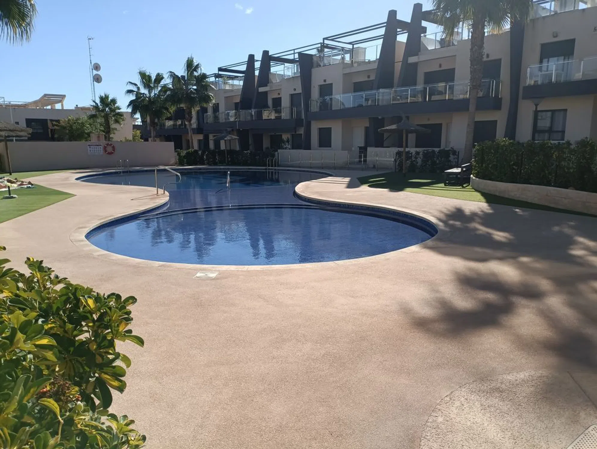 Welcome to this stylish and modern ground floor apartment located in the sought-after area of Mil Palmeras on the Costa Blanca. Here you will live within walking distance of one of the coast's most popular beaches - perfect for those looking for comfortable and beachside accommodation. The apartment offers a well-thought-out floor plan with two spacious bedrooms and two fully tiled bathrooms, one of which is en-suite to the master bedroom. The open kitchen and living room create a light and airy feel with direct access to the private terrace on the ground floor. There is plenty of space for both lounge furniture and a dining area - the perfect place for relaxation or social moments under the Spanish sun. The home is equipped with modern materials, AC with both cooling and heating, and access to a shared pool area. The location is quiet but at the same time central, with restaurants, cafes and shops within a short walking distance. Whether you are looking for a vacation rental, a permanent home, or an investment with rental potential, this ground floor apartment is an excellent choice.