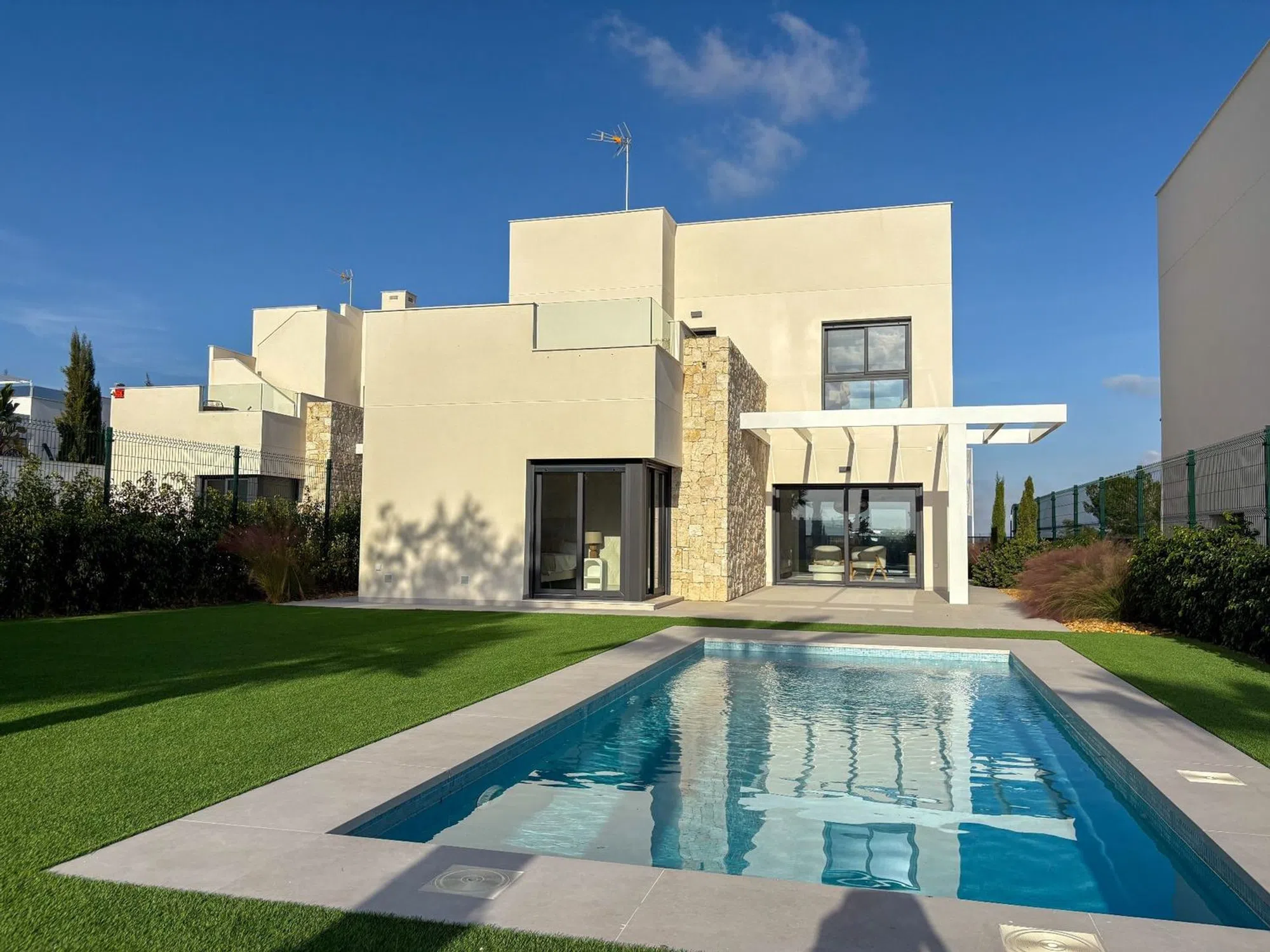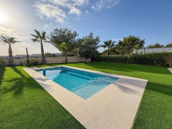 En el exclusivo entorno de Lo Romero Golf, rodeada de naturaleza y con impresionantes vistas al campo y a los lagos, se alza esta villa de lujo que combina diseño contemporáneo, elegancia y confort. Ubicada sobre una amplia parcela de más de 500 m², la vivienda se distribuye en dos plantas con espacios luminosos y abiertos, pensados para disfrutar del clima mediterráneo durante todo el año. En la planta baja, destaca un amplio salón-comedor con grandes ventanales, una cocina moderna y funcional, una habitación con baño en suite, un baño adicional y acceso directo al jardín privado con piscina, donde las vistas al campo de golf se convierten en un auténtico privilegio. La primera planta alberga dos dormitorios, dos baños y una gran terraza con vistas panorámicas al golf y los lagos, además de una terraza adicional orientada hacia la entrada de la vivienda. La propiedad cuenta con plaza de parking privada y se encuentra en una zona en plena expansión, lo que la convierte en una excelente opción tanto como residencia habitual como inversión de alto valor. Una villa única donde el lujo, la tranquilidad y el entorno natural se unen para ofrecer un estilo de vida excepcional en la Costa Blanca. [IW].