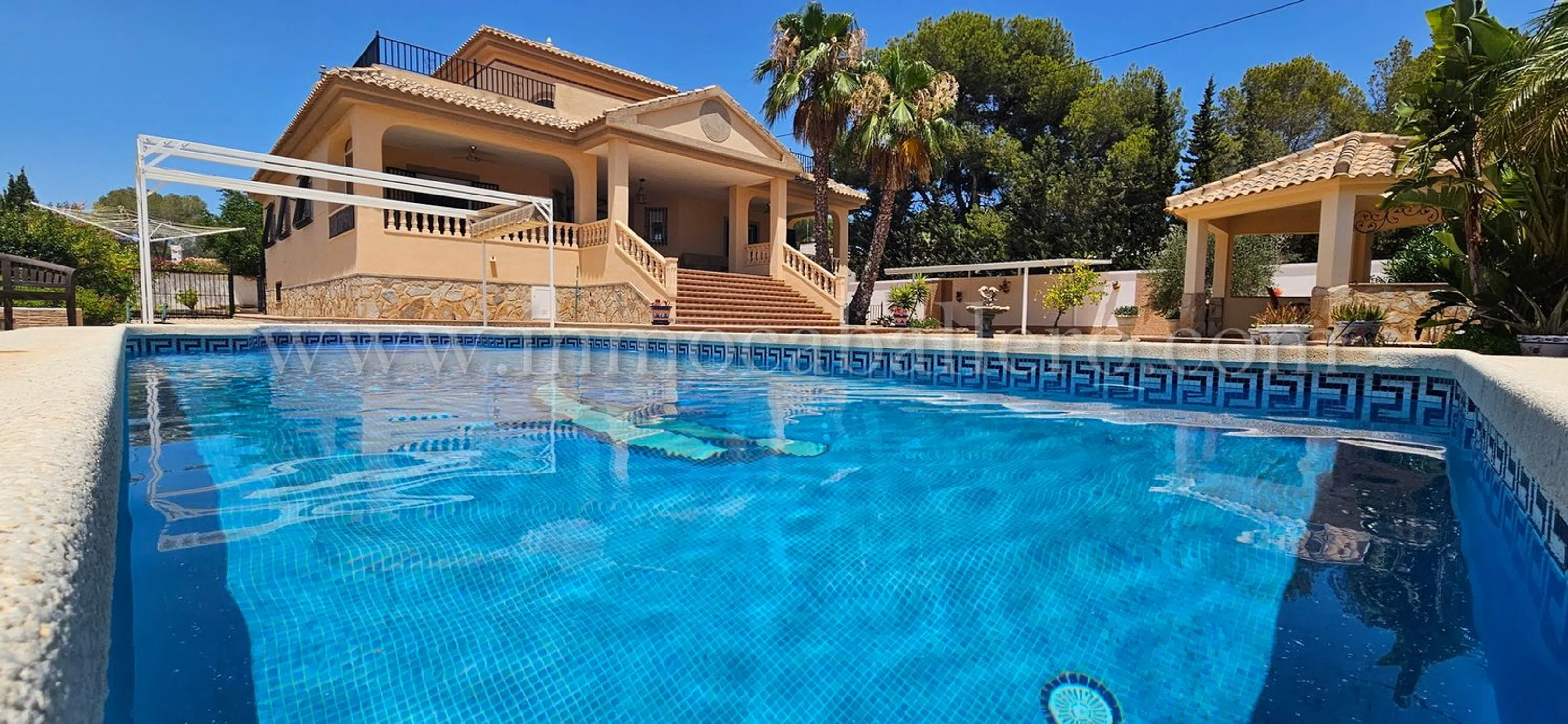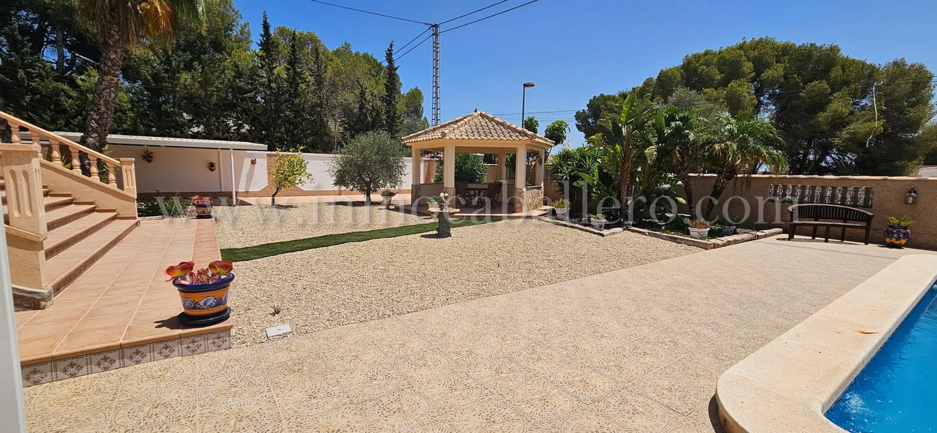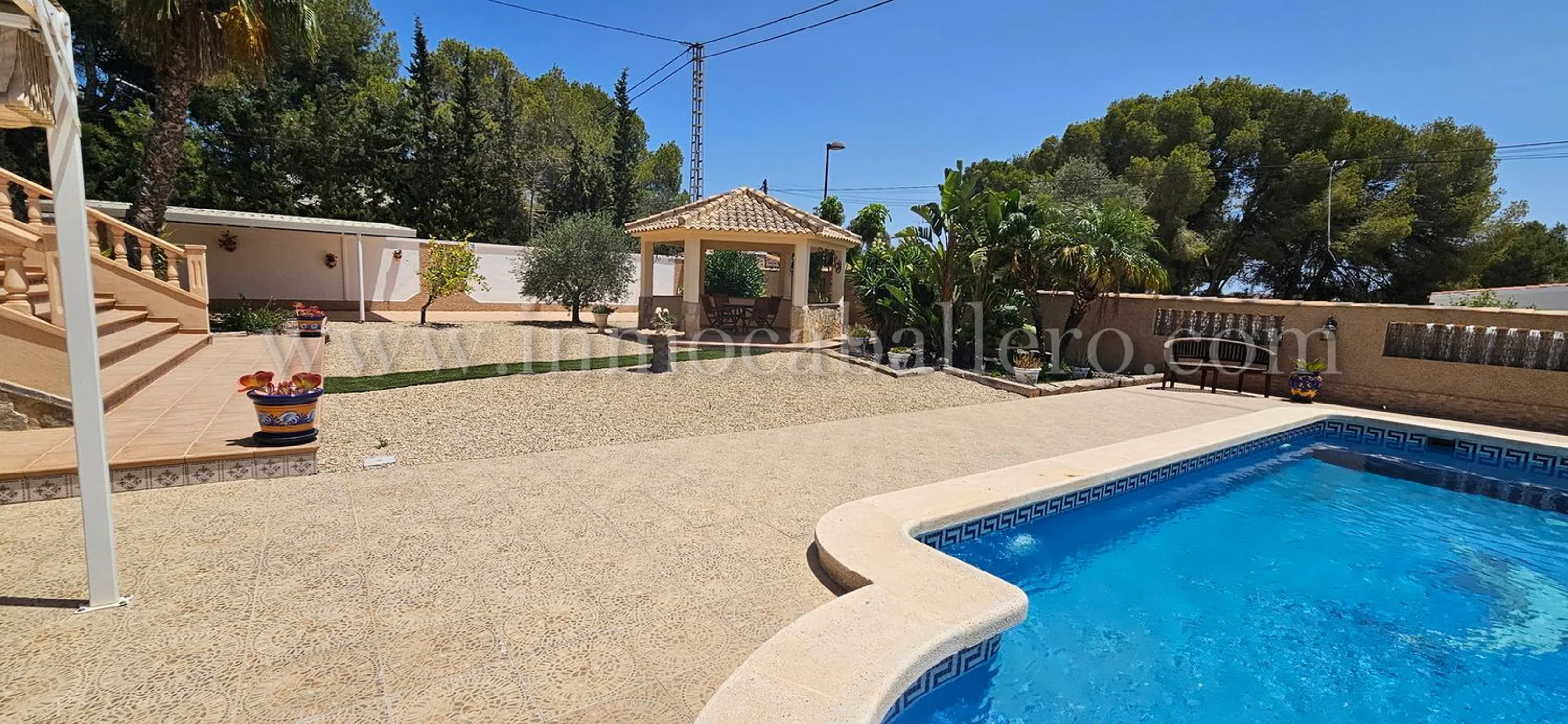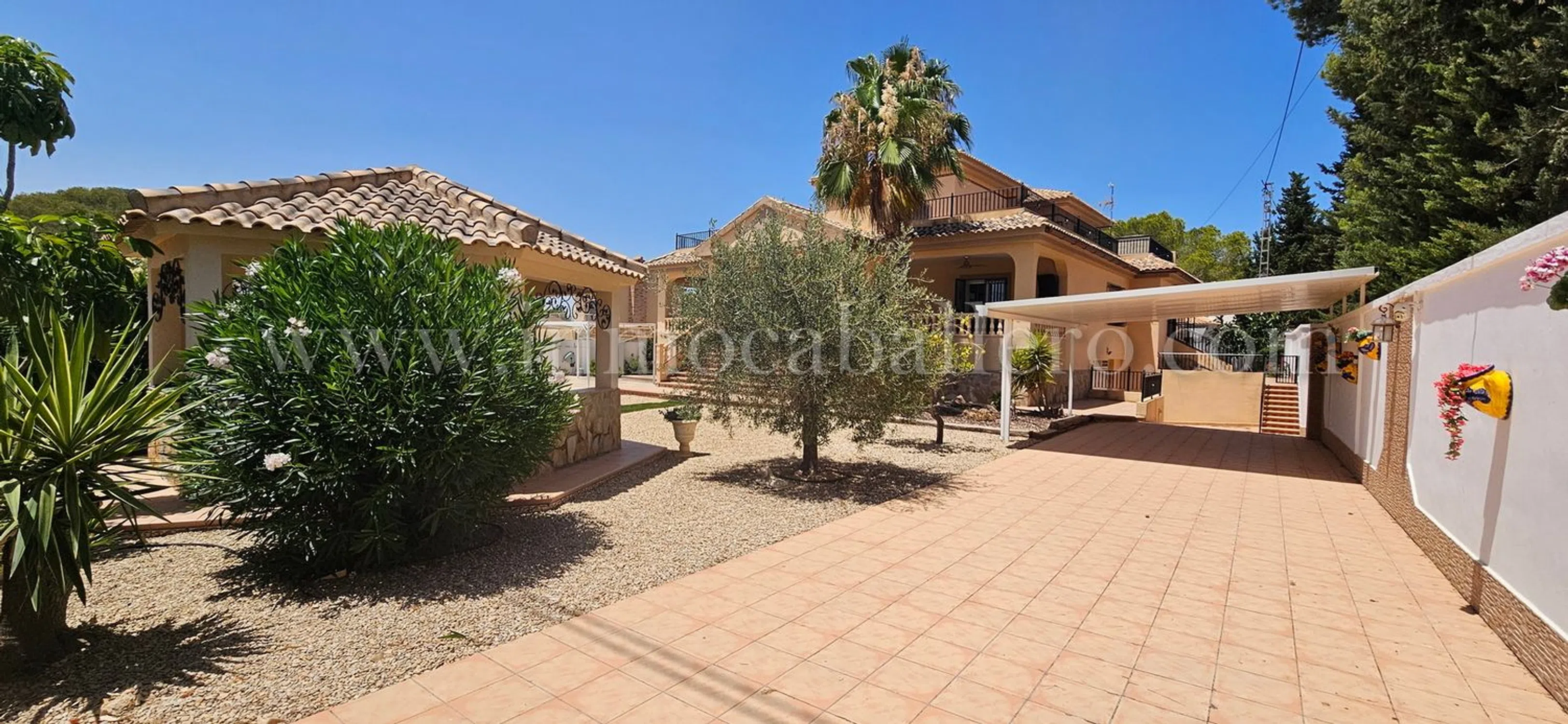 Una propiedad para aquellos que gustan de una casa con vistas abiertas, paseos y naturaleza, hay todo lo que se puede esperar de una casa de estas altas calidades, piscina privada, Aire acondicionada, calefacción central, etc. en Pinar de Campoverde Planta de entrada: Amplio recibidor con escaleras hasta el primer piso, un aseo y un pequeño trastero. A la derecha tienes un gran salón con acceso a la amplia terraza cubierta, a la izquierda del recibidor se accede al comedor, igualmente con puertas que dan a la terraza cubierta, un pequeño despacho y acceso a la gran cocina con isla y todos los electrodomésticos necesarios de primera calidad. A la derecha de la cocina encontrará un lavadero con entrada independiente desde la parte trasera de la casa. Desde la cocina también se llega a un pasillo que da al sótano y dormitorios. De vuelta al recibidor hay una puerta que da a un pasillo. Desde este pasillo se llega a dos dormitorios con armarios empotrados, un cuarto de baño y las escaleras que dan al sótano/garaje. Planta Baja/Sótano: Cuando bajamos las escaleras desde el pasillo antes mencionado, encontramos dos dormitorios con armarios empotrados, un cuarto de baño y el acceso al garaje con espacio suficiente para dos vehículos y dos habitaciones para las calderas de la calefacción central de gasóleo. Primer piso: El amplio dormitorio principal, con acceso a una enorme terraza con fantásticas vistas abiertas, mucho espacio para tomar el sol o simplemente relajarse antes de acostarse, de vuelta en el dormitorio tiene acceso a vestidor grande y a un gran baño completamente alicatado donde tiene una cabina de ducha y bañera con jacuzzi. Área: Pinar de Campoverde (a 160 metros sobre el nivel del mar) es una de las comunidades ubicadas debajo del pueblo central de Pilar de la Horadada con aproximadamente 23.000 habitantes, las otras son Mil Palmeras y Torre de la Horadada. Pinar de Campoverde tiene una infraestructura consolidada y hay multitud de bares, restaurantes, centro médico, comisaría, etc. Hermosos parques naturales con, entre otras cosas, el famoso lecho del río Seco, que tarda entre 1 y 2 horas en caminar y sale a Mil Palmeras y puede darse un refrescante chapuzón en el mar Mediterráneo. El campo de golf más cercano es Lo Romero, que está a un par de kilómetros de Pinar, un campo popular, así que concierte una cita... luego hay una treintena de campos a no más de 45 minutos en coche. Hasta Torre de la Horadada con sus 10 playas con bandera azul hay unos 10-12 km. Si no quiere conducir usted mismo, por supuesto, hay un autobús que circula regularmente. La zona es conocida por sus bonitas rutas de senderismo, tenis y proximidad a campos de golf. Campo de golf a 3 km Playa a 12 km Centros comerciales a 15 minutos Aeropuerto de Murcia 45 minutos y Alicante 50 minutos.
