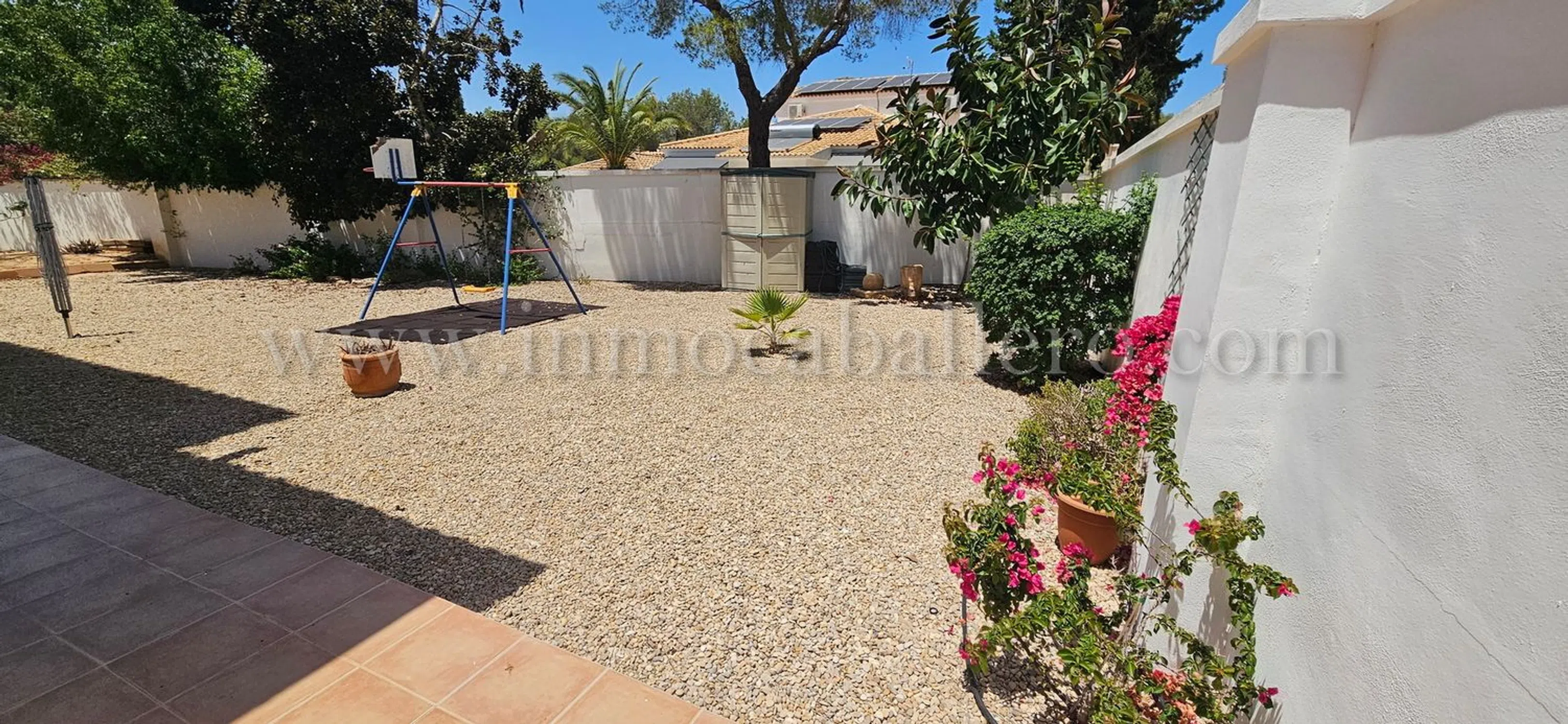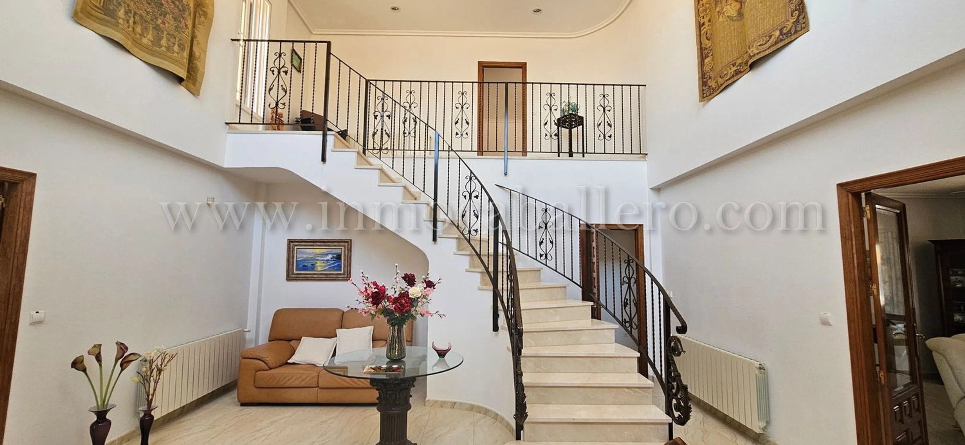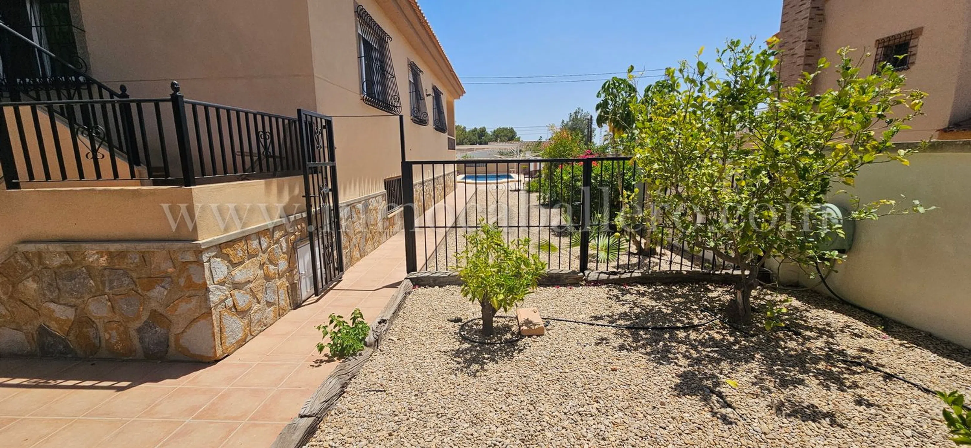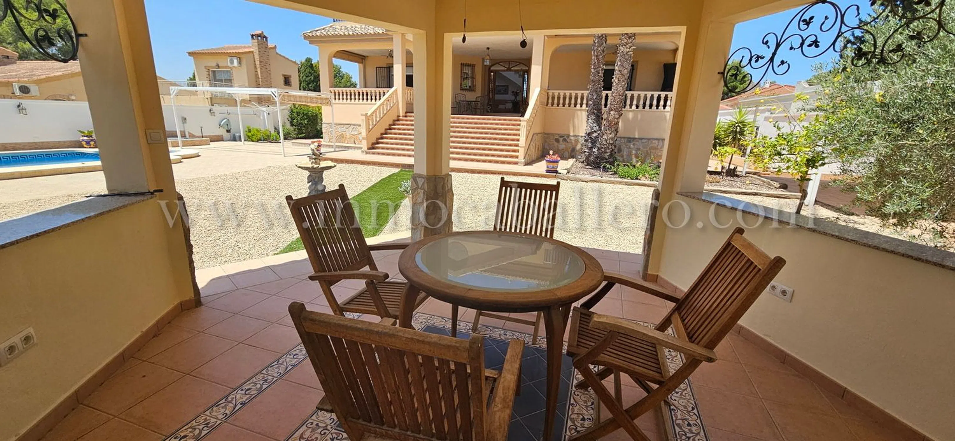 Una propiedad para aquellos que gustan de una casa con vistas abiertas, paseos y naturaleza, hay todo lo que se puede esperar de una casa de estas altas calidades, piscina privada, Aire acondicionada, calefacción central, etc. en Pinar de Campoverde Planta de entrada: Amplio recibidor con escaleras hasta el primer piso, un aseo y un pequeño trastero. A la derecha tienes un gran salón con acceso a la amplia terraza cubierta, a la izquierda del recibidor se accede al comedor, igualmente con puertas que dan a la terraza cubierta, un pequeño despacho y acceso a la gran cocina con isla y todos los electrodomésticos necesarios de primera calidad. A la derecha de la cocina encontrará un lavadero con entrada independiente desde la parte trasera de la casa. Desde la cocina también se llega a un pasillo que da al sótano y dormitorios. De vuelta al recibidor hay una puerta que da a un pasillo. Desde este pasillo se llega a dos dormitorios con armarios empotrados, un cuarto de baño y las escaleras que dan al sótano/garaje. Planta Baja/Sótano: Cuando bajamos las escaleras desde el pasillo antes mencionado, encontramos dos dormitorios con armarios empotrados, un cuarto de baño y el acceso al garaje con espacio suficiente para dos vehículos y dos habitaciones para las calderas de la calefacción central de gasóleo. Primer piso: El amplio dormitorio principal, con acceso a una enorme terraza con fantásticas vistas abiertas, mucho espacio para tomar el sol o simplemente relajarse antes de acostarse, de vuelta en el dormitorio tiene acceso a vestidor grande y a un gran baño completamente alicatado donde tiene una cabina de ducha y bañera con jacuzzi. Área: Pinar de Campoverde (a 160 metros sobre el nivel del mar) es una de las comunidades ubicadas debajo del pueblo central de Pilar de la Horadada con aproximadamente 23.000 habitantes, las otras son Mil Palmeras y Torre de la Horadada. Pinar de Campoverde tiene una infraestructura consolidada y hay multitud de bares, restaurantes, centro médico, comisaría, etc. Hermosos parques naturales con, entre otras cosas, el famoso lecho del río Seco, que tarda entre 1 y 2 horas en caminar y sale a Mil Palmeras y puede darse un refrescante chapuzón en el mar Mediterráneo. El campo de golf más cercano es Lo Romero, que está a un par de kilómetros de Pinar, un campo popular, así que concierte una cita... luego hay una treintena de campos a no más de 45 minutos en coche. Hasta Torre de la Horadada con sus 10 playas con bandera azul hay unos 10-12 km. Si no quiere conducir usted mismo, por supuesto, hay un autobús que circula regularmente. La zona es conocida por sus bonitas rutas de senderismo, tenis y proximidad a campos de golf. Campo de golf a 3 km Playa a 12 km Centros comerciales a 15 minutos Aeropuerto de Murcia 45 minutos y Alicante 50 minutos.