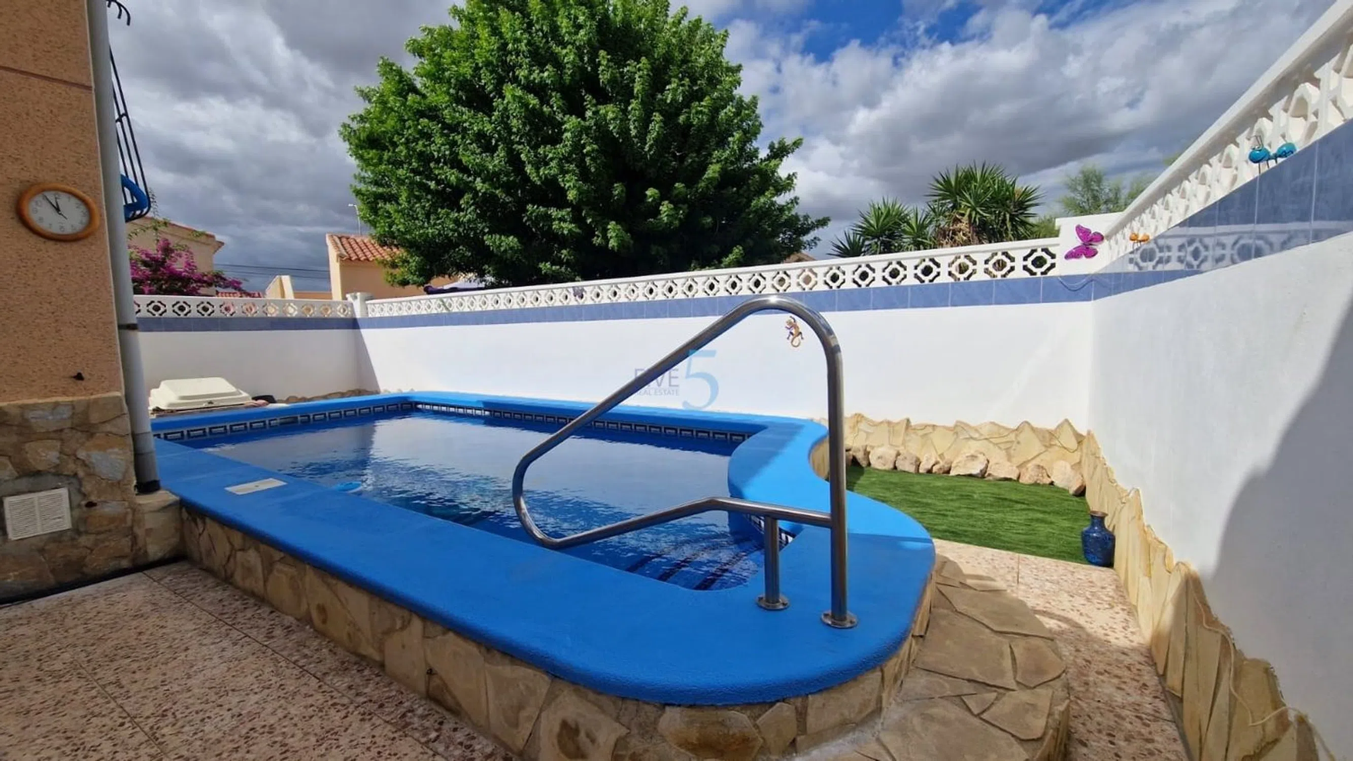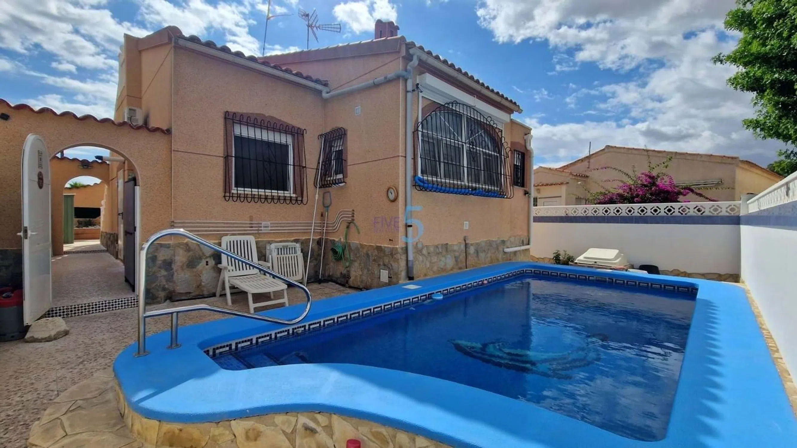 5 Real Estate se complace en comercializar esta rara villa independiente de 2 dormitorios y 1 baño en La Marina, que cuenta con una piscina privada climatizada de 7x3 y jardín. La propiedad está orientada al sureste con interiores modernos en una ubicación inmejorable a pocos metros de todos los servicios locales. Esta villa independiente en La Marina goza de una de las mejores ubicaciones de la zona, ofreciendo fácil acceso a tiendas, restaurantes y servicios, a la vez que presume de paz, privacidad y espectaculares vistas de 360° desde su espacioso solárium. La propiedad se encuentra en una extensa parcela con una piscina privada y mucho espacio para la vida al aire libre. En el interior, la casa es luminosa y acogedora. El invernadero de la entrada es perfecto para los meses de invierno, con climatización y persianas eléctricas. Desde aquí, se accede a un amplio salón con radiadores y aire acondicionado, mientras que la cocina reformada cuenta con elegantes acabados, electrodomésticos modernos y una zona de lavadero con aseo y vistas a la piscina. Grandes ventanales en toda la propiedad inundan las habitaciones de luz natural. Ambos dormitorios son dobles con armarios empotrados y aire acondicionado, y el moderno baño familiar incluye una ducha a ras de suelo. Características adicionales como doble acristalamiento, mosquiteras en todas las ventanas y puertas, radiadores en toda la casa, y aparcamiento tanto en la calle como privado añaden comodidad y conveniencia a esta impresionante villa. Una maravillosa casa en una ubicación perfecta, ideal para vivir todo el año o como refugio de vacaciones. 5 Real Estate es la agencia inmobiliaria internacional de tarifa fija y servicio completo de más rápido crecimiento en España, con numerosas oficinas en el norte y el sur de la Costa Blanca, así como en la región de Murcia. Estamos comprometidos a proporcionar un servicio transparente y de primera clase a todos nuestros clientes, ya sean compradores o vendedores. Desde el momento en que se ponga en contacto con nosotros por primera vez, se dará cuenta de la diferencia que ofrecemos y promovemos como estándar. Puede estar seguro de que está tratando con profesionales eficientes y fiables con muchos años de experiencia en el sector inmobiliario español. En 5 Real Estate, sólo vendemos propiedades que están directamente listadas con nosotros mismos, lo que significa que conocemos personalmente a cada uno de los vendedores, sus casas y las zonas en las que se encuentran. Dada nuestra extensa cartera de propiedades listadas directamente, estamos seguros de que podemos encontrar la propiedad adecuada para satisfacer sus necesidades. Así que, haga una consulta hoy mismo y descubra por qué somos tan diferentes y por qué nos estamos convirtiendo en la agencia preferida tanto para compradores como para vendedores.