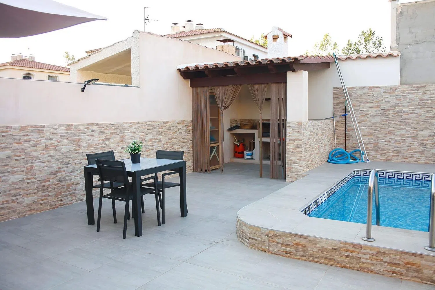Al subir a la planta alta, te recibirán tres dormitorios, dos de ellos dobles (uno con baño privado) y un baño adicional, todos diseñados para garantizar tu descanso y privacidad. El exterior destaca por su porche acogedor de 30.52 m², un aparcamiento cubierto, una zona de barbacoa para esas reuniones memorables y una piscina de 28 m², que te prometen días inolvidables bajo el sol. Además, un trastero ofrece el espacio perfecto para mantener todo en orden.