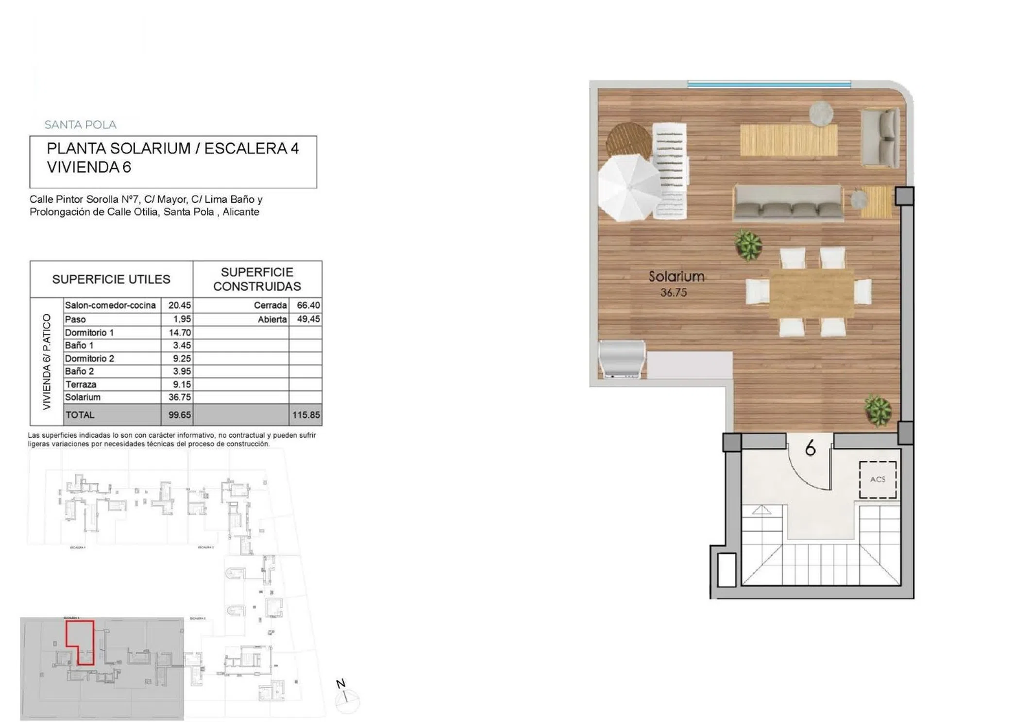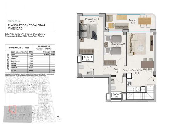 Descubre este espectacular ático ubicado en la exclusiva zona de Eroski, Santa Pola. Con un precio atractivo de 305,000 euros y una generosa superficie construida de 115.85 m² (superficie útil: 99.65 m²), esta propiedad es perfecta para quienes buscan comodidad y estilo moderno. El inmueble cuenta con dos amplias habitaciones dobles y dos baños completos que garantizan privacidad e intimidad para todos sus habitantes. El impresionante espacio exterior se complementa con una terraza de 9,15 m² ideal para disfrutar del clima mediterráneo o simplemente relajarse al aire libre mientras contempla las hermosas vistas que ofrece la ubicación. Con orientación norte, garantiza luminosidad durante todo el día sin perder frescura por las noches calurosas del verano Mediterráneo. Además, su proximidad al mar, a unos 1.500 metros, permite disfrutar fácilmente tanto del sol como de actividades acuáticas. Se puede adquirir, a parte, un trastero y una plaza de garaje. Hay disponibles diferentes tamaños, según las necesidades de cada uno. Entre los lujosos extras incluidos en esta oferta destacan: piscina comunitaria donde podrá refrescarse; puerta blindada que brinda seguridad adicional; acceso cercano a autobuses facilitando así desplazamientos hacia otras zonas; centros comerciales cercanos ofreciendo variedad comercial; colegios dentro del área, favoreciendo educación accesible para familias jóvenes; vistas panorámicas inigualables desde cualquier rincón privilegiado, haciendo también hincapié en zonas infantiles ideales si busca un entorno familiar seguro. No pierda la oportunidad única adquiriendo este magnífico ático que combina confort contemporáneo con excelente localización.