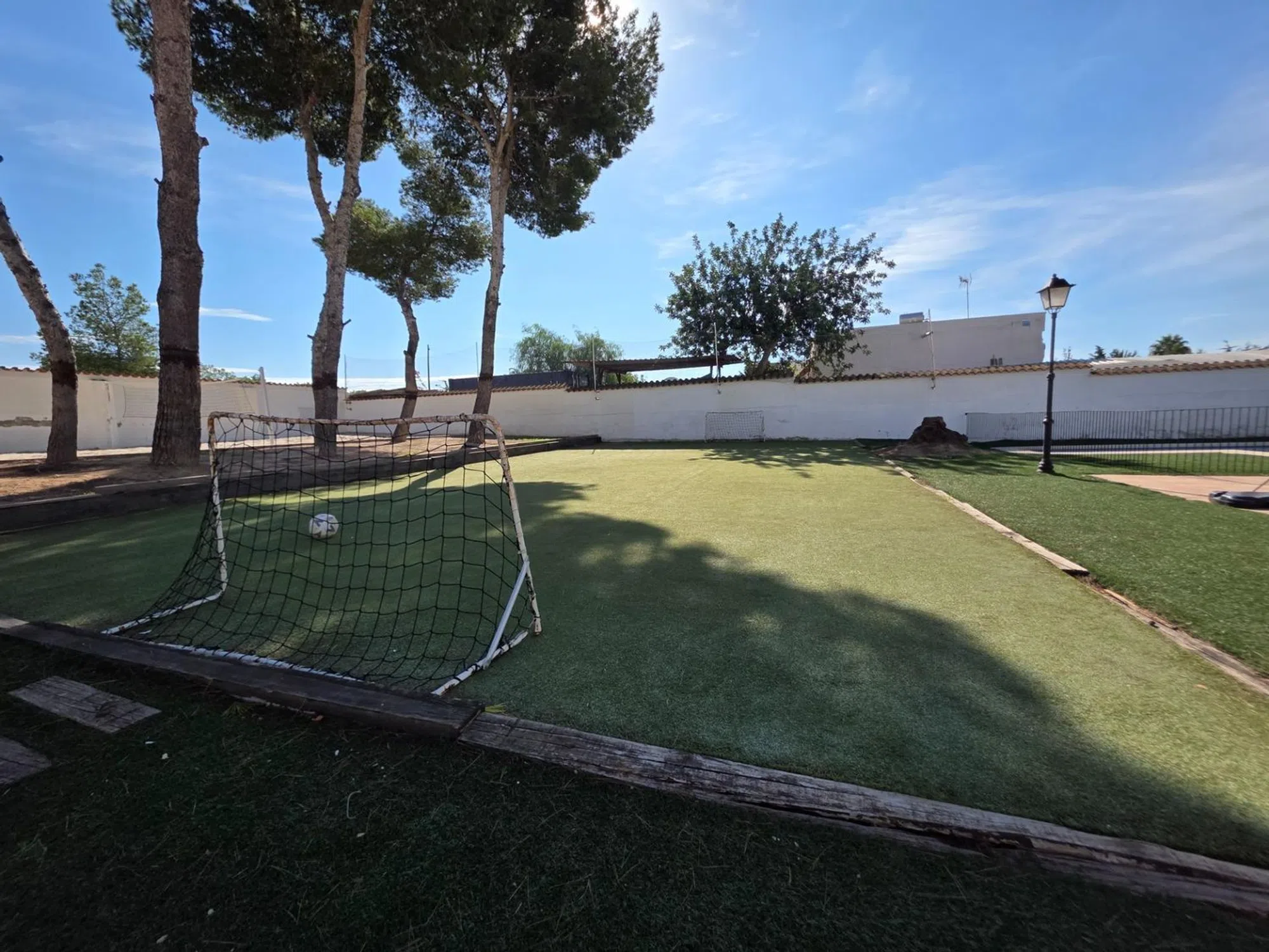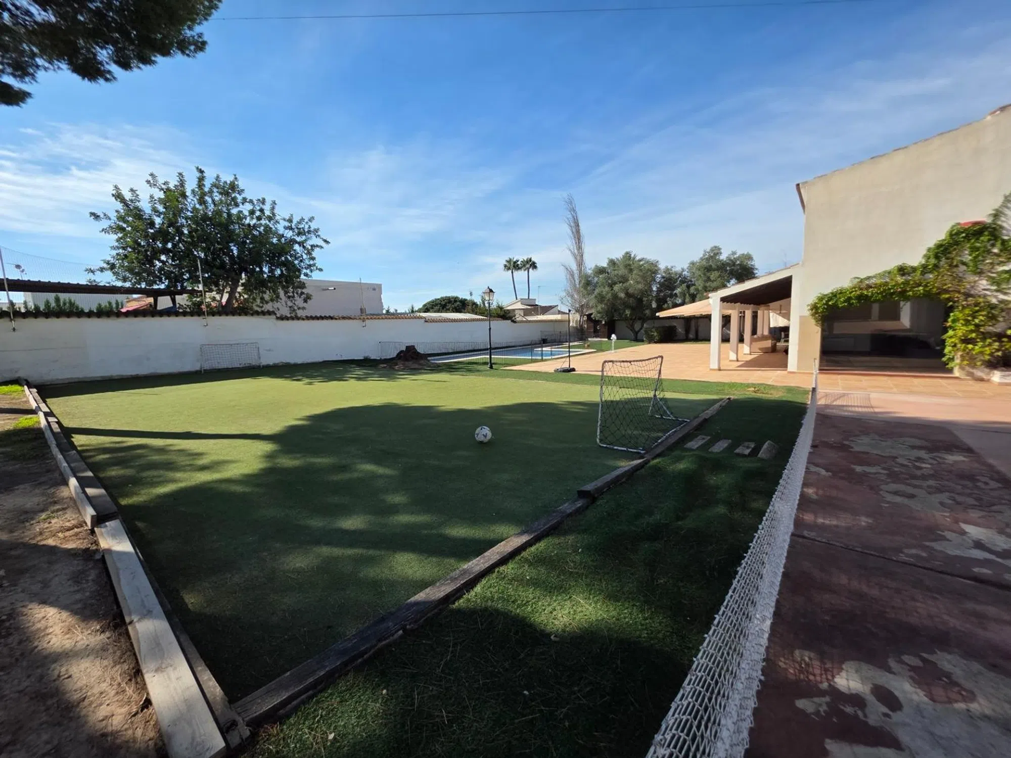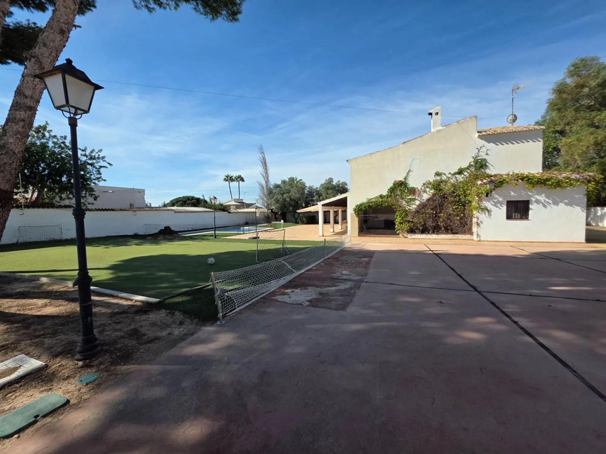 En Arena Inmobiliaria te presentamos este chalet independiente en Pueblo Levantino (Santa Pola), en la zona alta de la urbanización. Una vivienda de una sola planta con 406 m² construidos sobre una parcela cercana a 2.000 m², orientada al sureste. Recibe luz todo el día y la brisa de la sierra del faro. Lista para entrar. La casa distribuye 4 dormitorios dobles con vistas al jardín y 3 baños completos. El salón, amplio y con chimenea, se abre al exterior mediante grandes ventanales. La cocina está equipada e incorpora despensa. Acabados con carpintería de madera, suelos de gres y parquet, y calefacción individual por estancias. El interior está adaptado para personas con movilidad reducida. La parcela concentra los espacios de ocio y servicio: piscina privada y vallada con calle de 15 m y zona de 3 × 5 m de poca profundidad, sauna exterior con vestuarios y duchas, pista de futbito con césped artificial. Completa el conjunto una terraza cubierta, solárium, almacén de unos 50 m², aparcamiento en superficie con puertas automáticas, zonas arboladas de sombra y área de juegos. Como valor añadido, la finca permite segregar en dos parcelas edificables, lo que abre la puerta a construir un segundo chalet o ampliar instalaciones. Dispone de alumbrado y alcantarillado. La ubicación es práctica: a 5 minutos de las playas de Santa Pola, 15 minutos de Alicante y 20 de Elche, con colegios, comercios y centros comerciales a poca distancia. Una vivienda pensada para vivir cómodamente todo el año, en una zona que permite desconectar sin alejarse de nada.