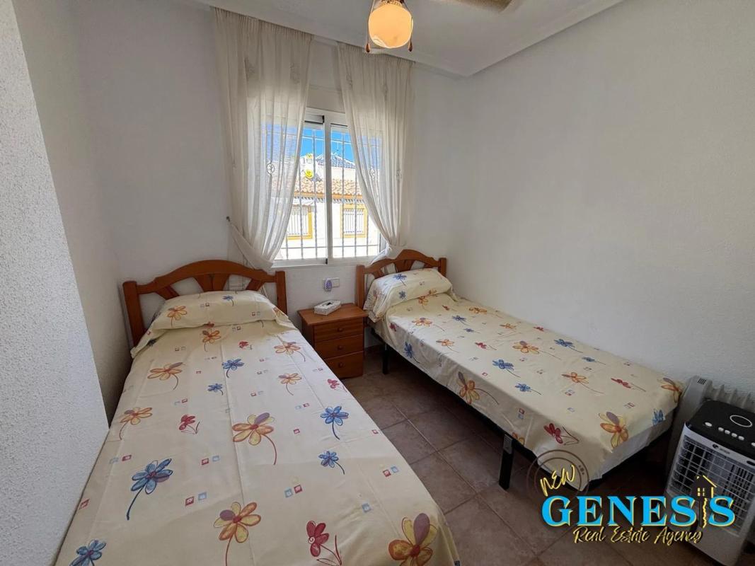 Casa adosada en la zona de Aguas Nuevas de Torrevieja. 2 dormitorios, 1 baño completo y 1 aseo en la planta baja. Vivienda esquinera con terrazas delantera y trasera. Vistas a la piscina...