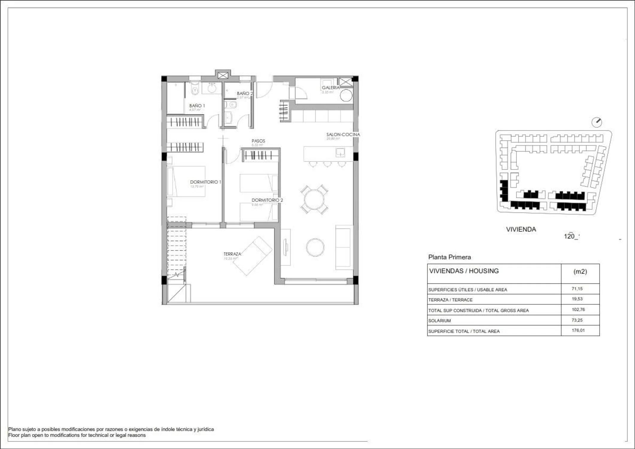 Apartamento en primera planta, de 2 dormitorios y 2 baños, con 103m2 construidos con una terraza de 20m2 y solarium de 73m2. Incluye plaza de garaje subterránea. Se encuentra en una tranquila zona residencial de Torrevieja, a solo 250 metras de la Playa de la Veleta La zona de todos los servicios públicos necesarios, ocio, bares, restaurantes, comercios. supermercados, correos, bancos, ambulatorios de la Seguridad Social, clínicas privadas, escuelas. A solo 10 minutos en coche hay dos impresionantes centros comerciales al aire libre Gracias al clima mediterráneo es posible disfrutar de muchas actividades al aire libre, como el golf, el tenis, el pádel y deportes acu? ticos en las numerosas playas con bandera azul. Las áreas comunitarias ofrecen una sensación mediterránea, con jardines que fluyen dentro de tu salón a través de la terraza y rodean una gran piscina para adultos y niños Las zonas ajardinadas se compones de árboles, palmeras y plantas locales, obteniendo un jardín sostenible con un reducido consumo de agua También hay equipos de gimnasia al aire libre, disponible para los residentes.