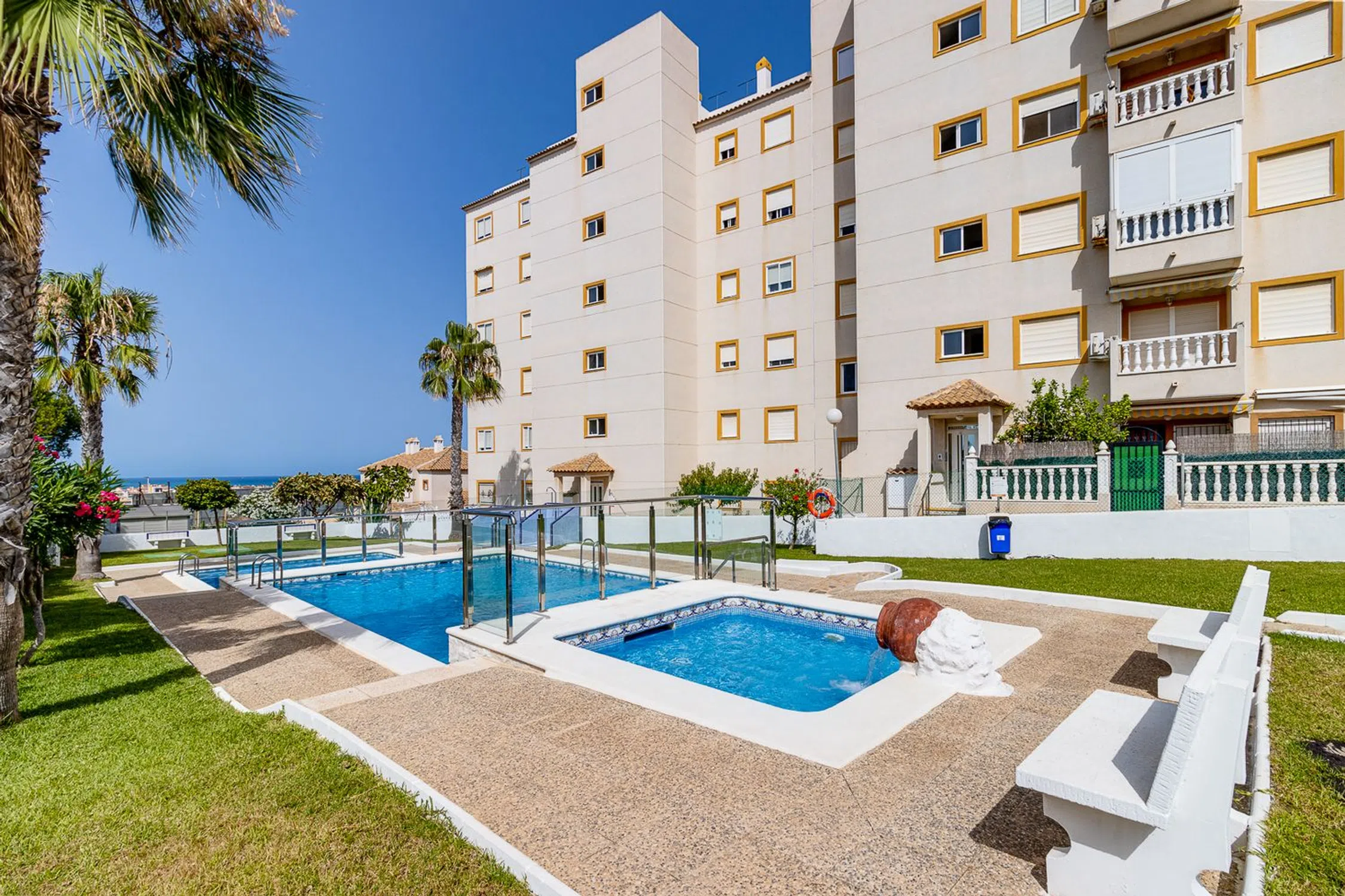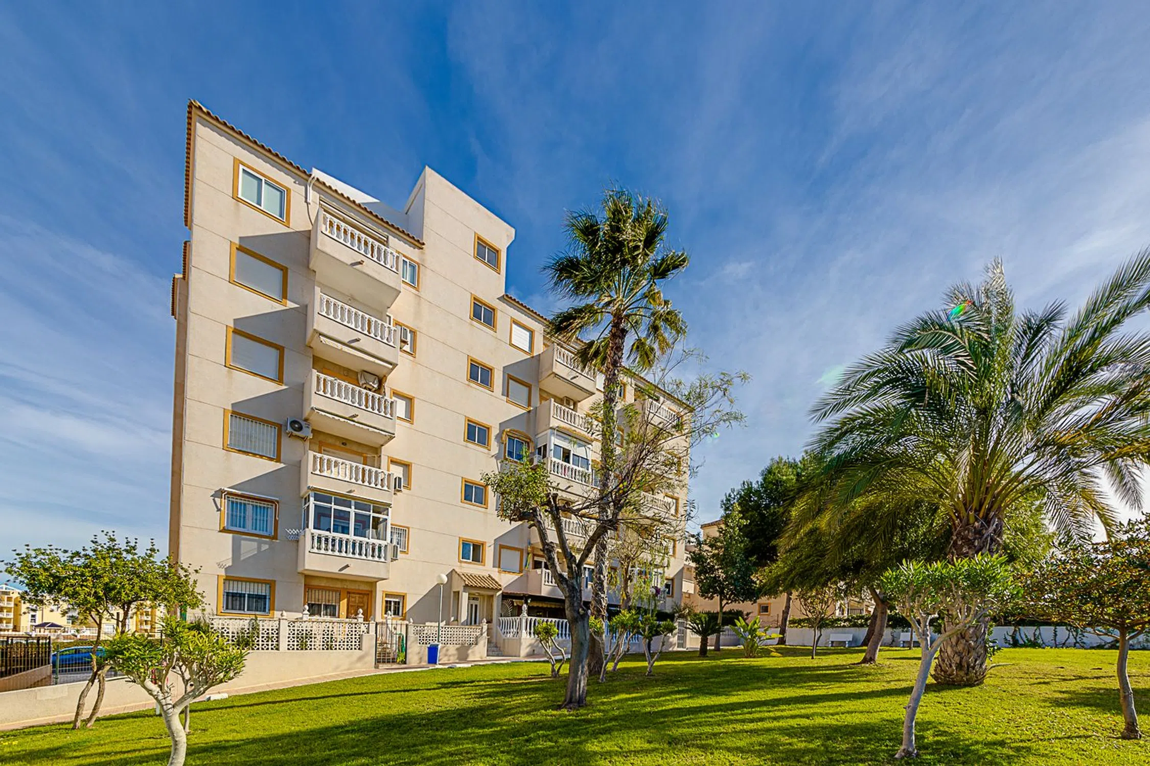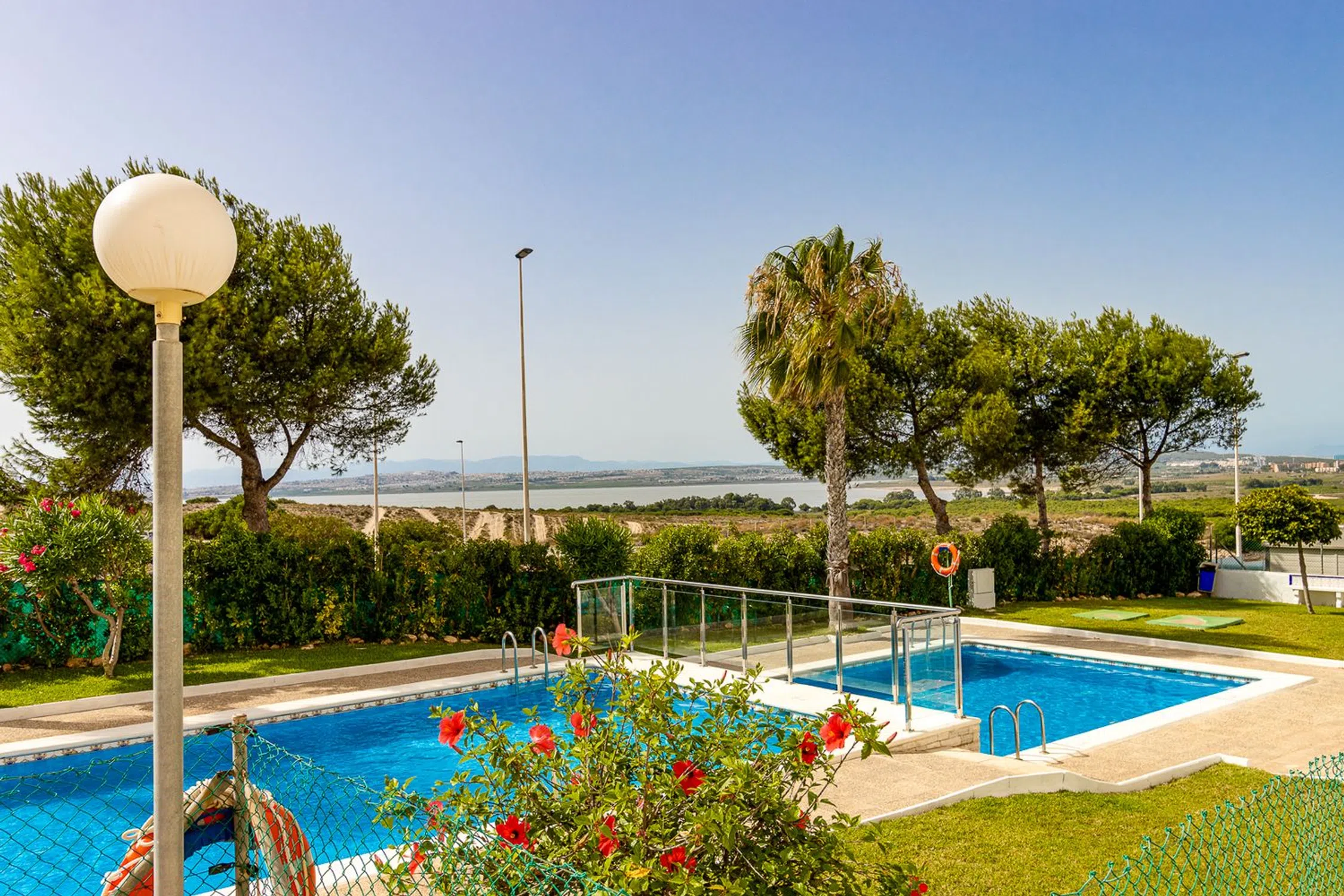 Este bonito y práctico piso está situado a unos quince minutos en coche al centro de Torrevieja, en un residencial tranquilo, frente al parque Aromático, rodeado de cuidados jardines y una gran piscina comunitaria. Cuenta con una ubicación privilegiada, cerca de la hermosa y extensa playa de La Mata, y con buena conexión por transporte urbano al centro de la ciudad. La propiedad, decorada en un estilo actual y moderno, cuenta con un acogedor salón con aire acondicionado, dos dormitorios, un baño completo y una cocina independiente. Está en perfecto estado, se vende amueblado y equipado. Este piso, situado en la quinta y última planta del edificio, cuenta con amplias vistas abiertas, y su orientación oeste, garantiza luz natural todo el día, y permite disfrutar de un maravilloso atardecer desde su amplia terraza. La terraza tiene unas vistas fantásticas hacia la Laguna de Torrevieja, y desde allí también se alcanza a ver el mar. Este piso es ideal tanto para vivir todo el año, como para disfrutar de unas vacaciones inolvidables. No pierdas la oportunidad de hacer de esta vivienda tu hogar, o tu próxima inversión junto al mar.