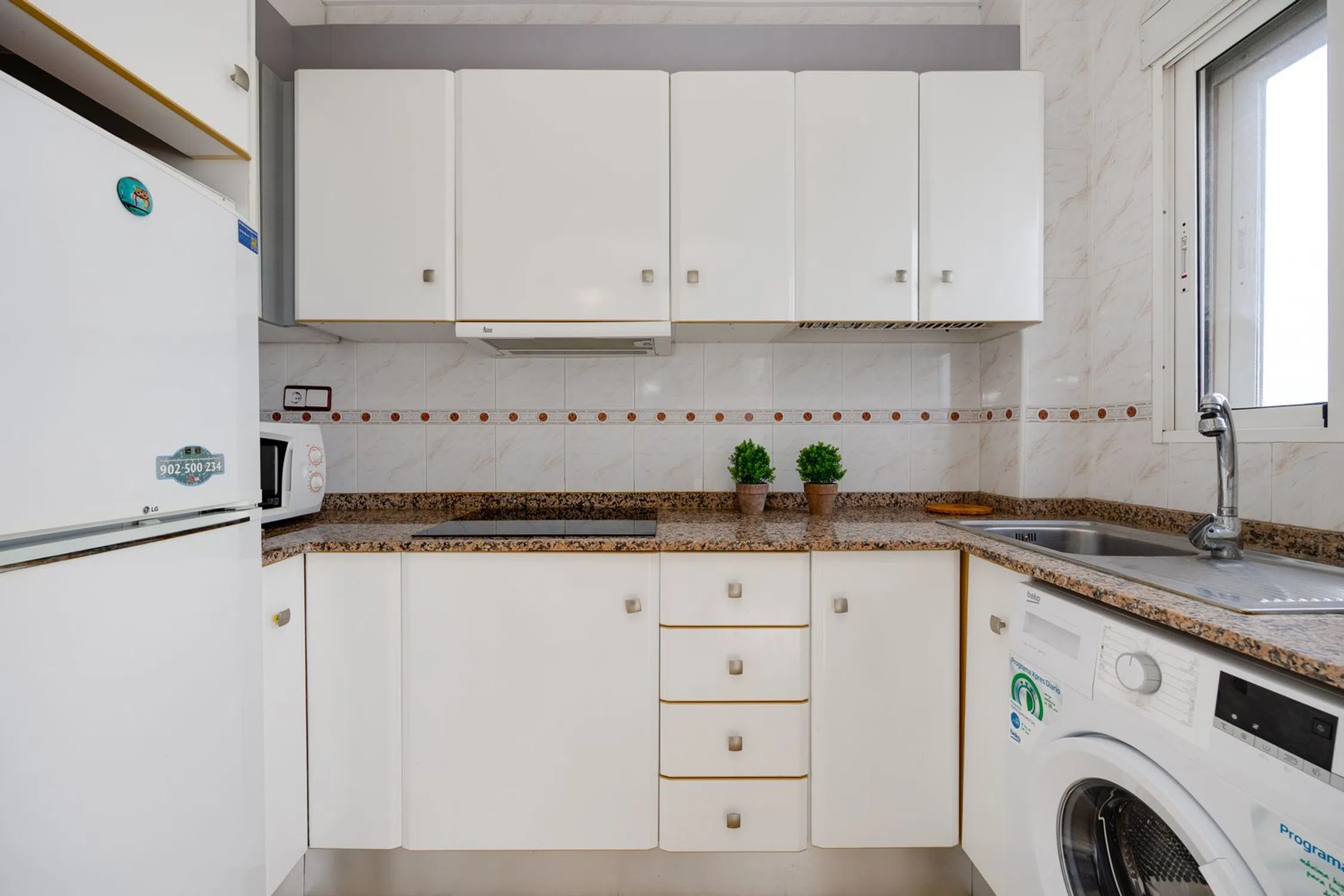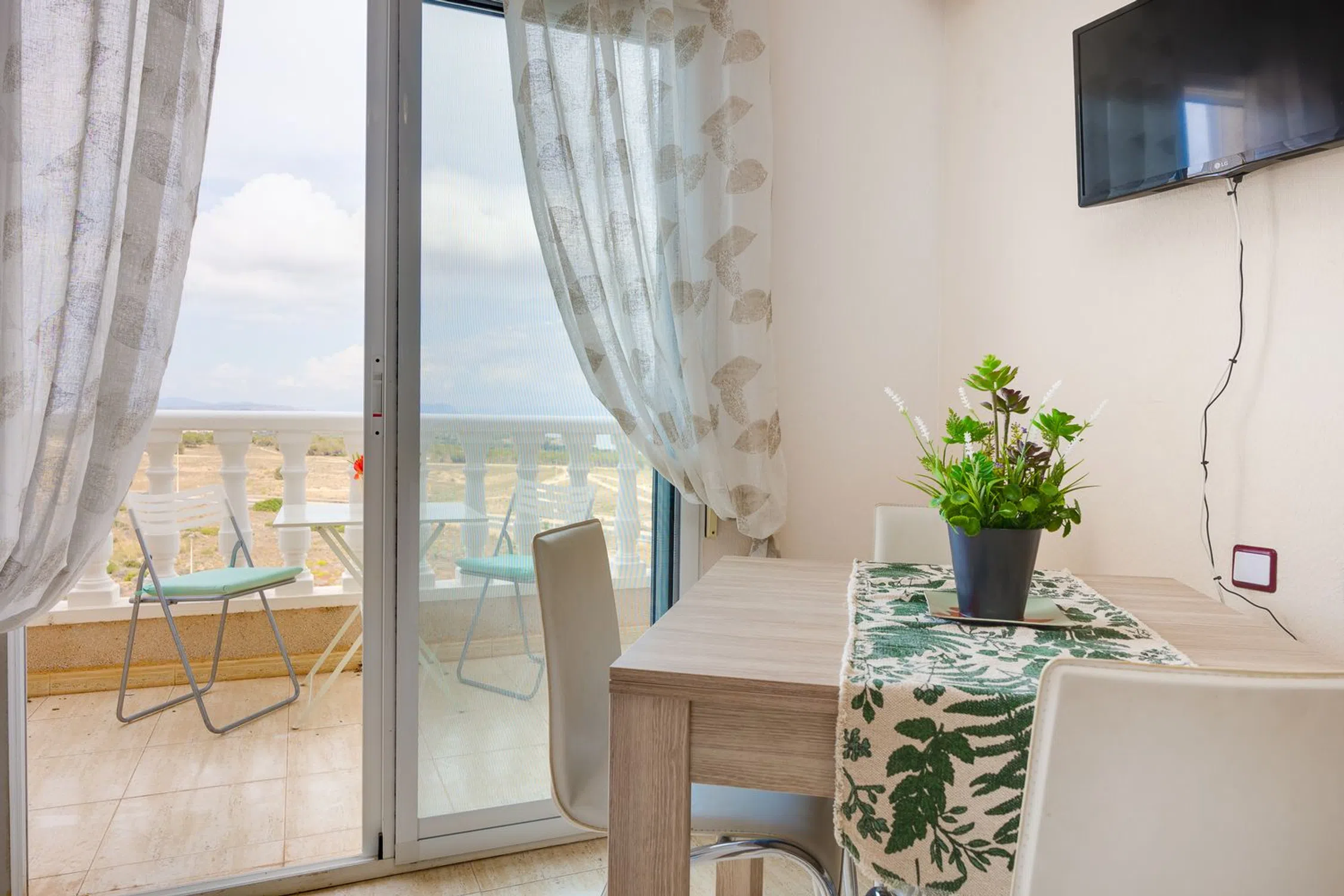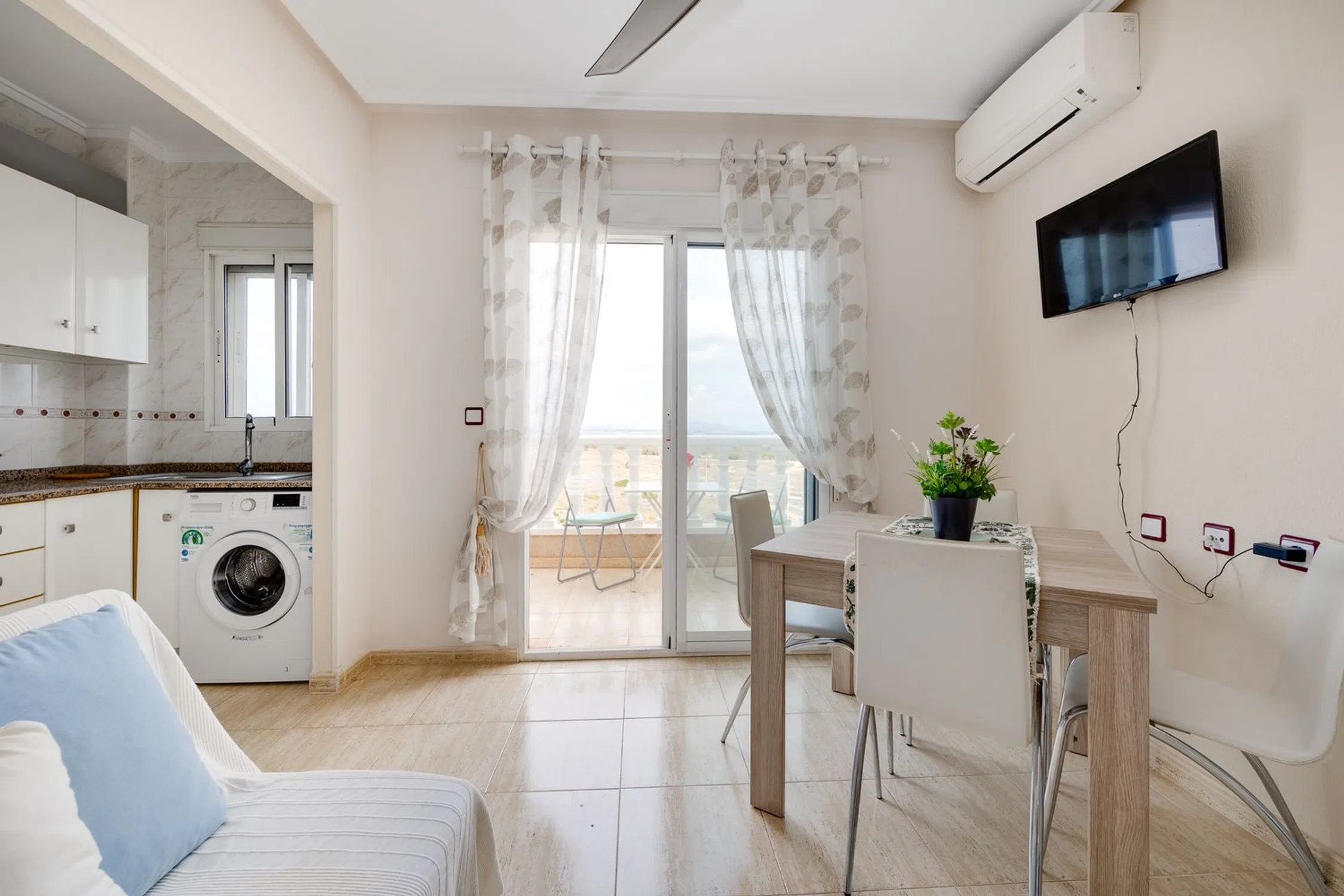 Este bonito y práctico piso está situado a unos quince minutos en coche al centro de Torrevieja, en un residencial tranquilo, frente al parque Aromático, rodeado de cuidados jardines y una gran piscina comunitaria. Cuenta con una ubicación privilegiada, cerca de la hermosa y extensa playa de La Mata, y con buena conexión por transporte urbano al centro de la ciudad. La propiedad, decorada en un estilo actual y moderno, cuenta con un acogedor salón con aire acondicionado, dos dormitorios, un baño completo y una cocina independiente. Está en perfecto estado, se vende amueblado y equipado. Este piso, situado en la quinta y última planta del edificio, cuenta con amplias vistas abiertas, y su orientación oeste, garantiza luz natural todo el día, y permite disfrutar de un maravilloso atardecer desde su amplia terraza. La terraza tiene unas vistas fantásticas hacia la Laguna de Torrevieja, y desde allí también se alcanza a ver el mar. Este piso es ideal tanto para vivir todo el año, como para disfrutar de unas vacaciones inolvidables. No pierdas la oportunidad de hacer de esta vivienda tu hogar, o tu próxima inversión junto al mar.